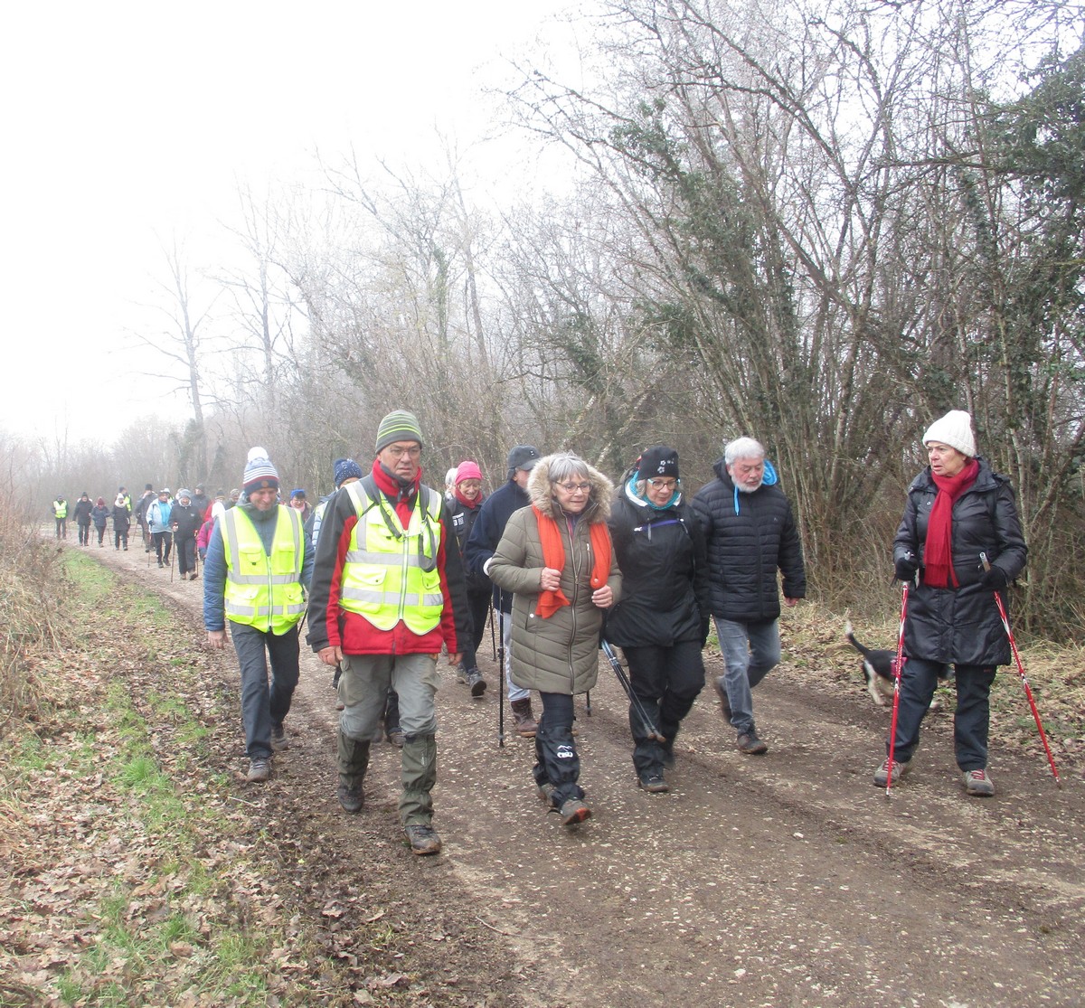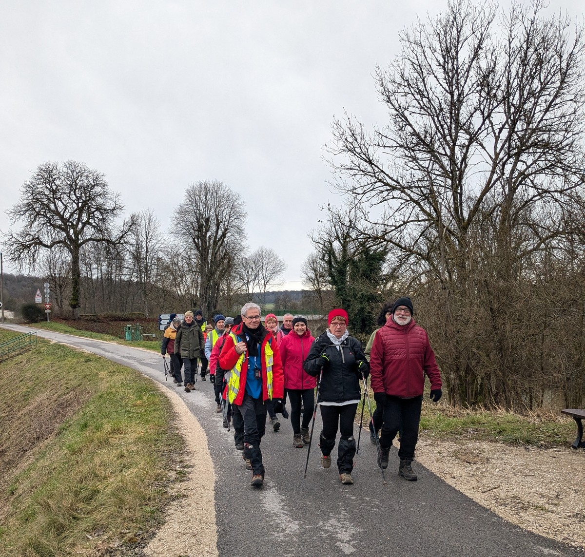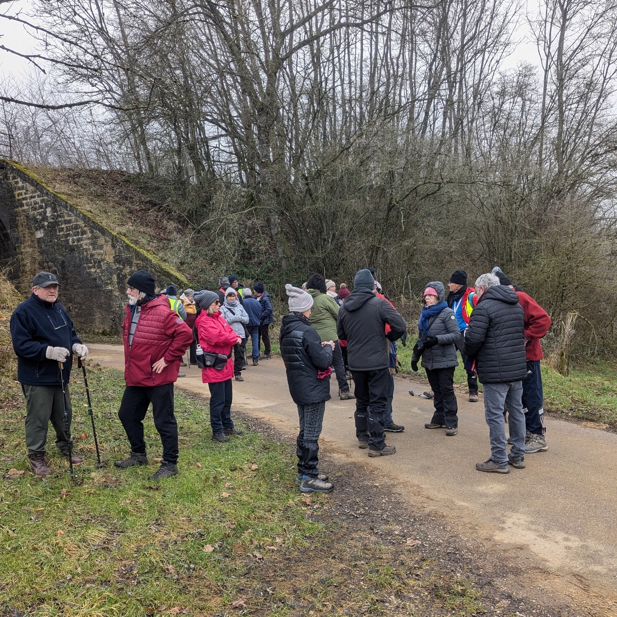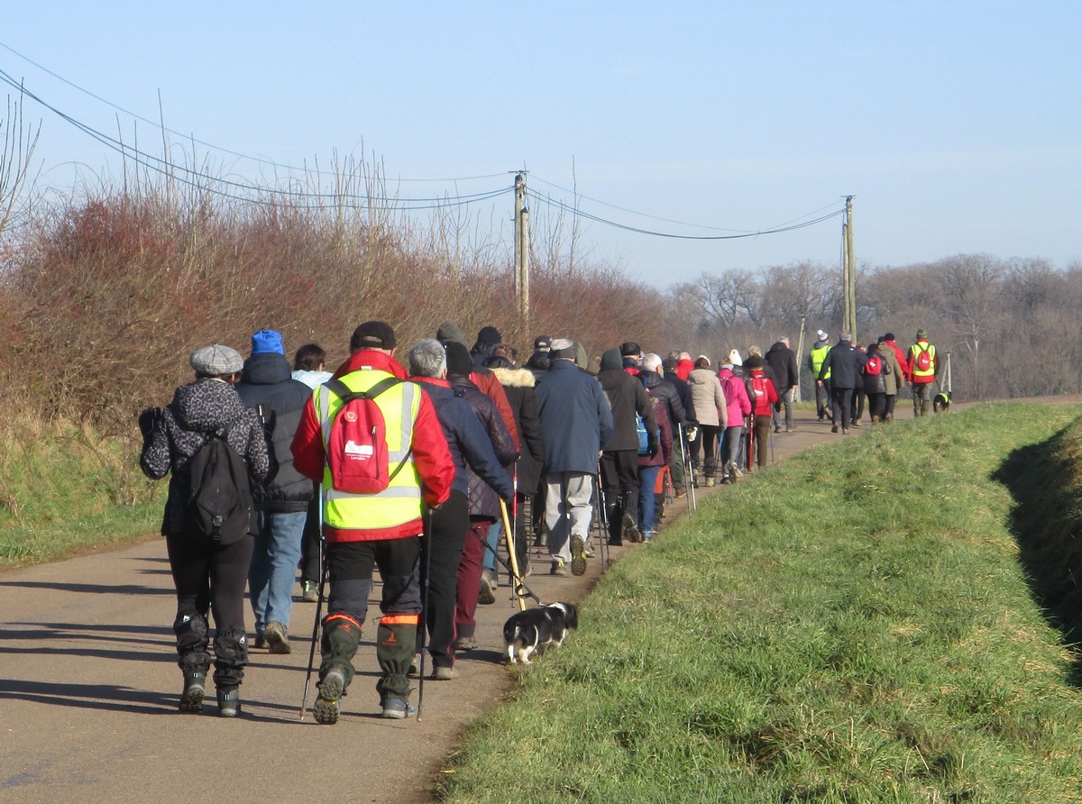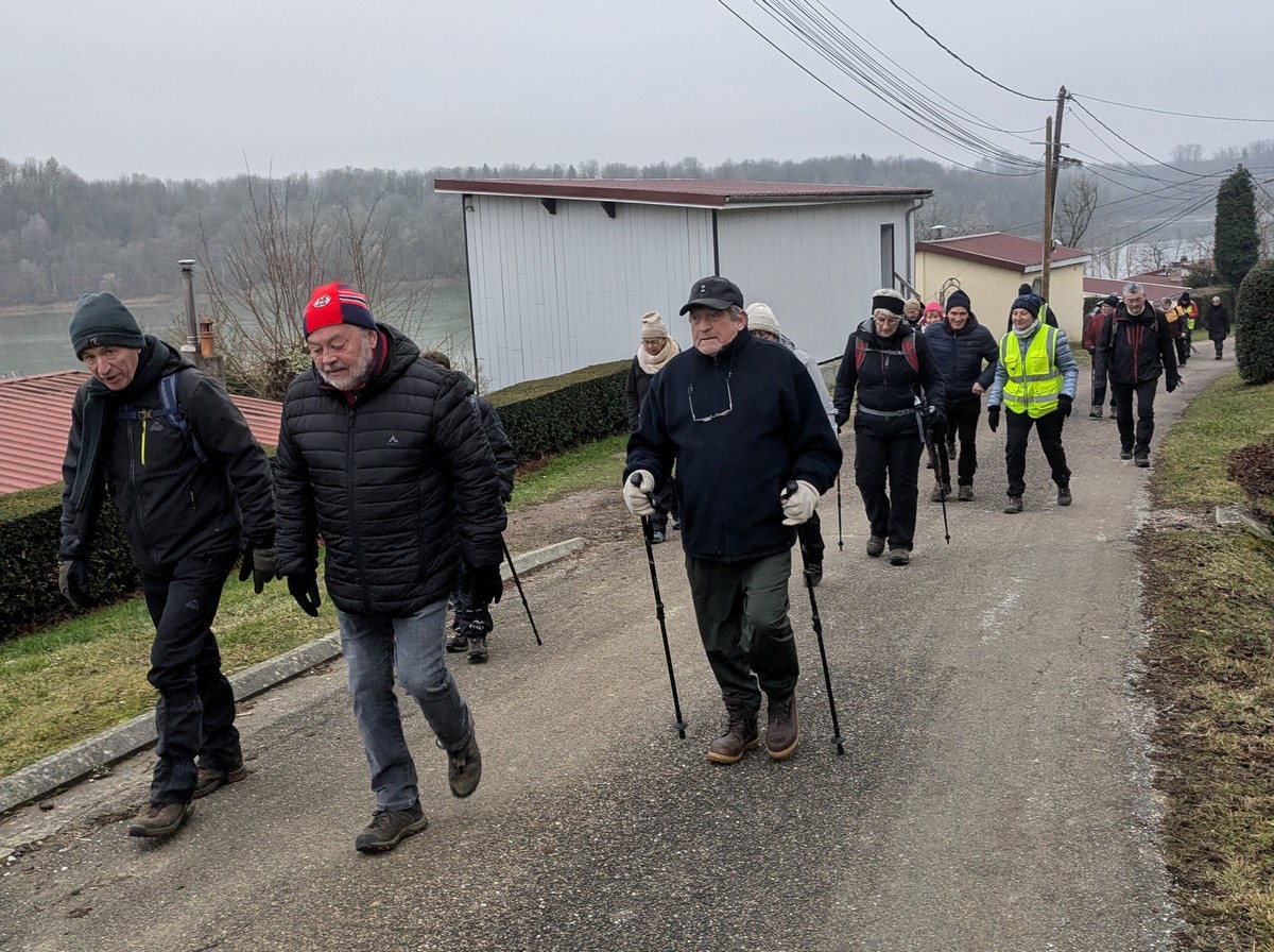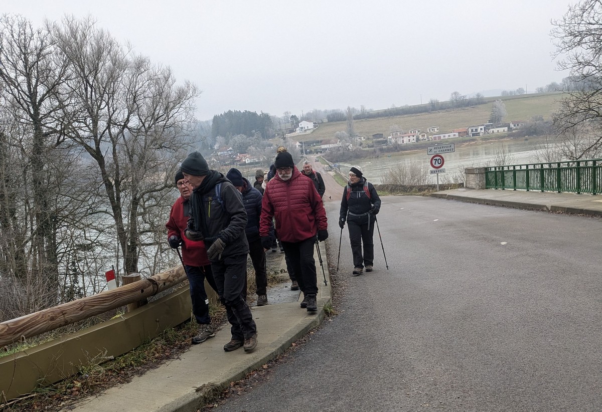 C’est parti pour le deuxième vendredi de l’année 2025, neuf kilomètres autour du lac de Charmes. Nous sommes une trentaine de randonneurs au départ de la place de Changey en direction de la D 54 qui traverse la digue sous un ciel brumeux. Après avoir marché dans le petit sentier boisé, nous traversons la passerelle de la baie de Champigny pour bifurquer à droite, de façon à rejoindre un petit chemin goudronné pas loin de la station d’épuration. Ensuite c’est reparti toujours tout droit, puis la pause s’impose ; à notre grande surprise une petite dame bien sympathique du groupe nous offre des gaufres sèches accompagnées de papillotes : « ça fait du bien ! ». Arrivés à Charmes nous longeons la digue : pose photos du groupe ; un petit gars de Chaumont a voulu me prendre en photo avec le groupe : « merci mon ami ! ». Nous repartons ensuite en direction de l’arrivée en faisant un détour en dessous de Changey.