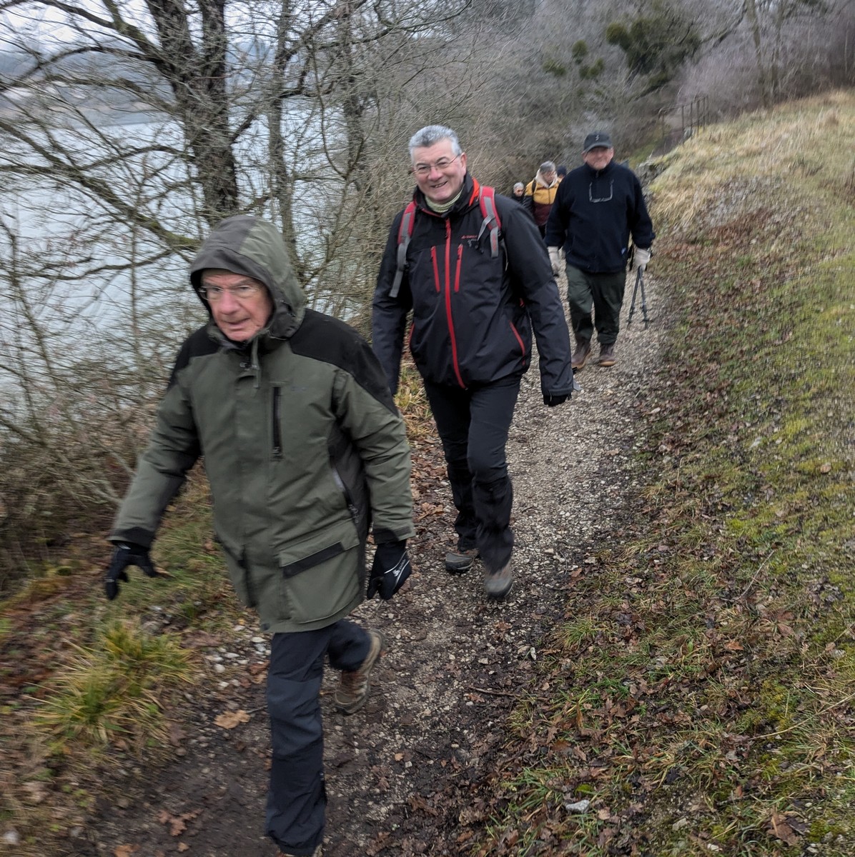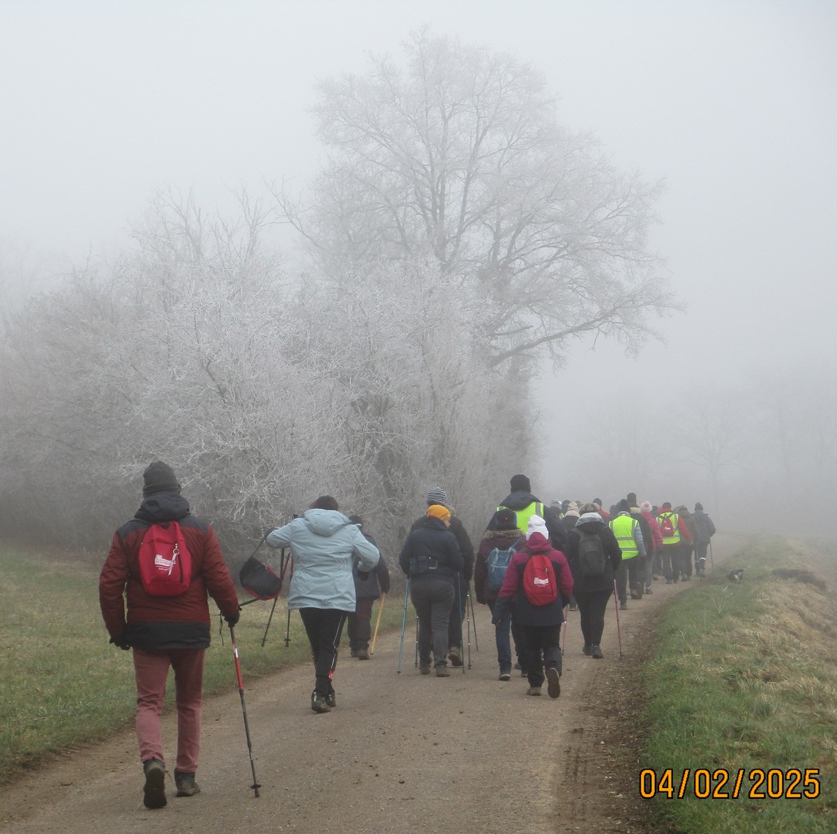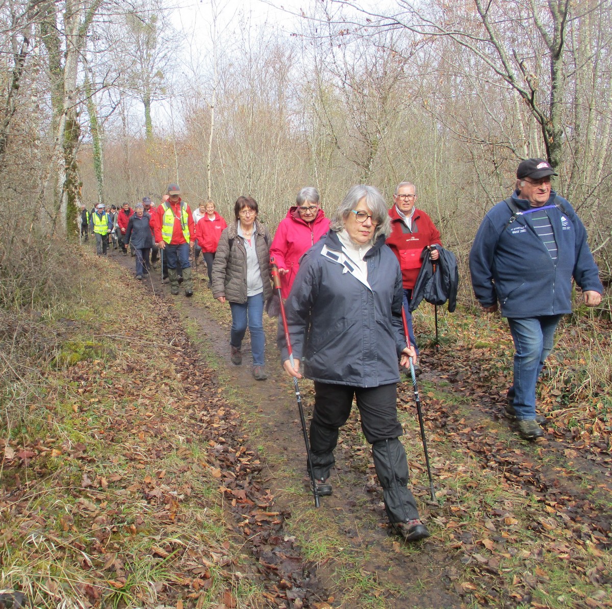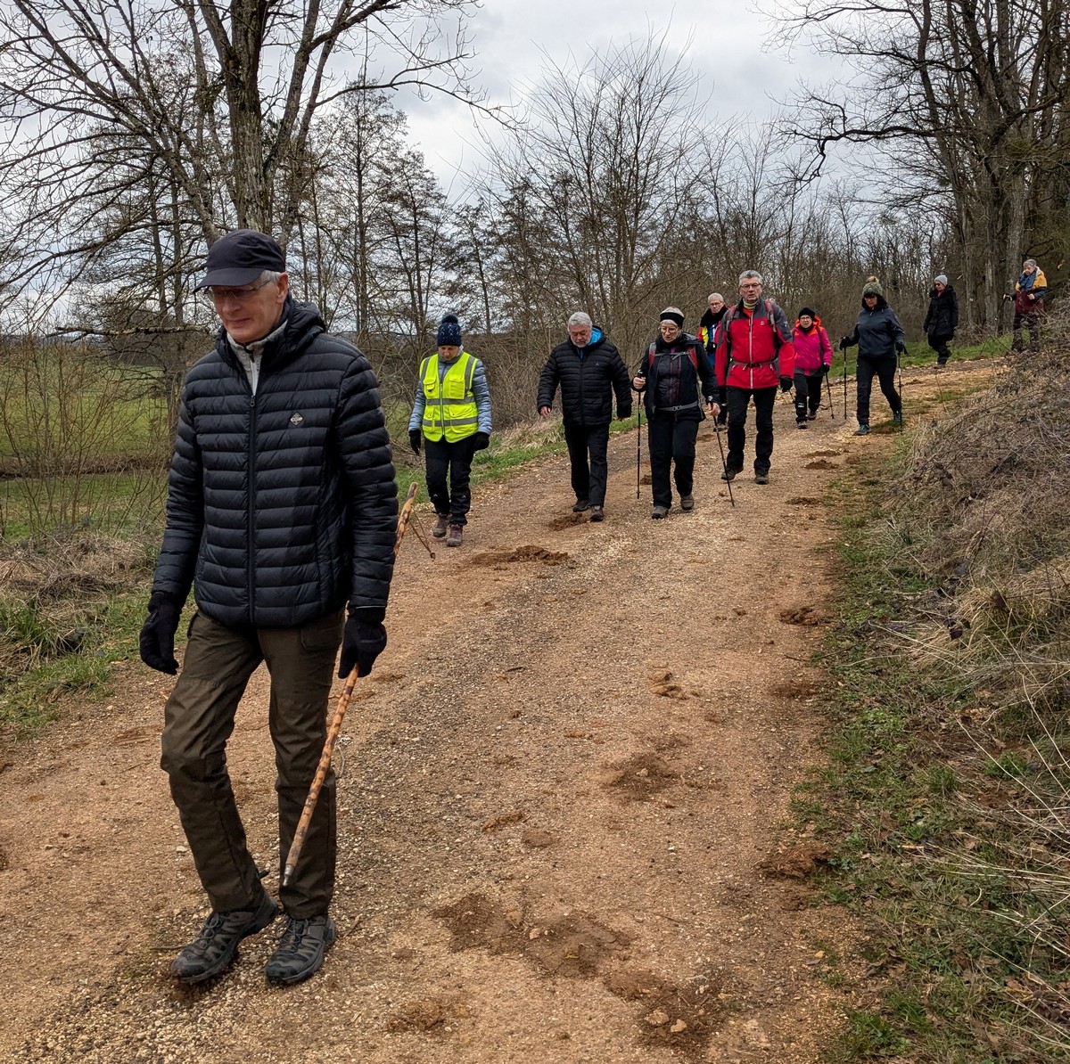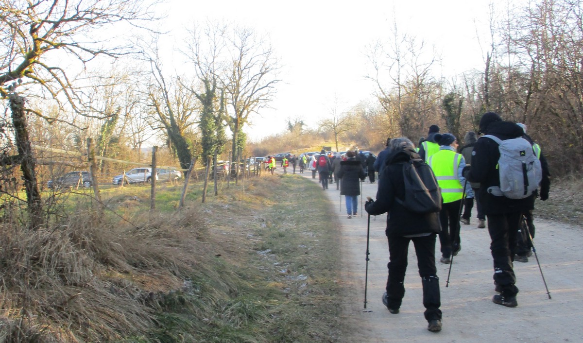 C’est parti pour le deuxième vendredi de l’année 2025, neuf kilomètres autour du lac de Charmes. Nous sommes une trentaine de randonneurs au départ de la place de Changey en direction de la D 54 qui traverse la digue sous un ciel brumeux. Après avoir marché dans le petit sentier boisé, nous traversons la passerelle de la baie de Champigny pour bifurquer à droite, de façon à rejoindre un petit chemin goudronné pas loin de la station d’épuration. Ensuite c’est reparti toujours tout droit, puis la pause s’impose ; à notre grande surprise une petite dame bien sympathique du groupe nous offre des gaufres sèches accompagnées de papillotes : « ça fait du bien ! ». Arrivés à Charmes nous longeons la digue : pose photos du groupe ; un petit gars de Chaumont a voulu me prendre en photo avec le groupe : « merci mon ami ! ». Nous repartons ensuite en direction de l’arrivée en faisant un détour en dessous de Changey.