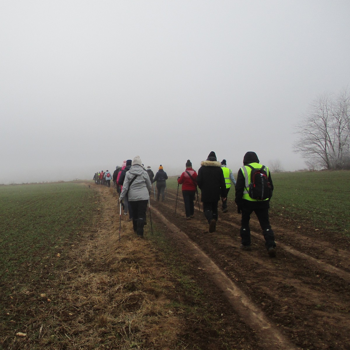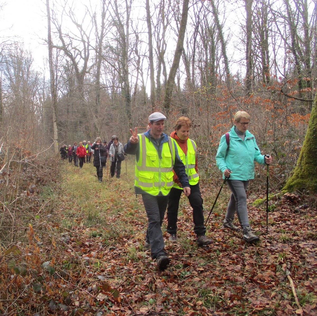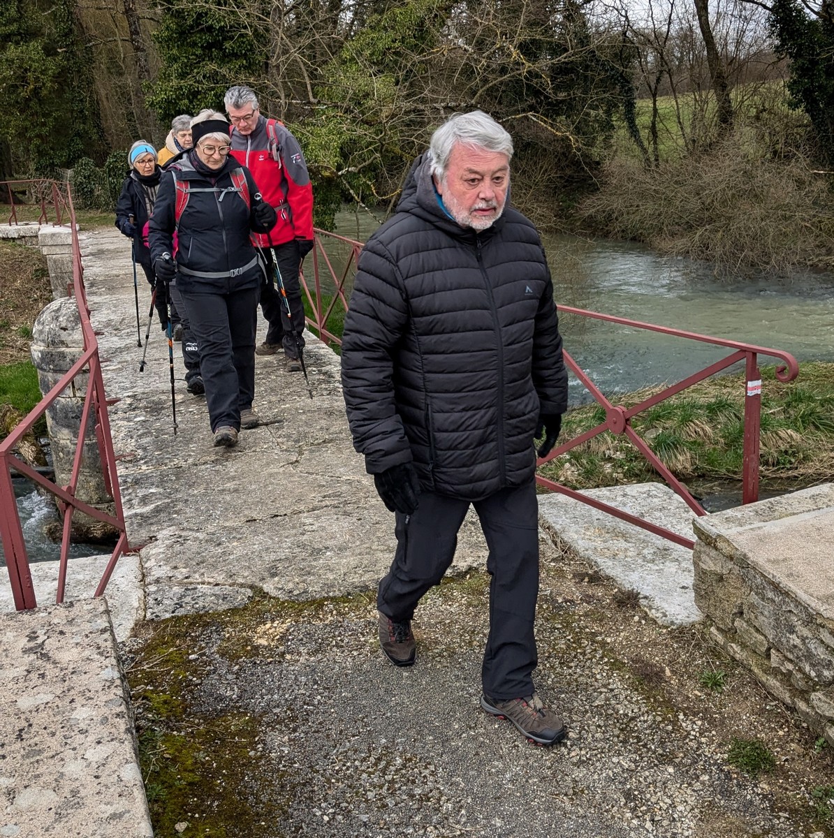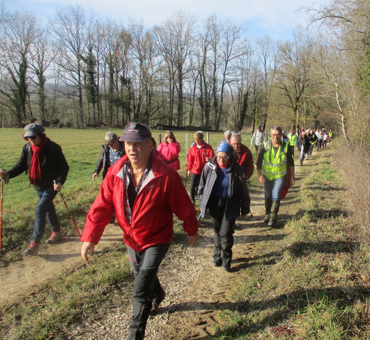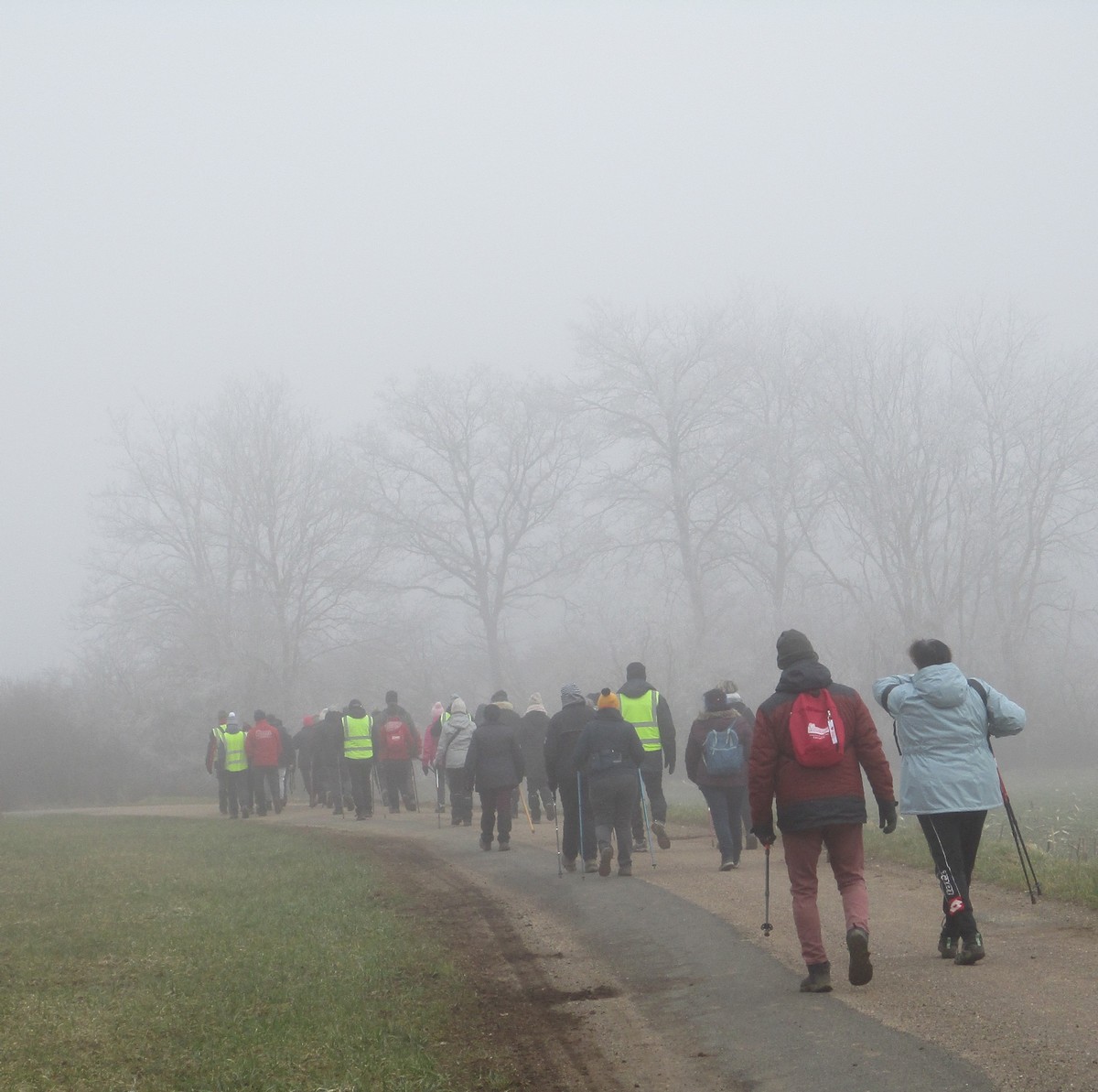 C’est parti pour le deuxième vendredi de l’année 2025, neuf kilomètres autour du lac de Charmes. Nous sommes une trentaine de randonneurs au départ de la place de Changey en direction de la D 54 qui traverse la digue sous un ciel brumeux. Après avoir marché dans le petit sentier boisé, nous traversons la passerelle de la baie de Champigny pour bifurquer à droite, de façon à rejoindre un petit chemin goudronné pas loin de la station d’épuration. Ensuite c’est reparti toujours tout droit, puis la pause s’impose ; à notre grande surprise une petite dame bien sympathique du groupe nous offre des gaufres sèches accompagnées de papillotes : « ça fait du bien ! ». Arrivés à Charmes nous longeons la digue : pose photos du groupe ; un petit gars de Chaumont a voulu me prendre en photo avec le groupe : « merci mon ami ! ». Nous repartons ensuite en direction de l’arrivée en faisant un détour en dessous de Changey.