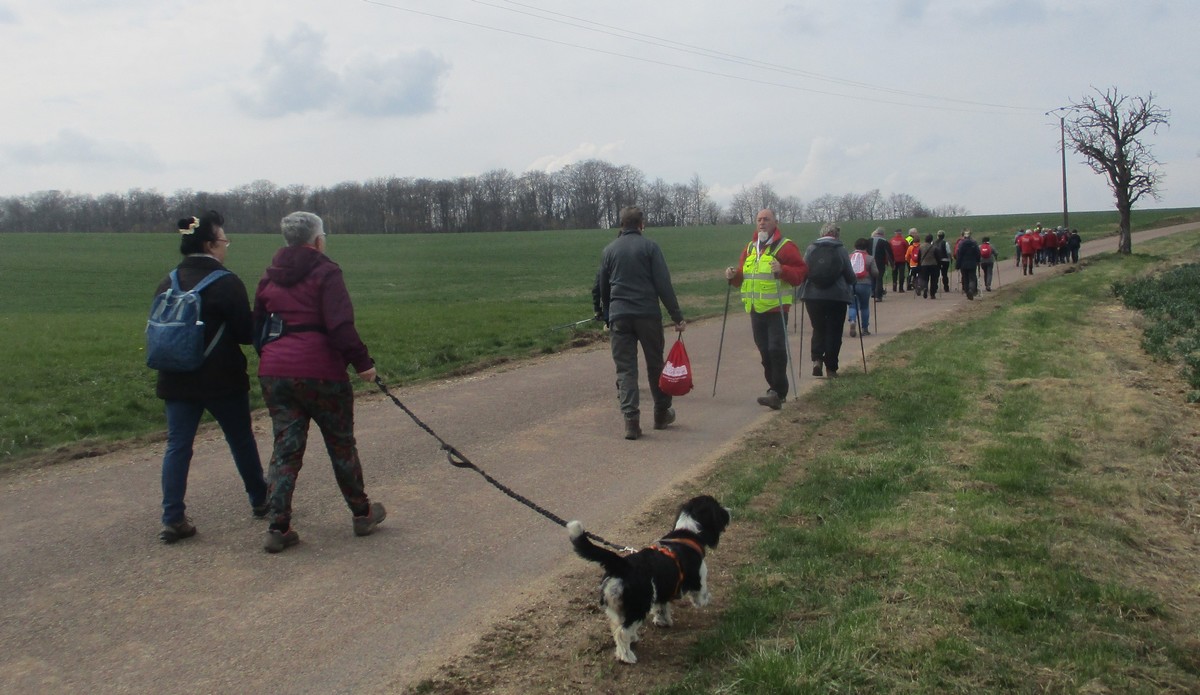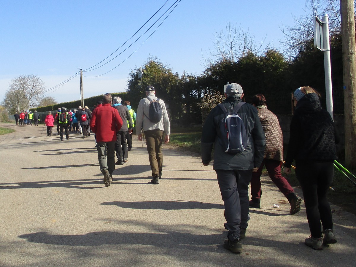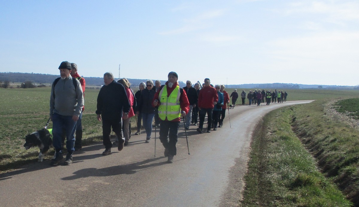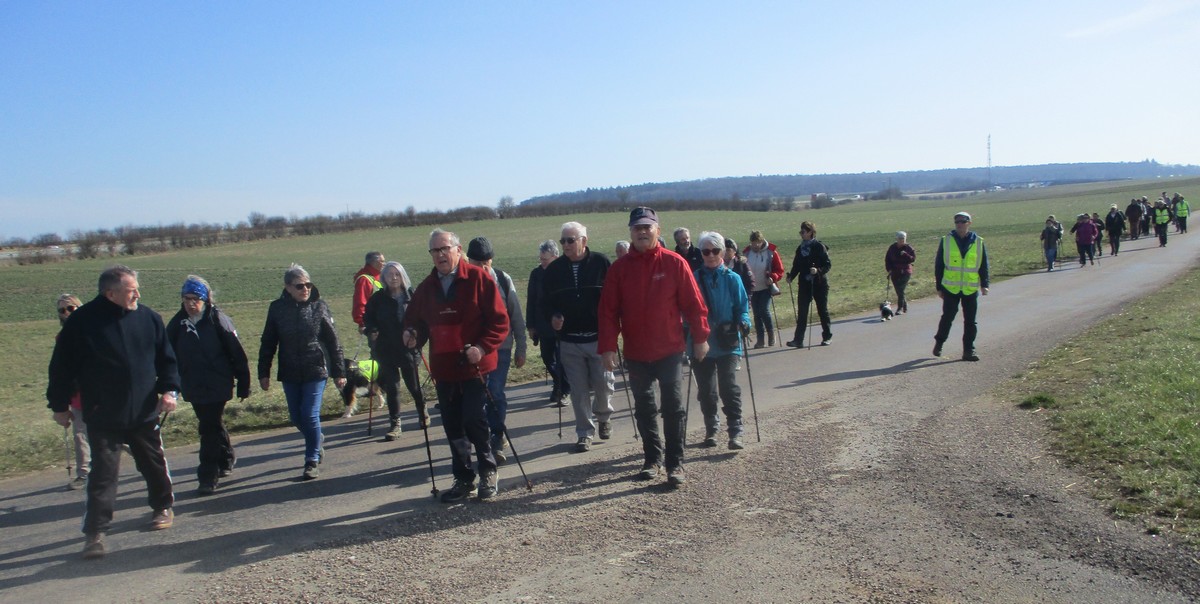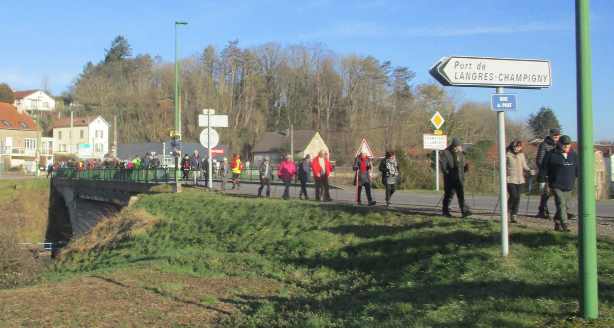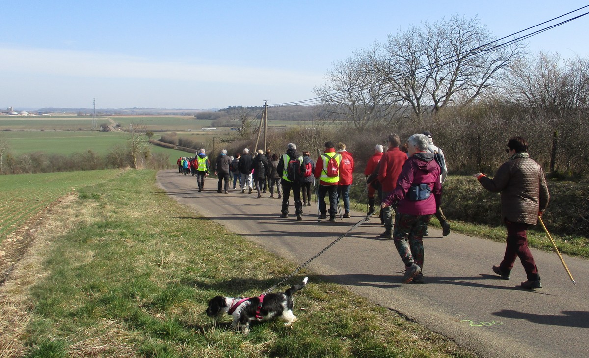 Ce mardi, encore un beau soleil sous un ciel bleu sans nuages et température correcte pour la saison : temps magnifique pour marcher. C’est ce qu’ont pensé la bonne cinquantaine d’adhérents qui se sont rassemblés sur le parking de l’école de Champigny-les-Langres. Violette retrouve Bingo. Nous démarrons le circuit mais dans l’autre sens pour changer. Nous empruntons des routes et chemins secs sauf la partie correspondant à une portion de l’ancienne voie romaine qui est restée gouillasseuse. Nous arrivons à l’autre Champigny près de Langres, appelé « Pont de Marne », où nous retrouvons le canal, lequel nous traversons pour faire une halte au port, pas pour embarquer mais pour faire la pause et prendre la pose. La principale difficulté du parcours est la montée raide de la « voie du Moulin » sur une bonne centaine de mètres, ceci avant d’arriver sur le plateau et continuer jusqu’au centre du village. Nous admirons au passage un kern empilé devant une maison rue de la Dîme, l’Eglise St Sébastien avec la petite cloche visible de l’extérieur. Nous finissons tranquillement notre balade du jour jusqu’au parking et retrouver nos carrosses, toujours sous le soleil.