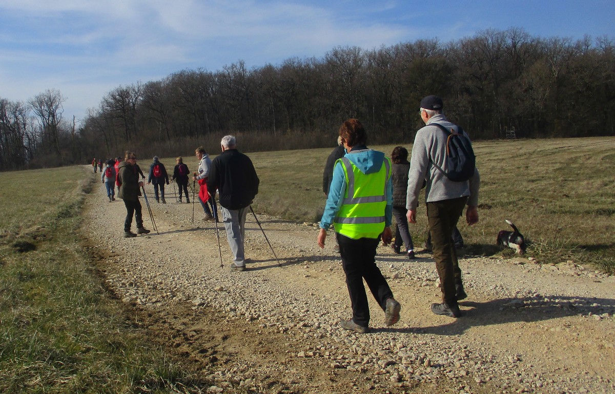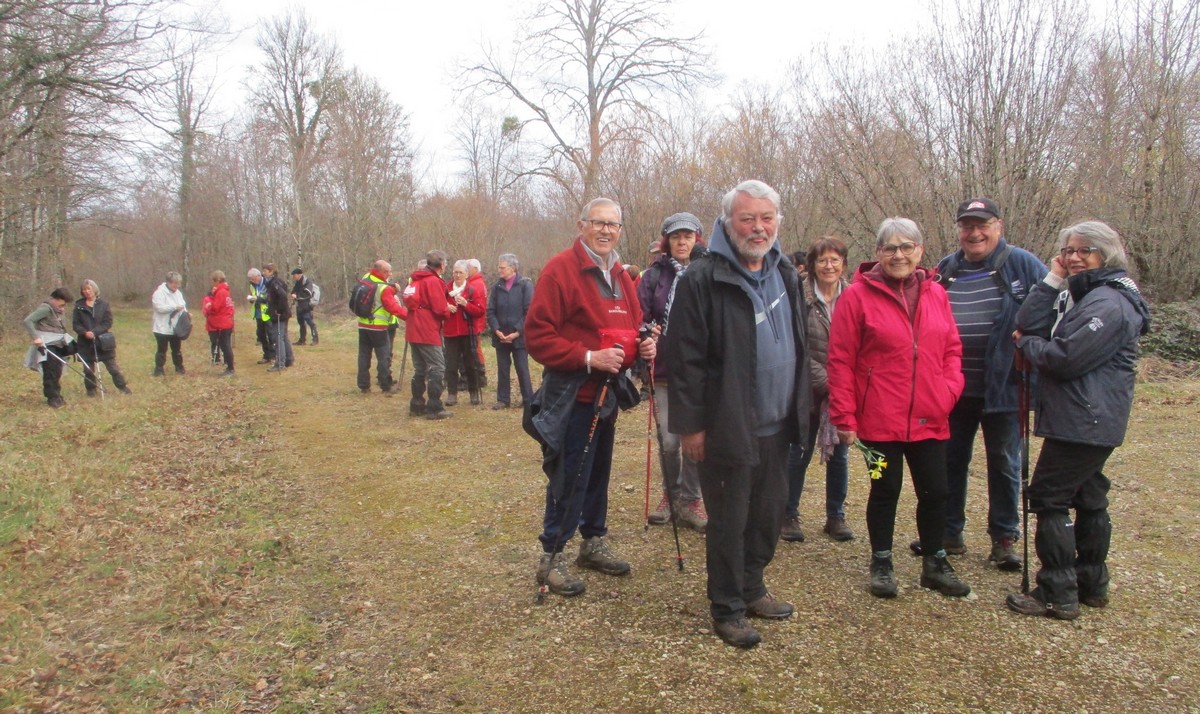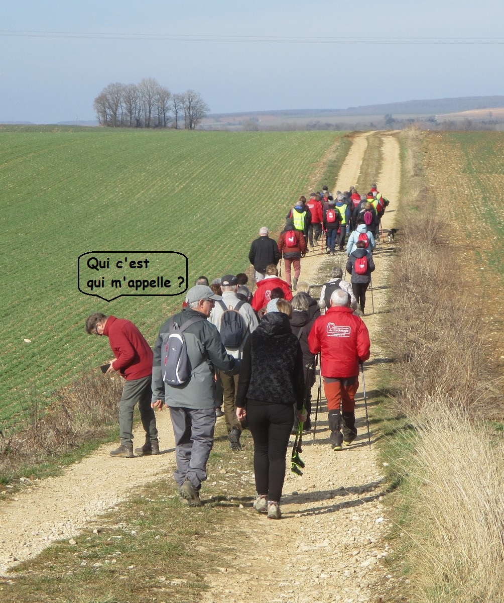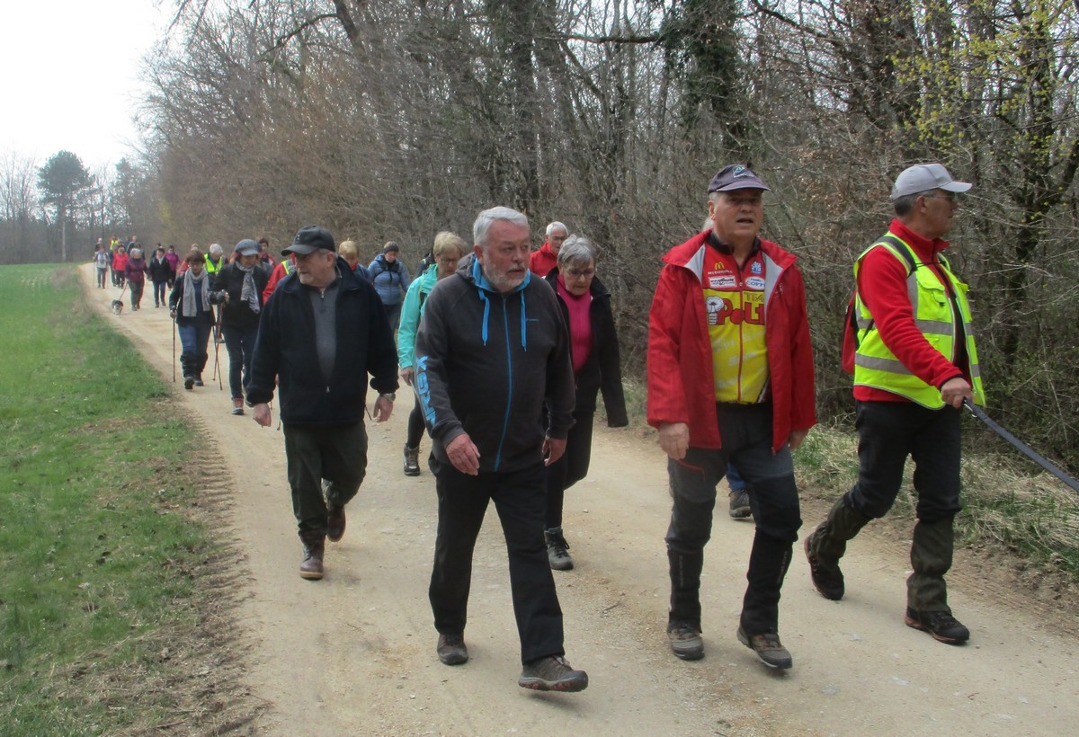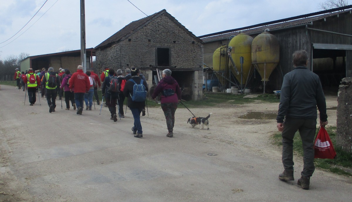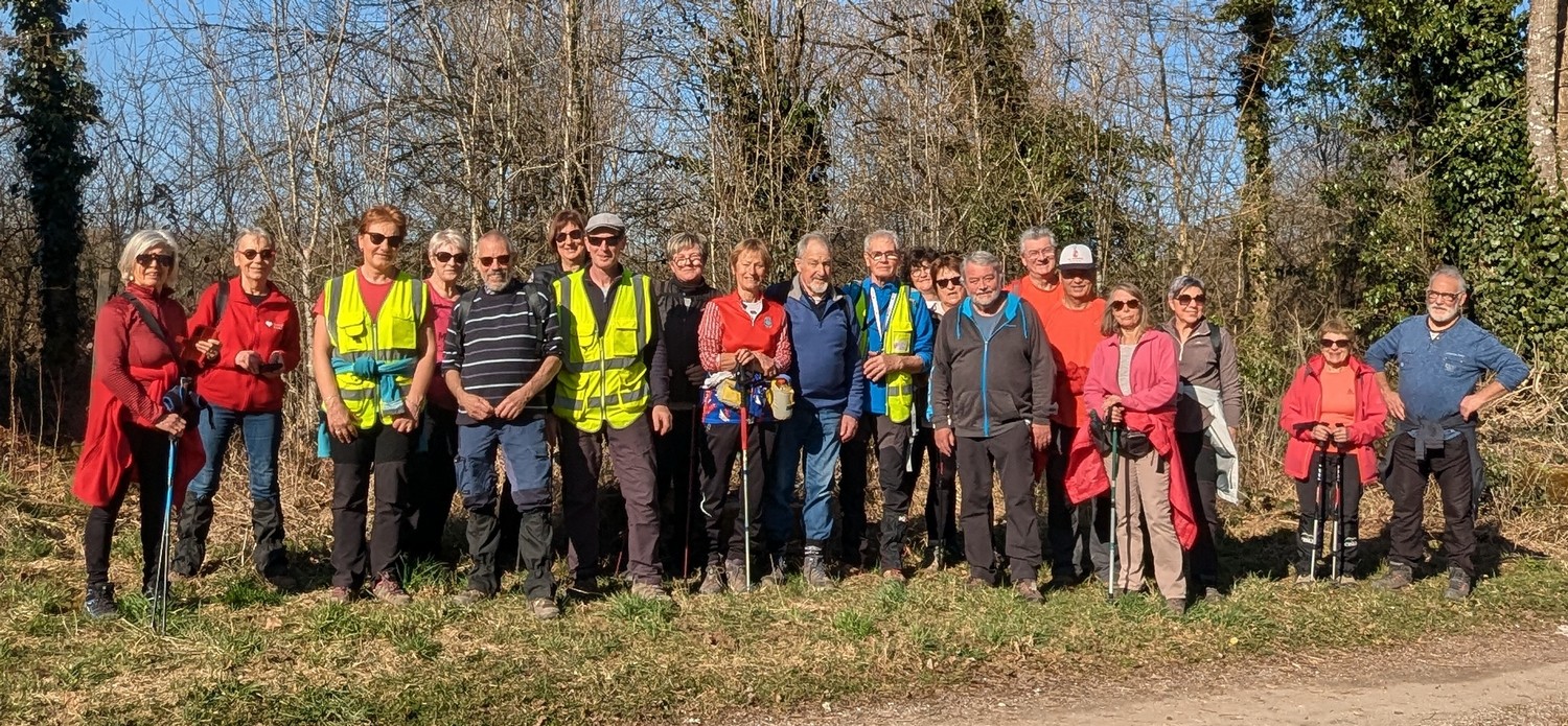 Ce mardi, encore un beau soleil sous un ciel bleu sans nuages et température correcte pour la saison : temps magnifique pour marcher. C’est ce qu’ont pensé la bonne cinquantaine d’adhérents qui se sont rassemblés sur le parking de l’école de Champigny-les-Langres. Violette retrouve Bingo. Nous démarrons le circuit mais dans l’autre sens pour changer. Nous empruntons des routes et chemins secs sauf la partie correspondant à une portion de l’ancienne voie romaine qui est restée gouillasseuse. Nous arrivons à l’autre Champigny près de Langres, appelé « Pont de Marne », où nous retrouvons le canal, lequel nous traversons pour faire une halte au port, pas pour embarquer mais pour faire la pause et prendre la pose. La principale difficulté du parcours est la montée raide de la « voie du Moulin » sur une bonne centaine de mètres, ceci avant d’arriver sur le plateau et continuer jusqu’au centre du village. Nous admirons au passage un kern empilé devant une maison rue de la Dîme, l’Eglise St Sébastien avec la petite cloche visible de l’extérieur. Nous finissons tranquillement notre balade du jour jusqu’au parking et retrouver nos carrosses, toujours sous le soleil.