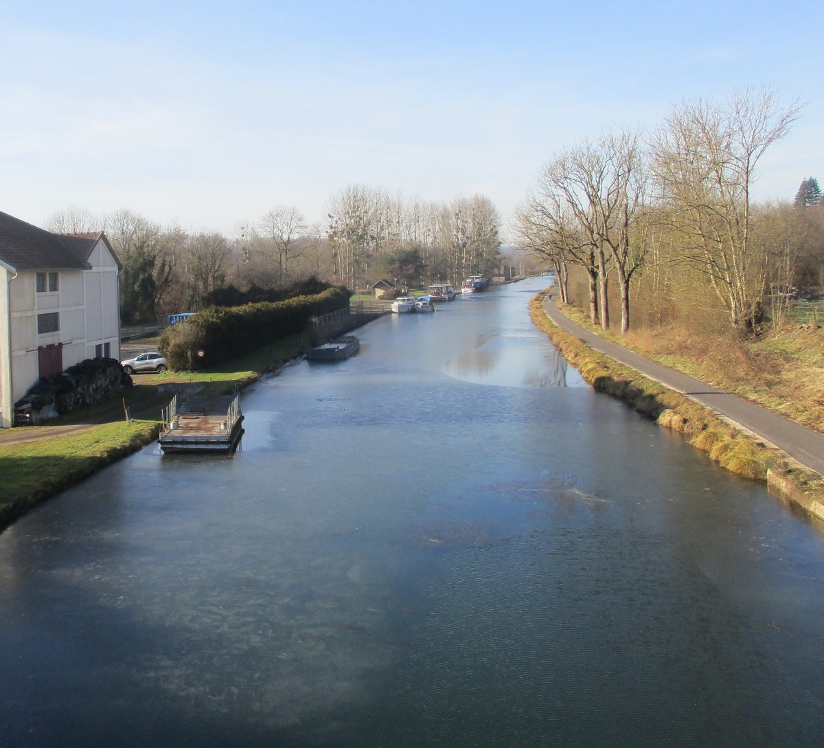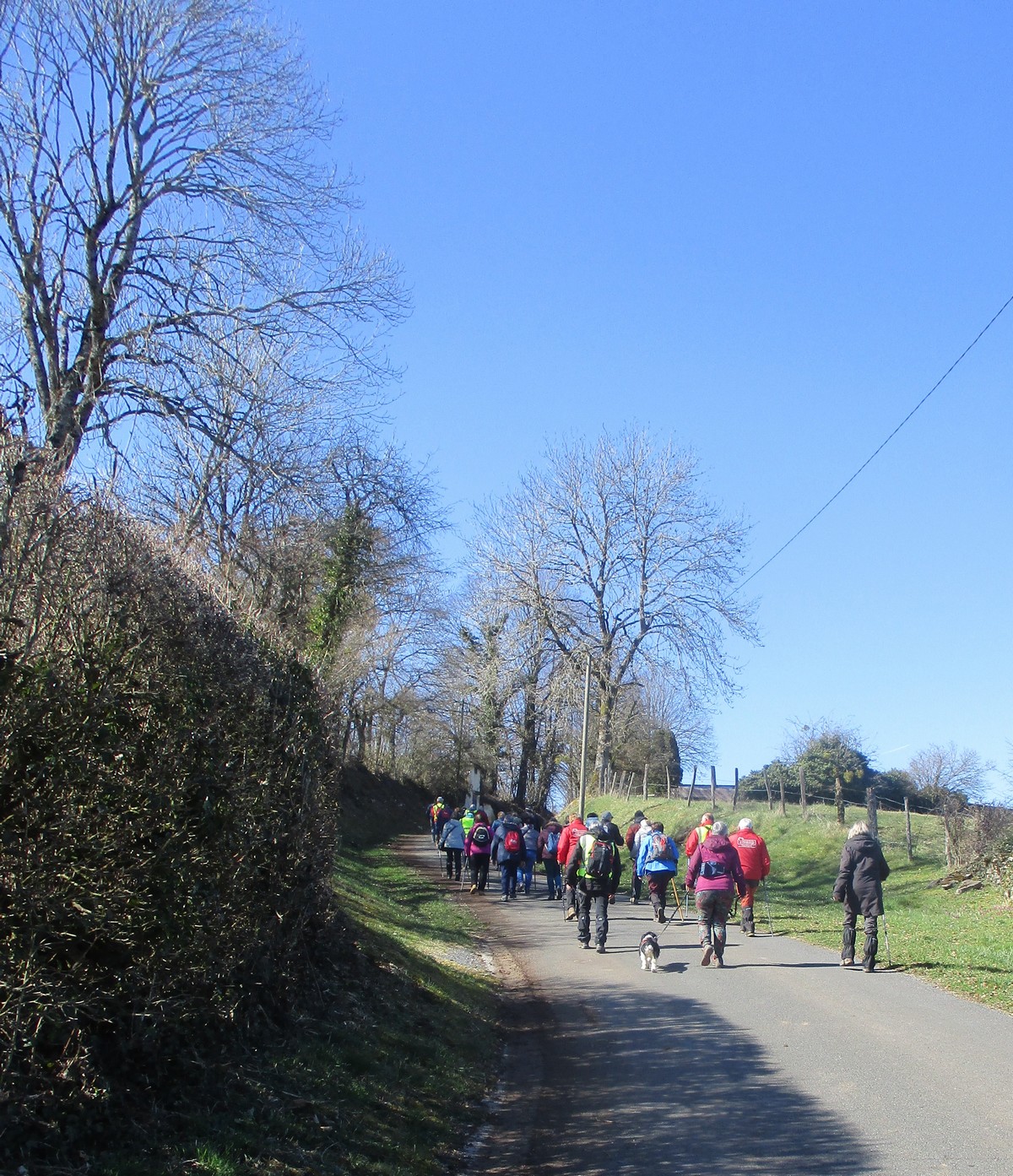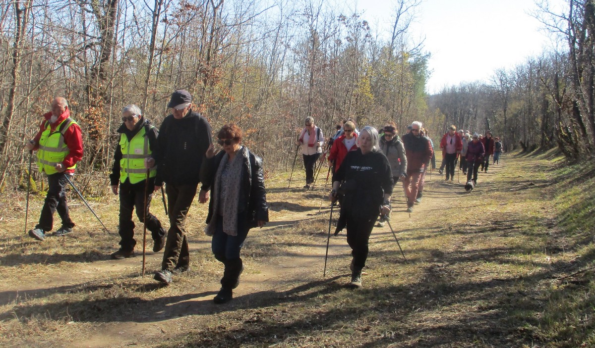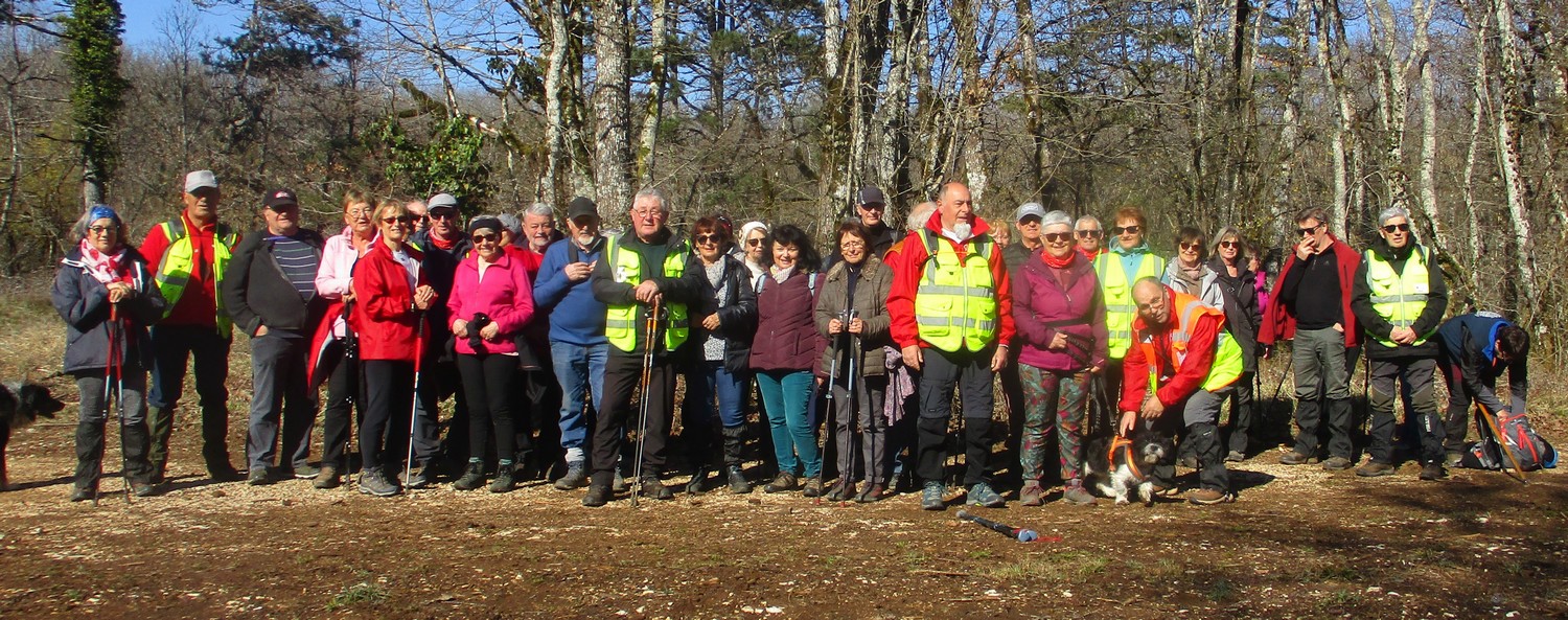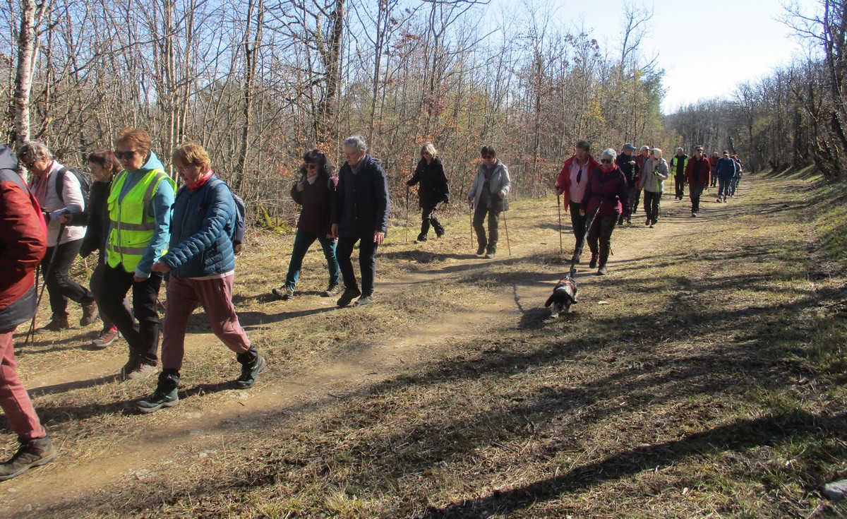 Ce mardi, encore un beau soleil sous un ciel bleu sans nuages et température correcte pour la saison : temps magnifique pour marcher. C’est ce qu’ont pensé la bonne cinquantaine d’adhérents qui se sont rassemblés sur le parking de l’école de Champigny-les-Langres. Violette retrouve Bingo. Nous démarrons le circuit mais dans l’autre sens pour changer. Nous empruntons des routes et chemins secs sauf la partie correspondant à une portion de l’ancienne voie romaine qui est restée gouillasseuse. Nous arrivons à l’autre Champigny près de Langres, appelé « Pont de Marne », où nous retrouvons le canal, lequel nous traversons pour faire une halte au port, pas pour embarquer mais pour faire la pause et prendre la pose. La principale difficulté du parcours est la montée raide de la « voie du Moulin » sur une bonne centaine de mètres, ceci avant d’arriver sur le plateau et continuer jusqu’au centre du village. Nous admirons au passage un kern empilé devant une maison rue de la Dîme, l’Eglise St Sébastien avec la petite cloche visible de l’extérieur. Nous finissons tranquillement notre balade du jour jusqu’au parking et retrouver nos carrosses, toujours sous le soleil.