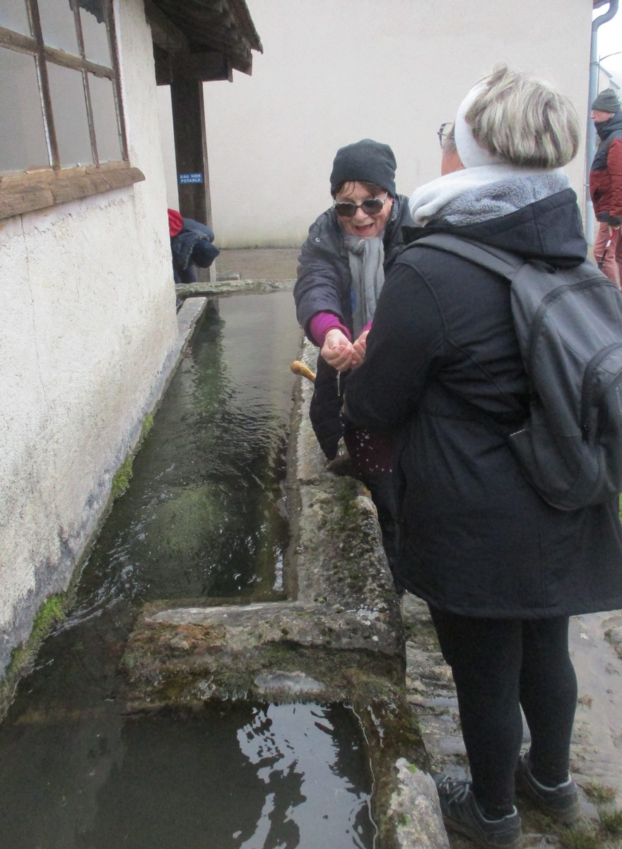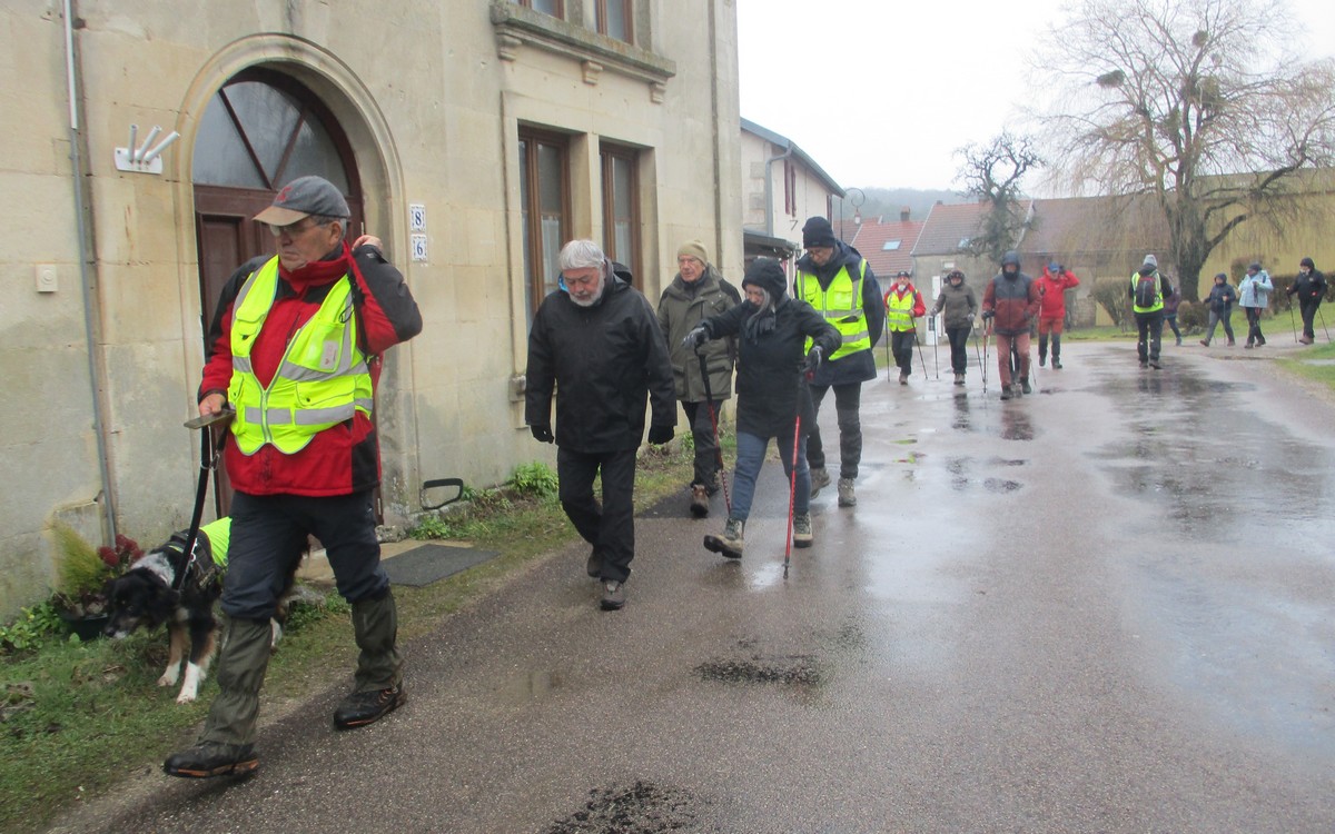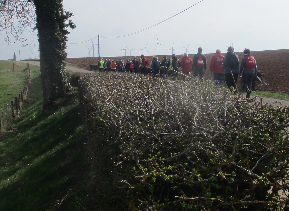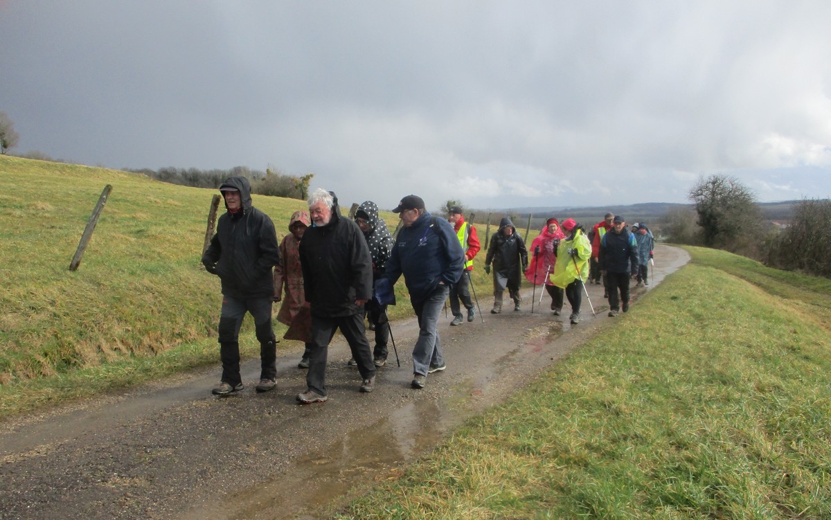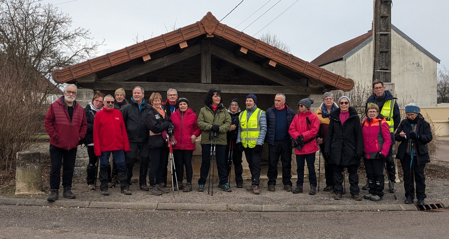 Ce mardi, temps mitigé : nuageux avec du vent, surtout sur les hauteurs d’Orcevaux.! Nous connaissions gouillasseux, glaçouilleux : il va falloir rajouter ventoyeux dans notre dictionnaire du club ! Nous sommes une bonne quarantaine à venir défier Éole au pays des éoliennes. Nous avons pris le chemin dans l’autre sens en attaquant par une bonne côte (mais pas de bœuf) en sortant du village. Le vent ne nous a pas quitté tout au long du parcours. Nous avons pu admirer au loin la vue sur le réservoir de la Vingeanne, lequel s’est bien rempli suite aux récentes intempéries. Quelques portions de chemins gouillasseux pour faire plaisir à nos godillots. Nous arrivons à Verseilles-le-Haut où nous en profitons pour faire la photo traditionnelle au pied de la fontaine. Nous sortons du village pour arriver sur les hauteurs du plateau et retrouvons nos énormes ventilateurs. La pluie s’invite pour le restant de la balade et persiste jusqu’au moment de rejoindre notre point de départ. Et, cerise sur le gâteau, certains ont même pris soin de nettoyer leurs pompes dans les fontaines, ceci avant de retrouver nos voitures pour s’y abriter.