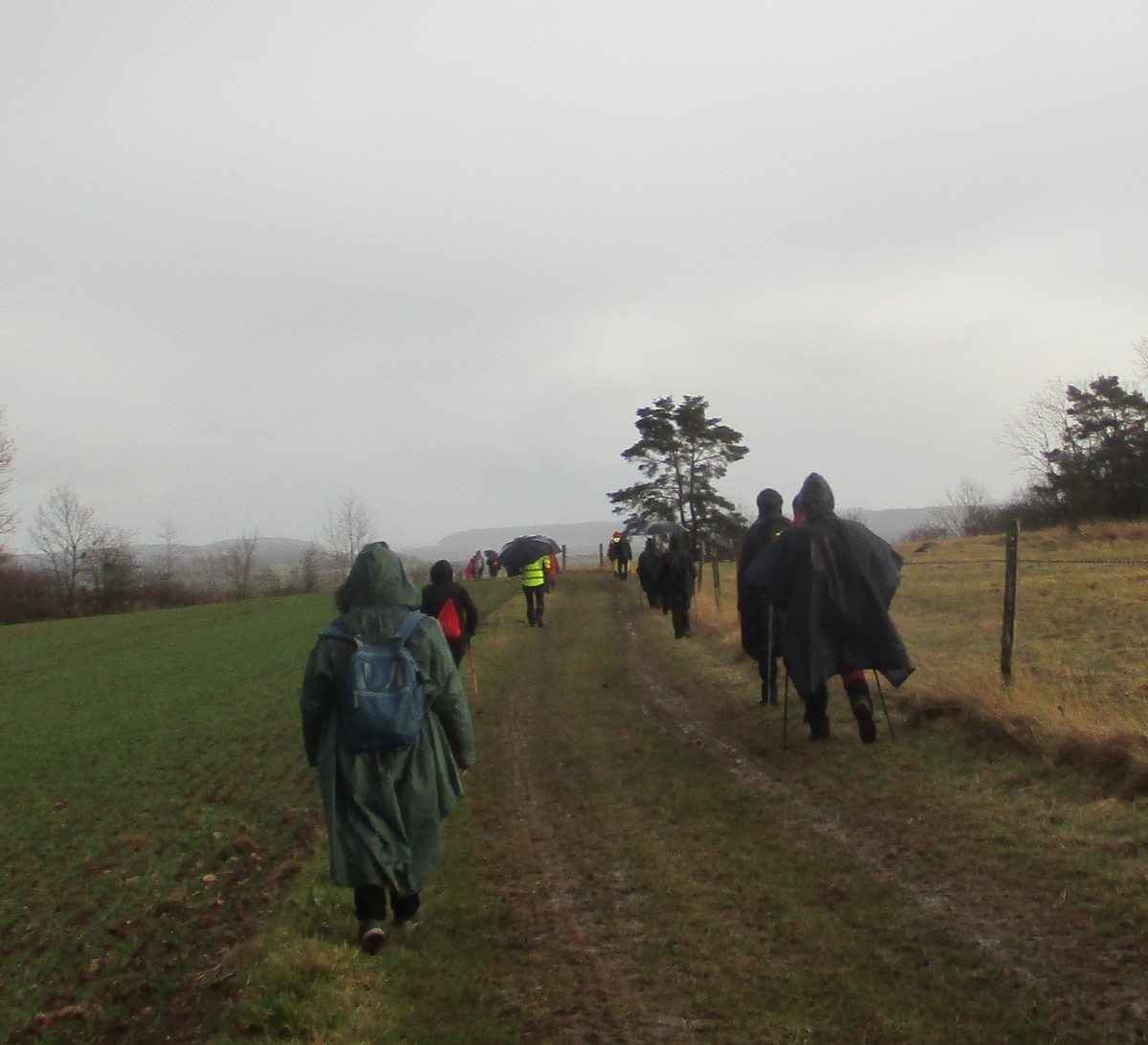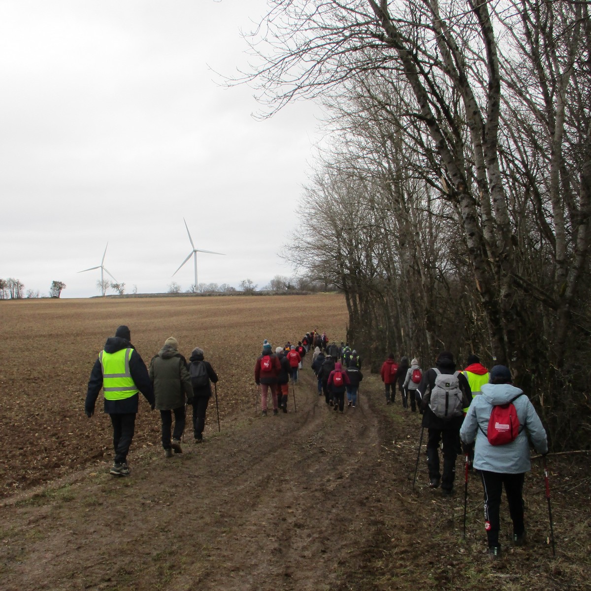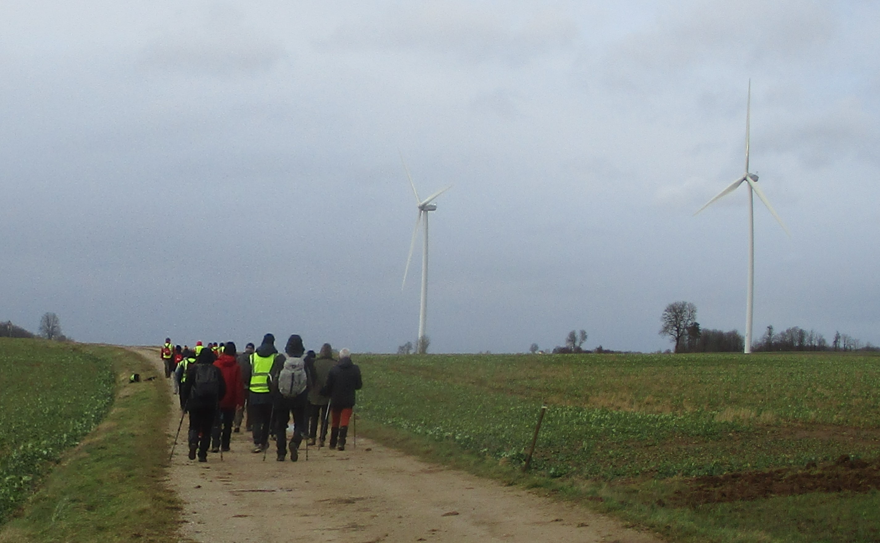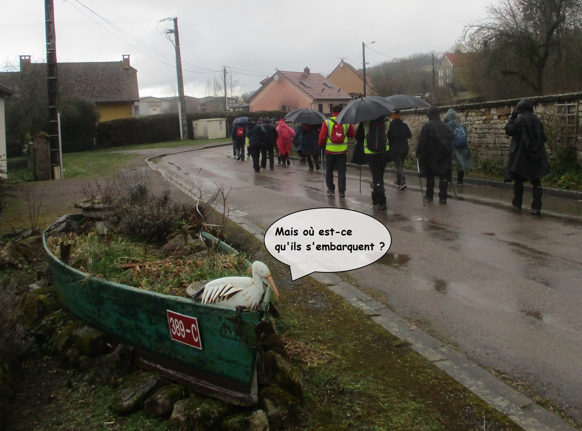 Ce mardi, temps mitigé : nuageux avec du vent, surtout sur les hauteurs d’Orcevaux.! Nous connaissions gouillasseux, glaçouilleux : il va falloir rajouter ventoyeux dans notre dictionnaire du club ! Nous sommes une bonne quarantaine à venir défier Éole au pays des éoliennes. Nous avons pris le chemin dans l’autre sens en attaquant par une bonne côte (mais pas de bœuf) en sortant du village. Le vent ne nous a pas quitté tout au long du parcours. Nous avons pu admirer au loin la vue sur le réservoir de la Vingeanne, lequel s’est bien rempli suite aux récentes intempéries. Quelques portions de chemins gouillasseux pour faire plaisir à nos godillots. Nous arrivons à Verseilles-le-Haut où nous en profitons pour faire la photo traditionnelle au pied de la fontaine. Nous sortons du village pour arriver sur les hauteurs du plateau et retrouvons nos énormes ventilateurs. La pluie s’invite pour le restant de la balade et persiste jusqu’au moment de rejoindre notre point de départ. Et, cerise sur le gâteau, certains ont même pris soin de nettoyer leurs pompes dans les fontaines, ceci avant de retrouver nos voitures pour s’y abriter.