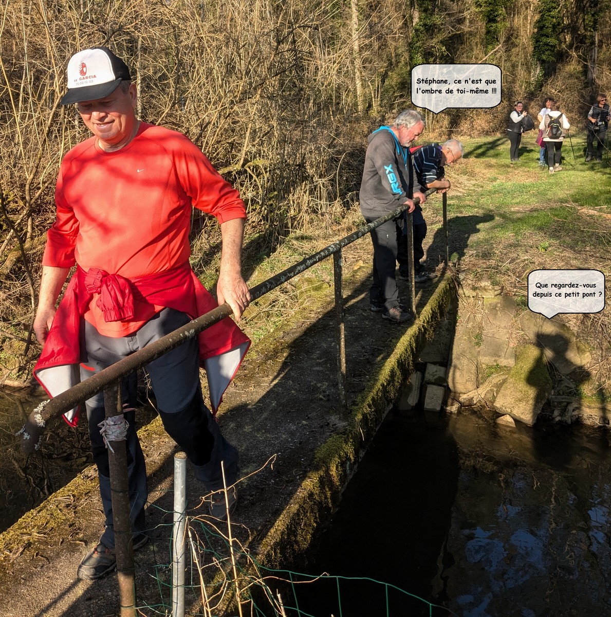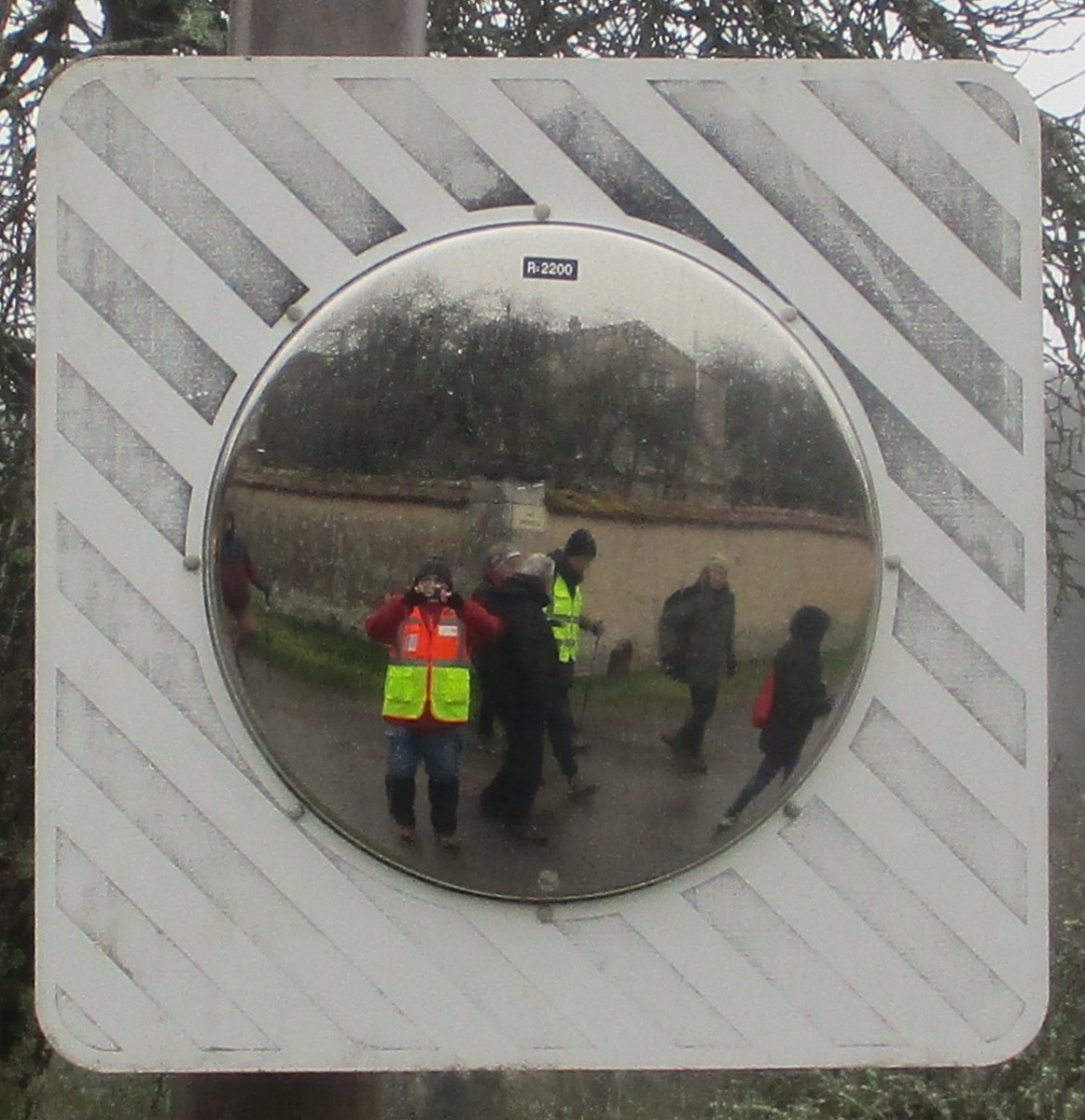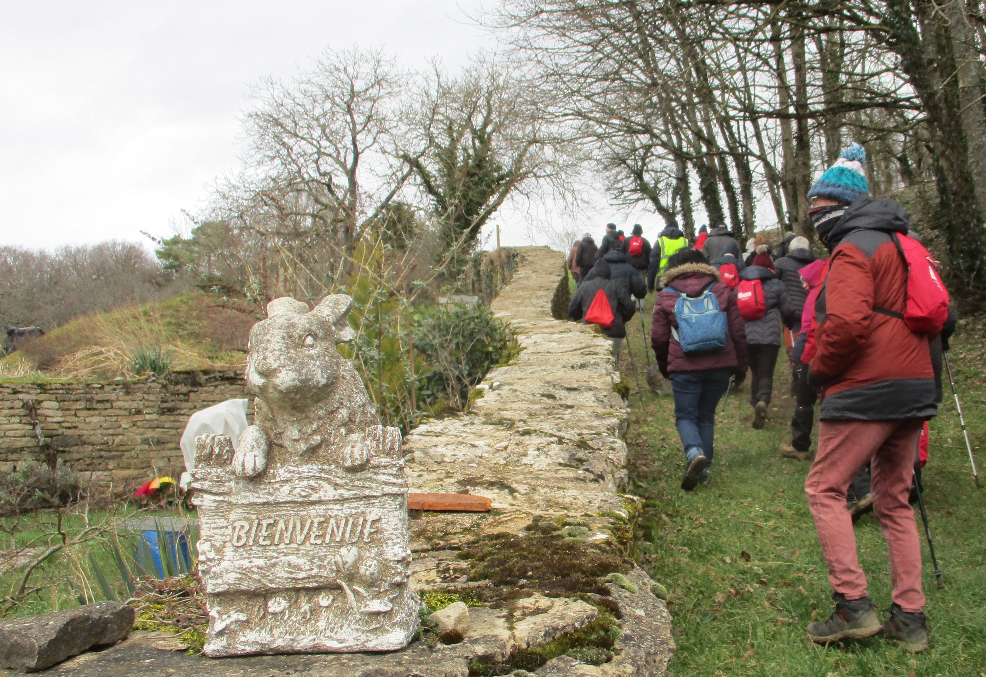 Que d’eau, que d’eau ! Mais rien n’arrête la vingtaine de marcheurs du club venus, non pas pour chanter l’In-Ternat-ionale, mais pour se mouiller pour la dernière du mardi avant les vacances. Dans ce circuit en grande partie boisé et long de 6 kms, on al-Ternat entre monts et vaux, entre chemins et routes, avec en prime quelques épisodes légèrement gouillasseux. Seules particularités rencontrées : des becs de canard sur la fontaine au pied de l’Eglise, un gros miroir à selfie que j’ai testé, des ruches colorées, quelques balles rondes patriotes, un abri tôlé pour faire une halte et cons-Ternat-ion : des perce-neiges qui commencent à fleurir.