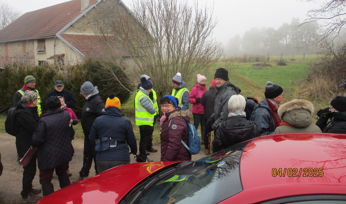 Nous voici déjà en février, les crêpes de la chandeleur sont digérées, alors on peut aller marcher, là où le père en sait quelque chose !!! Nous sommes une trentaine et demie à être venus malgré un temps « brouillasseux » depuis le matin et qui ne nous a pas quitté de toute la marche. Les arbres sont remplis de givre par endroit, rendant quelques clichés magnifiques. La Mère Rondot porte toujours sa croix, mais aurait besoin d’être mieux mise en valeur. Après avoir copieusement amassé de la terre sous nos godillots en empruntant des sentiers « crottoilleux » : séance décrottage à la sortie. Nous continuons notre périple en alternant crottage – décrottage, toujours dans le brouillard. Nous arrivons enfin au centre de Perrancey au pied de la fontaine où Nelly intronise une nouvelle adhérente ! Nous remontons le village en direction du château d’eau pour rejoindre nos carrosses.