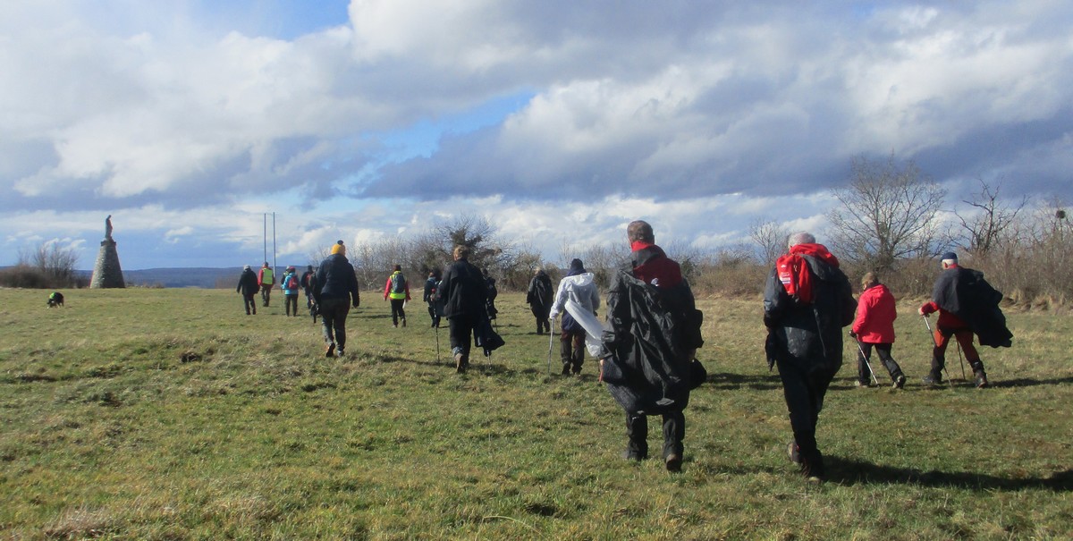 Départ du port de Rolampont, mais pas pour une croisière en bateau. C’est bien à pied que nous partons en direction du Mont Rond. Nous sommes une petite vingtaine ; ça démarre très fort par une bonne grimpette, accompagnés d’un ciel « soleilleux ». Cela nous conduit sur l’aérodrome, non pas pour prendre l’avion mais pour poursuivre notre marche sur la plaine ou le vent n’est pas très chaud. Nous finissons cette marche de 10,4 kms par une bonne descente de façon à rejoindre le canal et nos voitures.