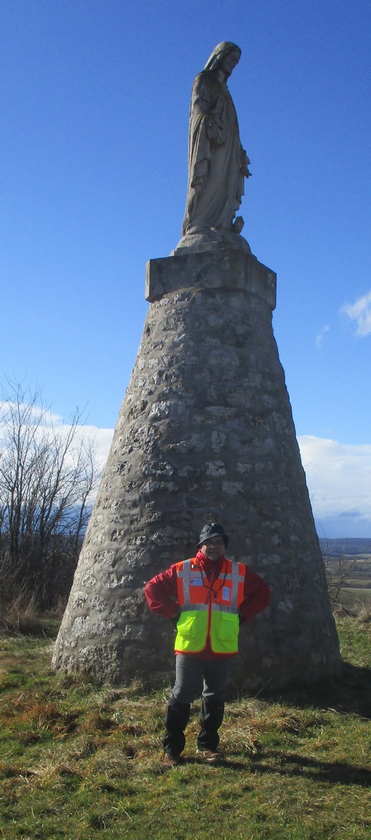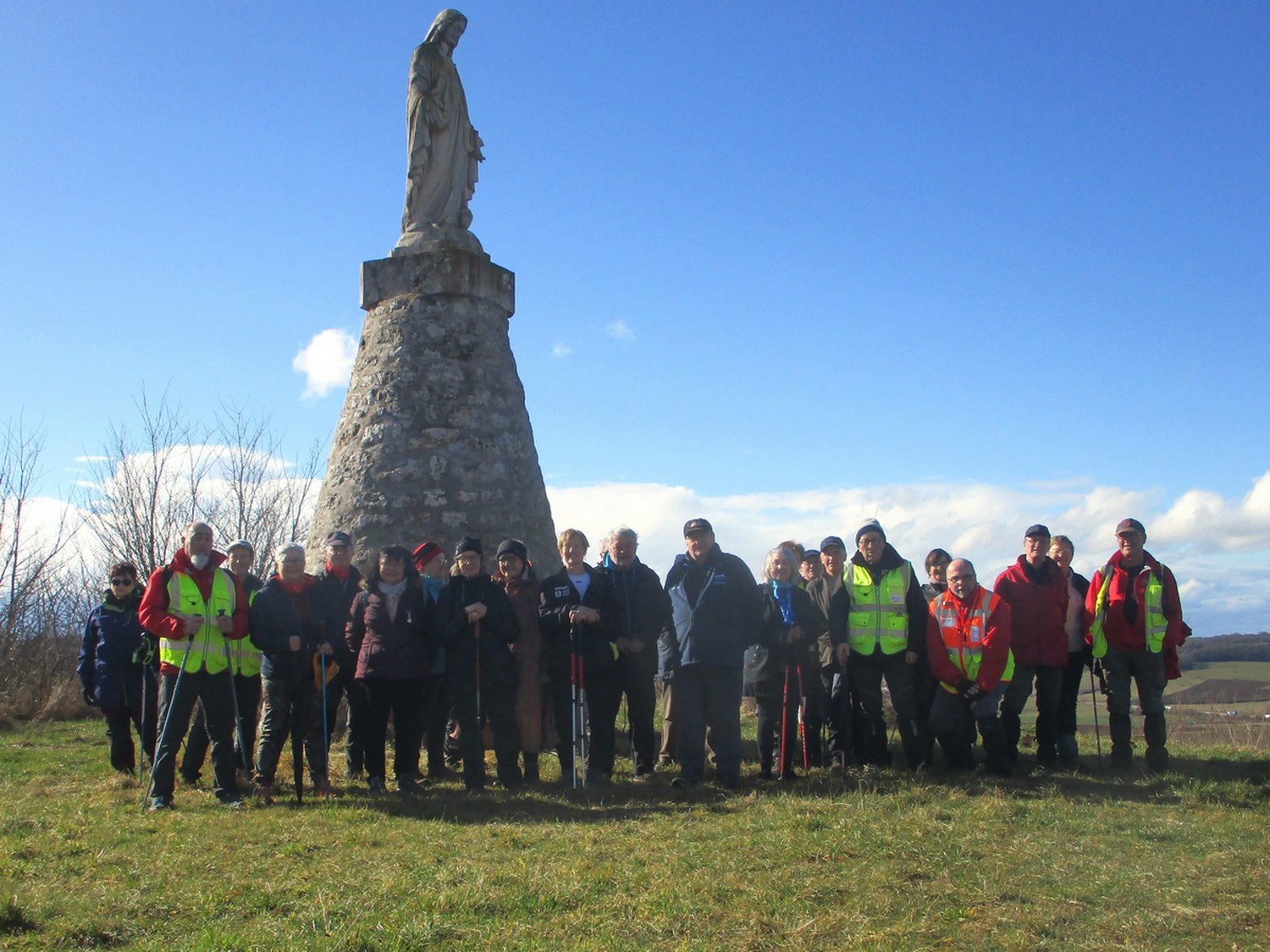 Ça y est, les vacances sont finies mais pas le mauvais temps. En effet, depuis ce matin il pleut sans cesse et on se demandait si la marche allait avoir lieu ou pas. Eh bien oui ; alors on s’est changé pour aller à Changey : kways et ponchos conseillés. Nous étions une demi-cinquantaine à s’être déplacés pour aller voir « Notre Dame du Mt Vengé ». Mais pour cela, il nous fallait monter, monter jusqu’au plateau de Movange. Après la pluie vient le beau temps. Nous arrivons au plus haut du dénivelé où, après avoir franchi le passage à piétons, un troupeau de chevaux nous attendait dans leur enclos. Nous le traversons jusqu’à une autre barrière qu’il nous faut ouvrir pour continuer notre périple jusqu’au promontoire de la vierge. Tout le monde peut alors admirer la vue donnant sur la vallée de la Marne et les villages environnants. Petite séance photo pendant que le soleil brille et nous voilà reparti en sens inverse pour changer. Sauf qu’au milieu du chemin retour, nous rentrons dans le bois de la Montagne où nous retrouvons le mauvais temps avec orage et pluie drue. Nos godillots s’enfoncent dans les sentiers gouillasseux. En sortant du bois, nous retrouvons le chemin stabilisé du retour et essayons de décrotter dans l’herbe les monceaux de terre accumulés sous les semelles. En arrivant au village, le temps a encore changé et la pluie cessa, ce qui nous a permis de retrouver nos voitures pour un changement de chaussures vivement conseillé !!!
