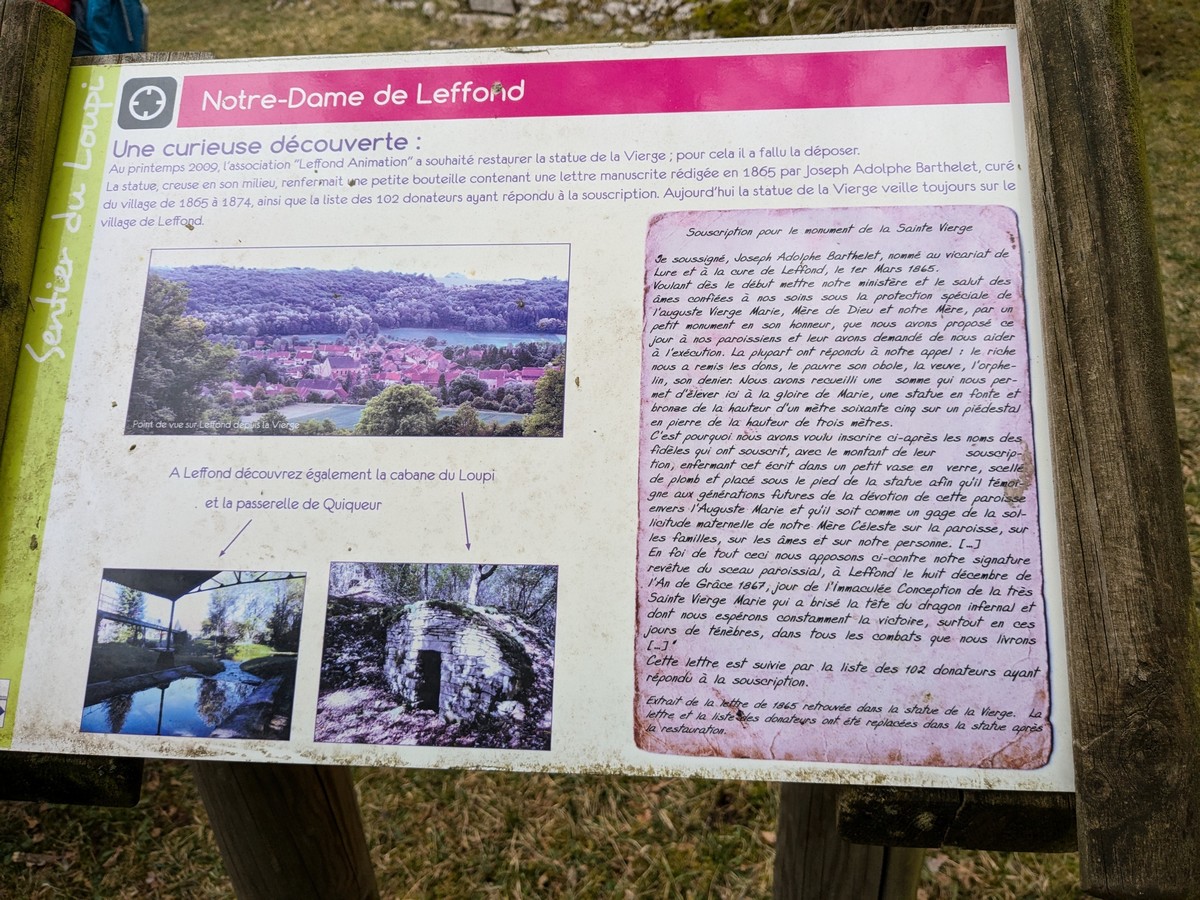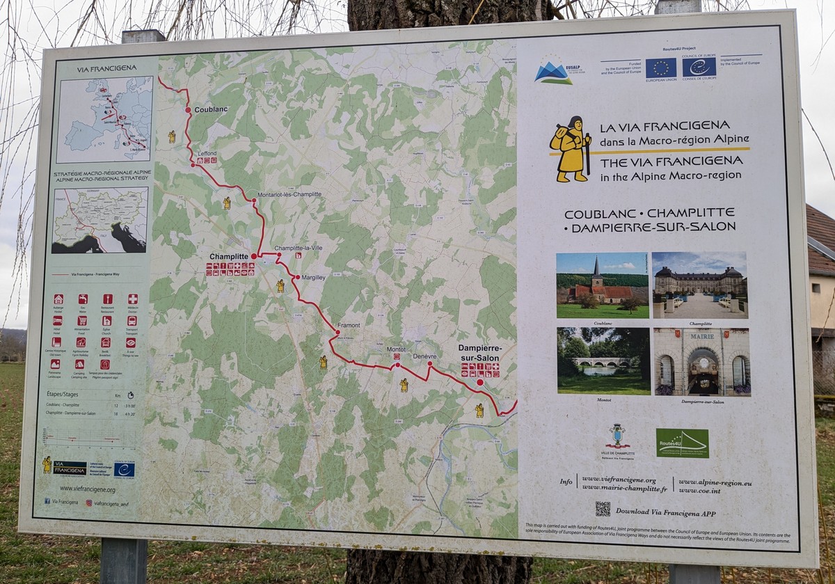 Nous voici de retour, en horaire d’été, pour un circuit de 10,4 kms sur la commune de Coublanc. Une petite vingtaine de Marcheurs peuvent apercevoir le confluent de la Resaigne et du Salon, c’est parti pour la plaine de façon à rejoindre le petit village de Leffond en Haute -Saône. Un arrêt s’impose afin de lire un panneau expliquant la traversée de la VIA FRANCIGENA allant de Canterbury en Angleterre pour arriver à S.Maria Di Leuca en Italie. C’est par une bonne grimpette que nous arrivons à Notre-Dame de Leffond pour un retour sur Coublanc. À savoir que notre club a investi dans deux défibrillateurs d’où Jean-Luc le responsable des marches en est le porteur pour notre groupe.