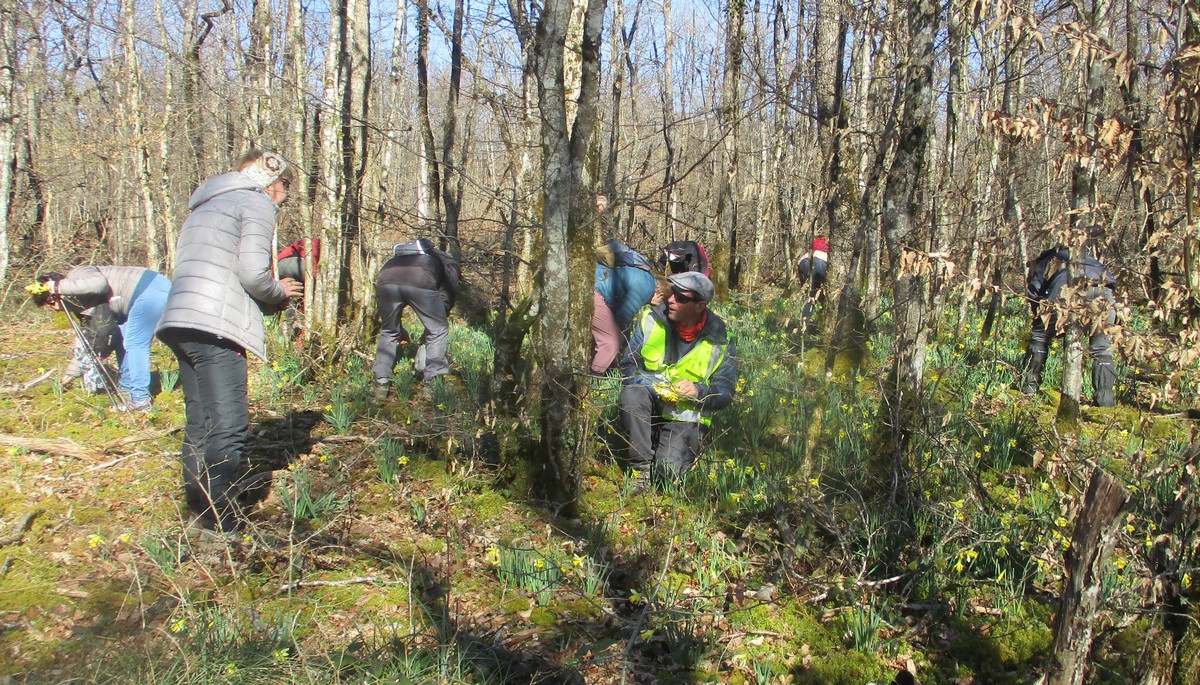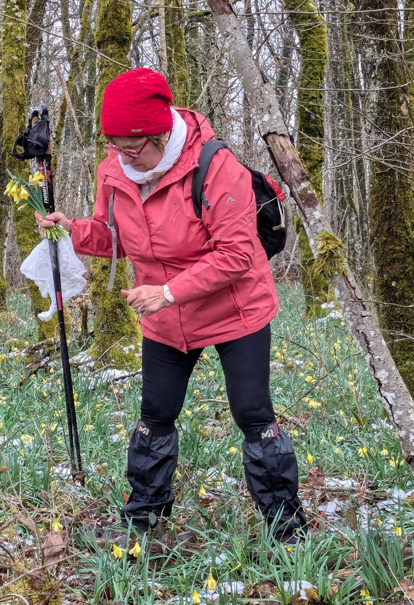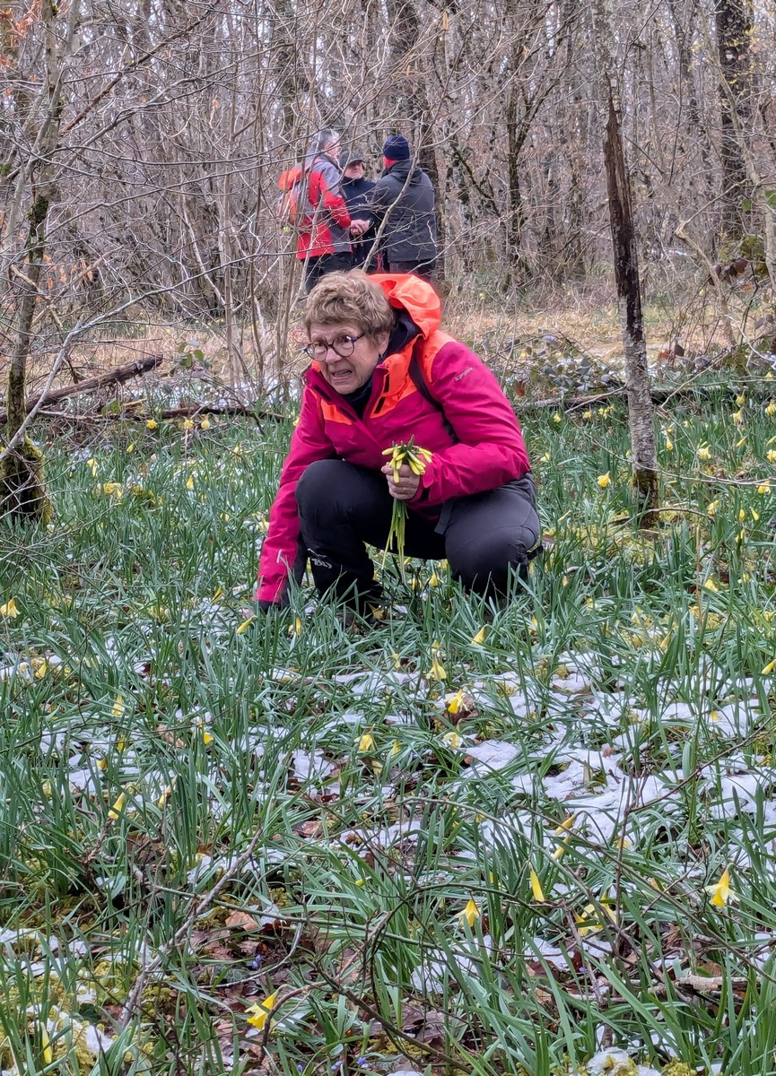 Les années se suivent et se ressemblent dit-on. En effet, aujourd’hui c’est opération « jonquilles » dans les bois de Rolampont au lieu-dit de La Rieppe. Nous sommes une bonne trentaine à s’être déplacés pour l’occasion. Mais il nous fallait parcourir déjà presque 6kms avant de pratiquer la cueillette des fleurs jaunes de saison. Vu le temps maussade du matin, nous avons eu de la chance l’après-midi : éclaircies avec de temps en temps un rayon de soleil. Par contre, les chemins empruntés dans les tranches étaient restés gouillasseux à souhait. Nous admirons au passage quelques autres fleurs de printemps telles que scille ou encore daphné (bois joli). Et nous voici arrivés à l’attraction du jour : cueillette pour tout le monde mais de façon raisonnable. Il ne nous restait plus qu’à se rassembler pour la photo de groupe colorée et enfin revenir vers notre point de départ. Chacun est reparti à son domicile pour disposer son bouquet à sa guise.