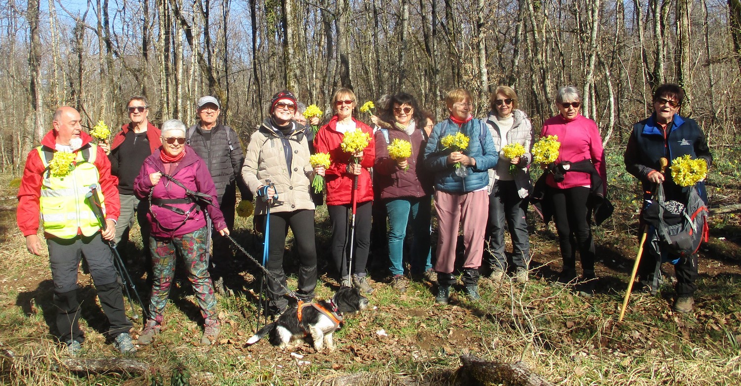En ce mardi 18 mars, avant-veille du printemps, le soleil est revenu pour nous accompagner dans cette marche au départ de Courcelles en Montagne. J’ai bien dit en Montagne et non pas sur Aujon … car on pourrait se tromper !!! Nous sommes donc partis un peu après 14 heures en direction des bois situés au nord-ouest du village et qui font partie du parc national des forêts, d’où obligation d’attacher nos quadrupèdes Violette et Bingo. Nous sommes moins d’une quarantaine de marcheurs à parcourir les chemins et sentiers praticables, à l’exception d’une tranche particulièrement gouillasseuse ! Une première photo de groupe dans la clairière, puis cueillette des jonquilles pour une photo jaunie (par les fleurs). Le reste de la marche s’effectue quasi sans encombre, sauf un arbre entravant notre passage qui nous retarde quelque peu. Nous sortons du bois et découvrons le panorama où l’on aperçoit au loin Langres et sa Cathédrale. Enfin, nous regagnons le village, toujours sous le soleil.
