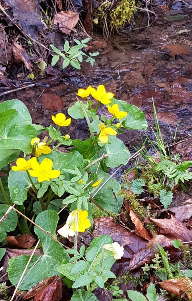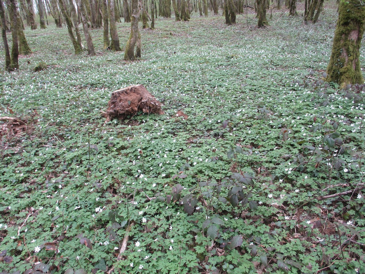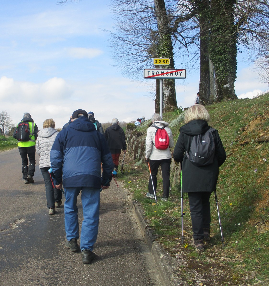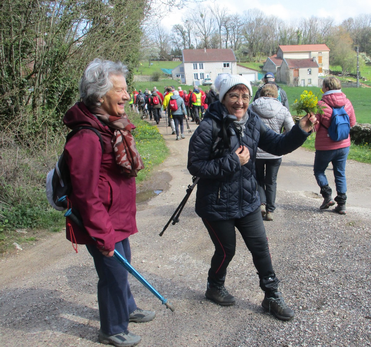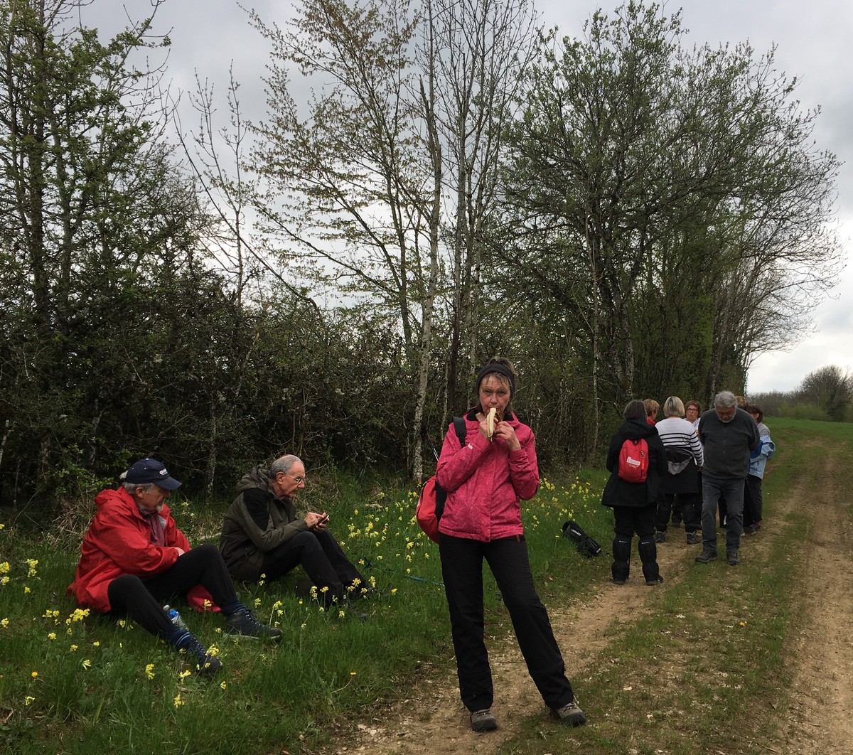 Depuis le haut du château d’eau où je prenais la première photo du jour, j’ai crié à tous que c’était ma fête … la St Parfait ; évidemment tout le monde a ri ! C’était pour réchauffer l’atmosphère car un vent d’Est nous engourdissait du haut de Tronchoy. Nous sommes alors vite rentrés dans le bois à l’abri du vent. Le ciel était couvert mais pas trop menaçant. On pouvait admirer des parterres de fleurs de printemps tapissant le sol encore humide et où nous avions quelques difficultés à emprunter une partie du chemin défoncé par les engins forestiers. Pendant la séance photo de groupe, quelques plaisantins dont nous tairont les noms mais que tout le monde a reconnus, m’ont faussé la prise de vue !!! Quelques-unes en ont même profité pour se faire un petit bouquet de coucous, fleurs de saison. A la fin de notre périple, Nelly invita celles et ceux qui le désiraient à prendre une part de brioche qui lui restait de samedi après le Parcours du Cœur.