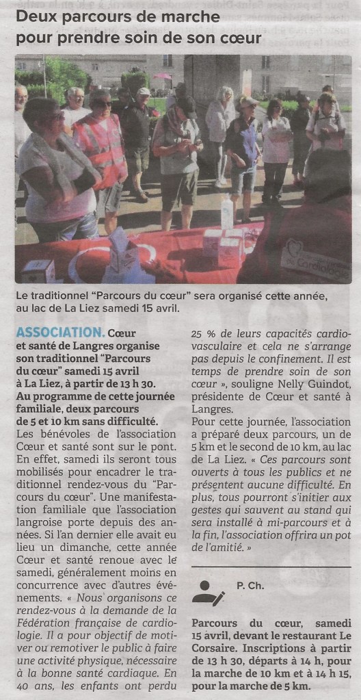 - Marche du cœur – 2 mai 2023 : Lac de la Vingeanne – Villegusien