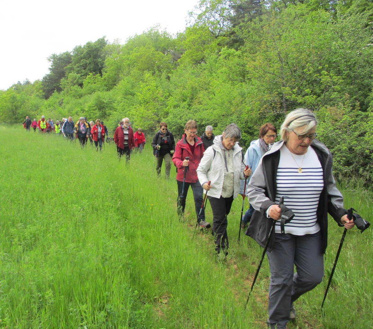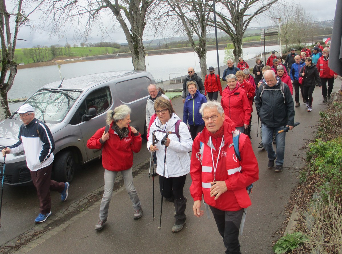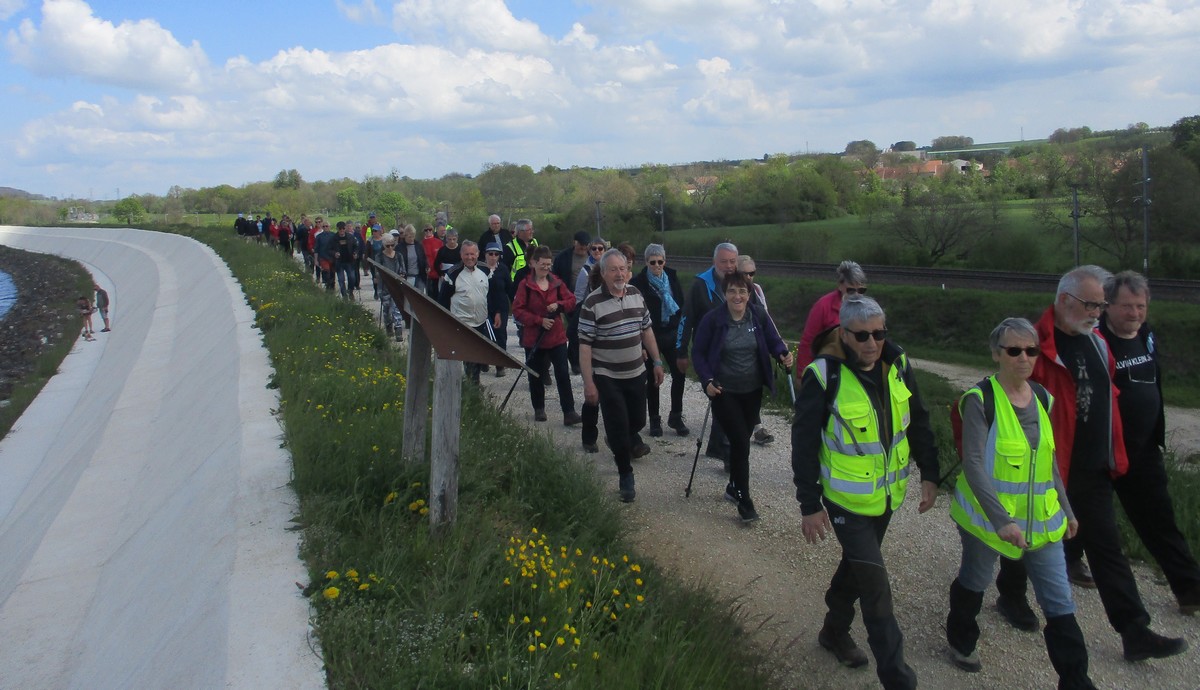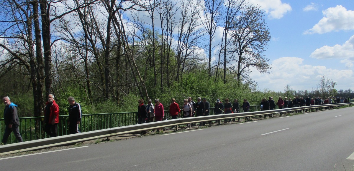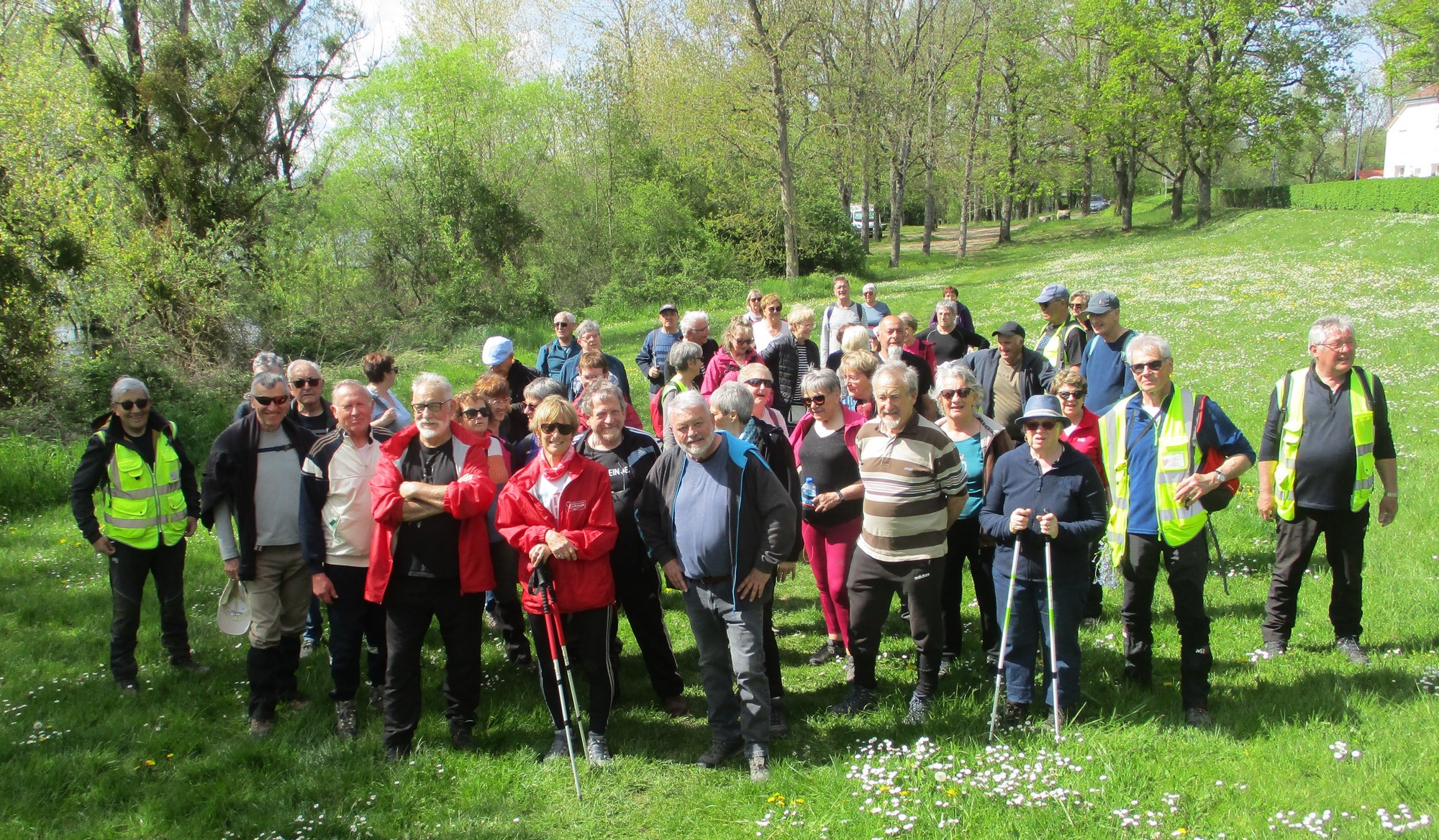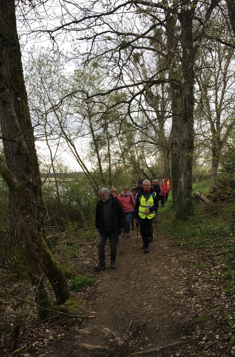 En mai, fait ce qu’il te plait ! Et bien en ce mardi de reprise, près d’une cinquantaine de valeureux marcheurs s’est plu à venir faire le petit tour du lac de la Vingeanne avec en prime le soleil et la douceur printanière tant attendus. Beaucoup se racontent leur emploi du temps de la semaine passée tout en démarrant la marche, laquelle ne présente pas de difficulté particulière à part éviter les passages encore humides. La traversée du pont se fait sous un soleil radieux, on aperçoit même un nid rempli d’œufs dans les roseaux, mais à qui sont-ils ? Vu aussi un pêcheur équipé pro en plein milieu du lac et qui attend que ça morde. Pas facile non plus de faire rentrer tout le monde dans l’appareil photo lors de la pose. Nombre d’arbres tombés suite aux vents forts jonchent le sentier provoquant quelques acrobaties pour les enjamber. Le lavoir du village est à sec cette année. Une dernière photo de groupe à l’arrivée et nous rejoignons nos voitures en se disant à la prochaine !