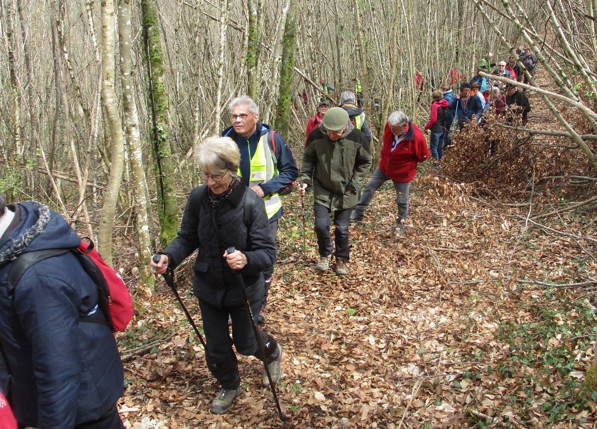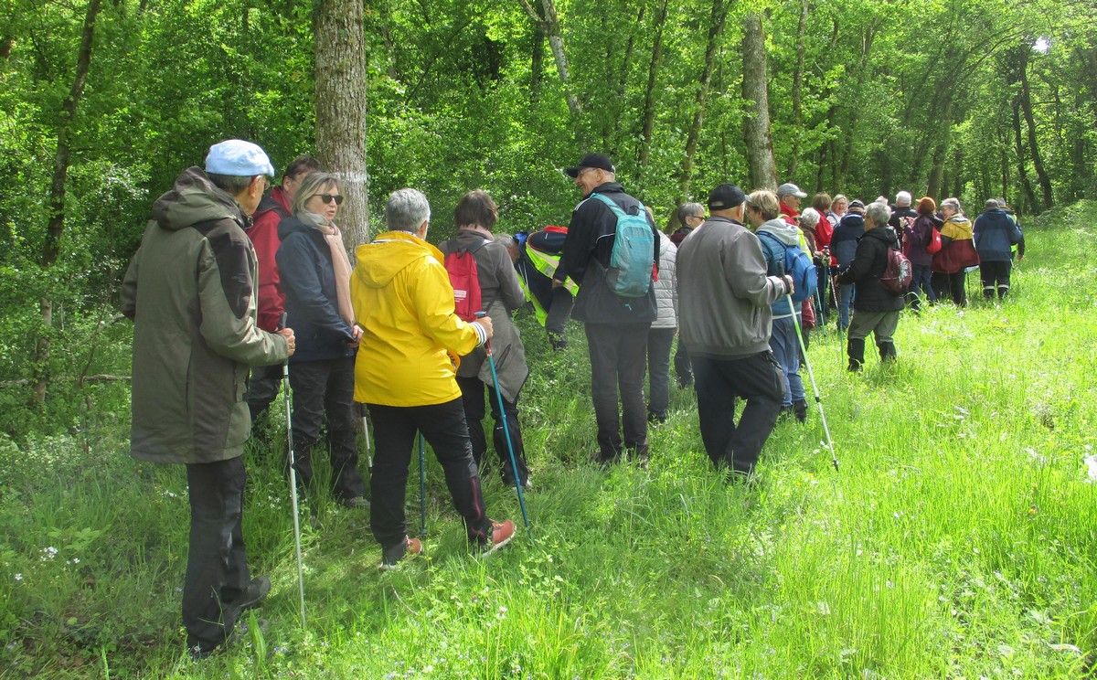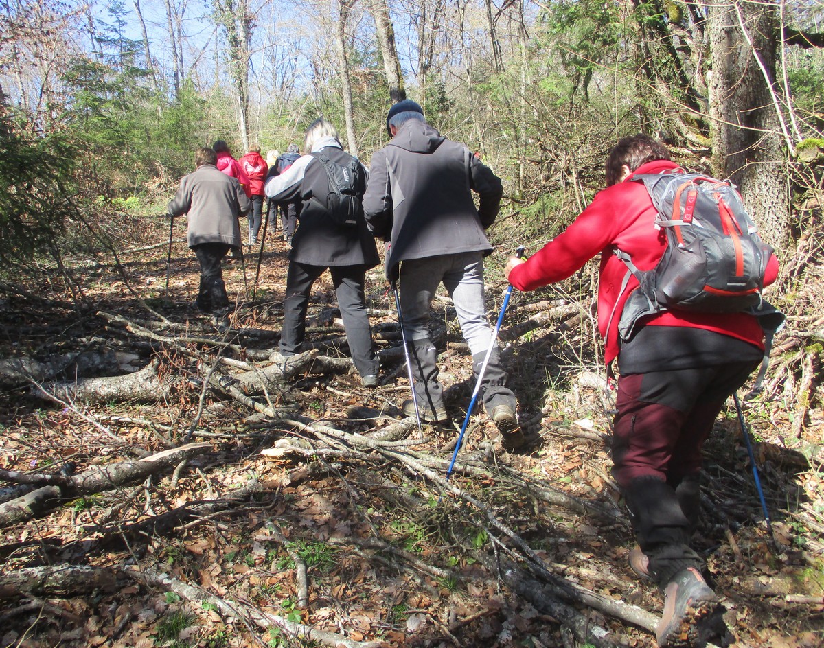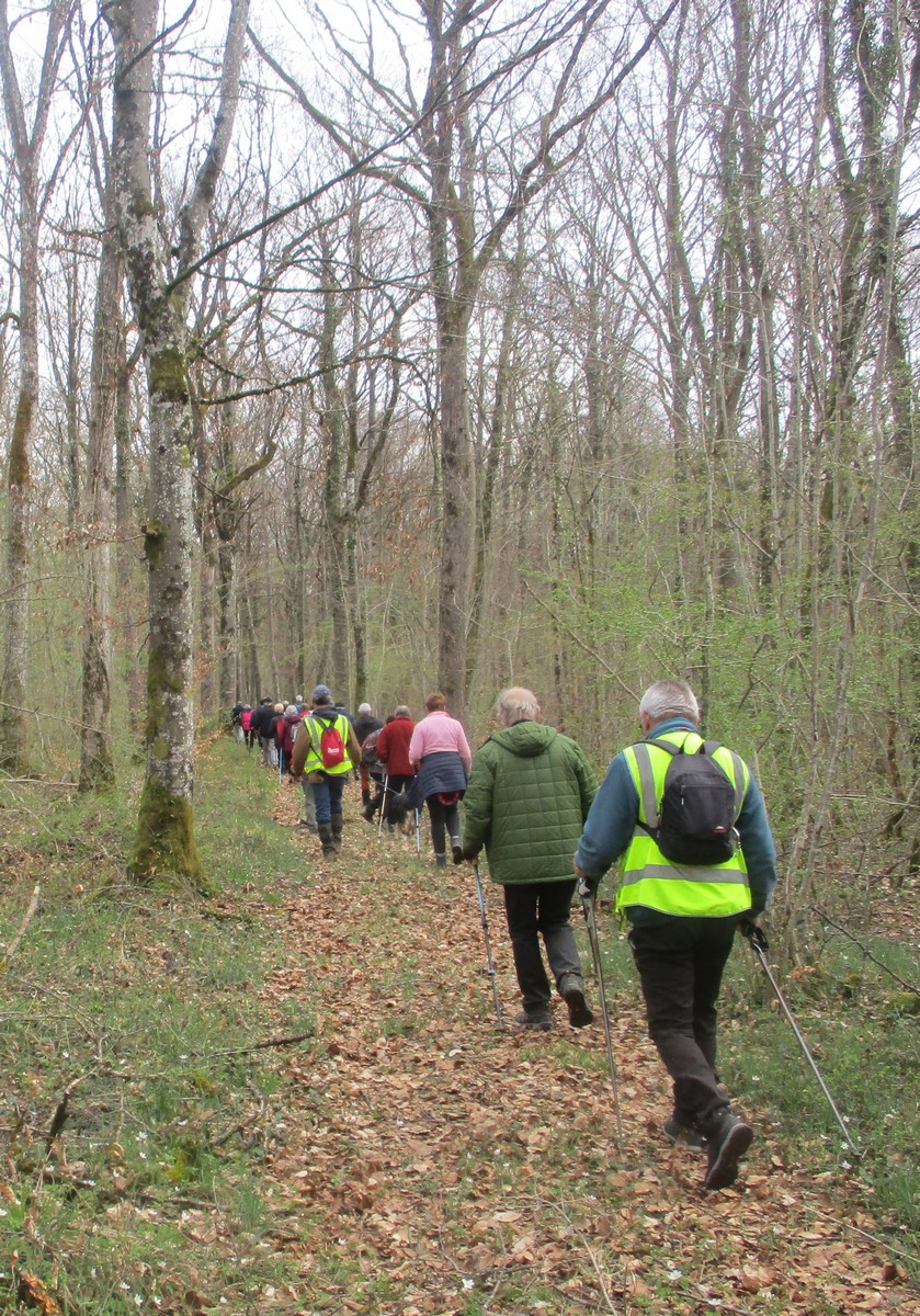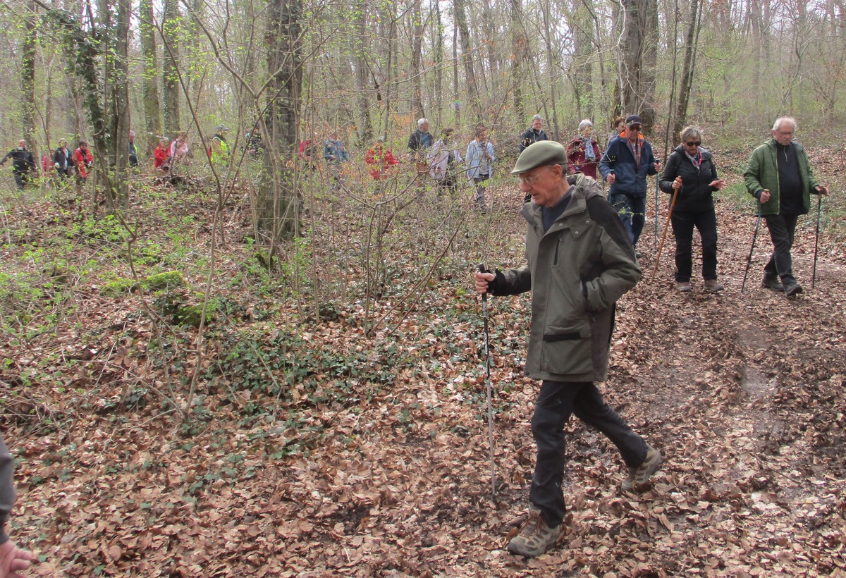 Aujourd’hui 11 avril, nous étions quasi 4 x 11 adhérents à s’être déplacés pour affronter le bois de Voisines. Tout d’abord, après avoir été soutenu par un troupeau de bovins, il a fallu monter pour rentrer dans la forêt. Un instant recueillement au Maquis, là où des jeunes résistants ont été fusillés par les allemands suite à dénonciation, avec récit de l’évènement raconté par Bernard. Puis ce fut le calvaire pour nos mollets qui ont dû enjamber les branches laissées sur place et qui obstruaient les chemins. On a réussi à faire une photo lors du passage du groupe dans une clairière. Mais nous avons eu quand même de la chance : pas de pluie, ciel nuageux avec de temps en temps un rayon de soleil.