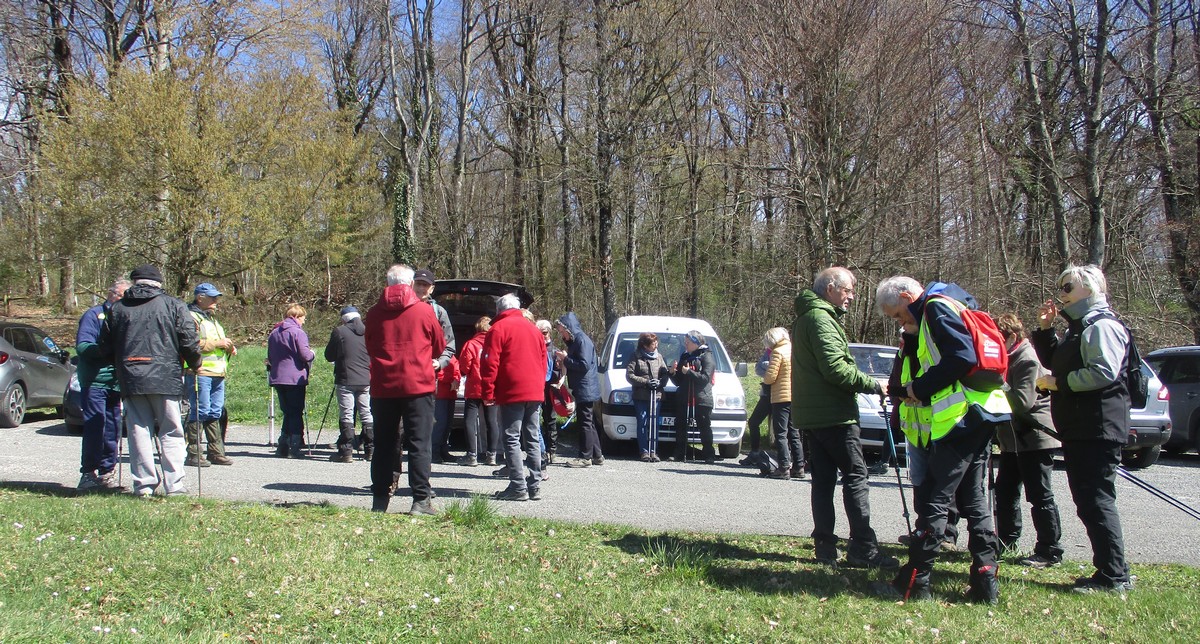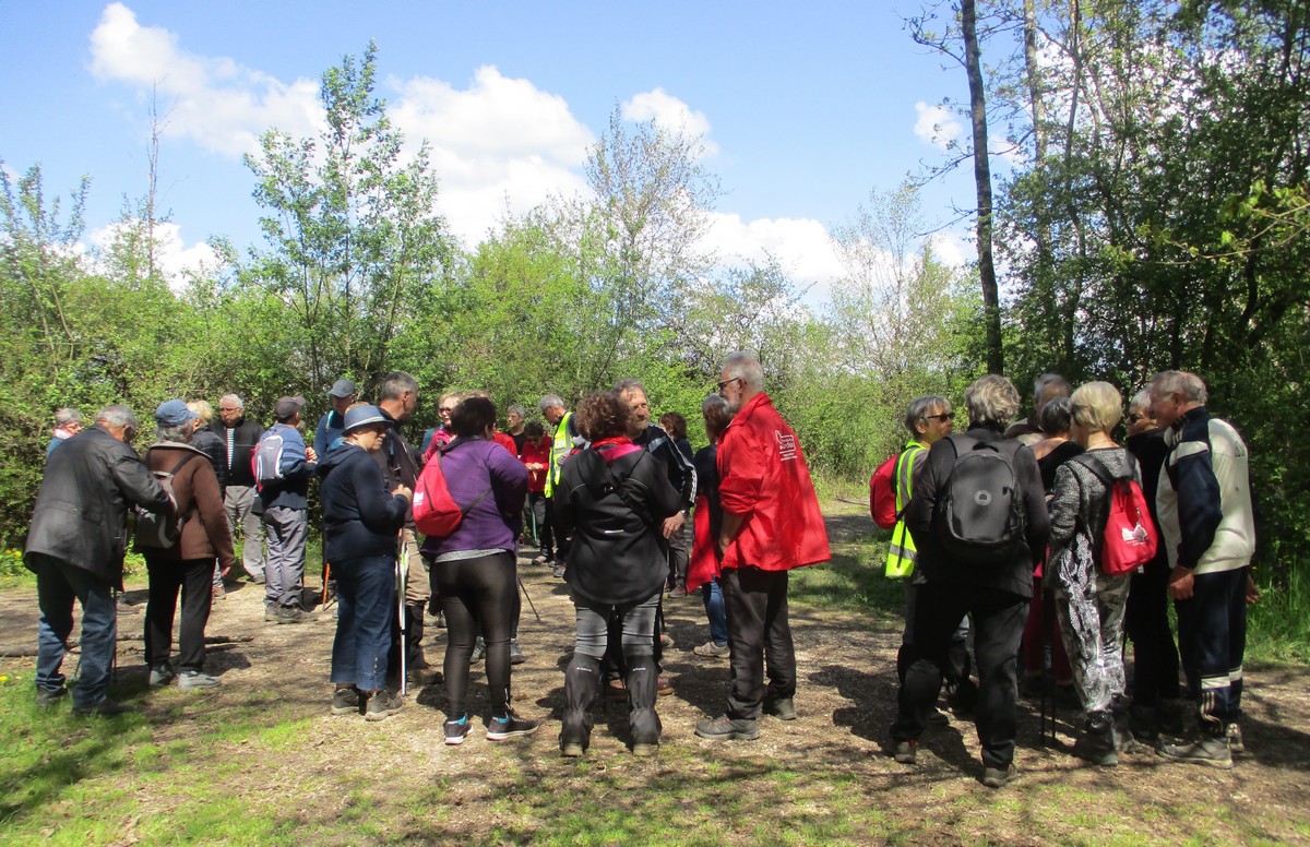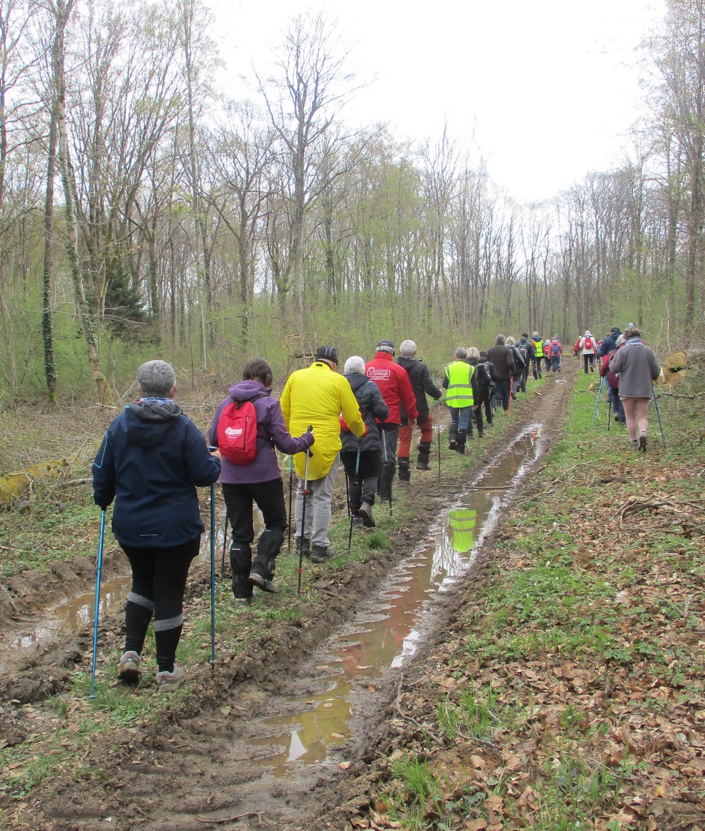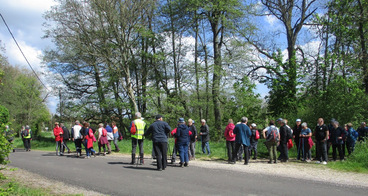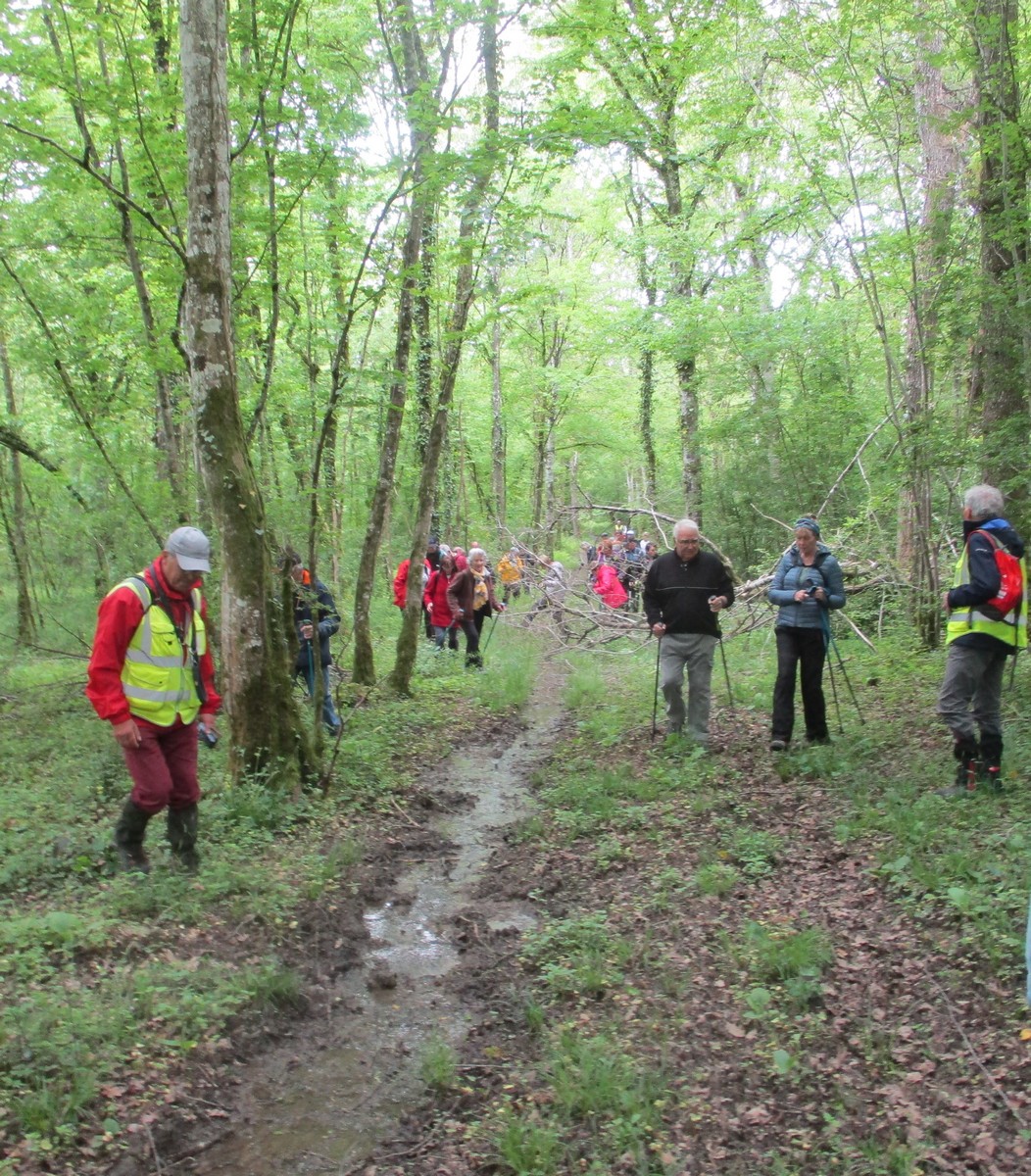 Aujourd’hui 11 avril, nous étions quasi 4 x 11 adhérents à s’être déplacés pour affronter le bois de Voisines. Tout d’abord, après avoir été soutenu par un troupeau de bovins, il a fallu monter pour rentrer dans la forêt. Un instant recueillement au Maquis, là où des jeunes résistants ont été fusillés par les allemands suite à dénonciation, avec récit de l’évènement raconté par Bernard. Puis ce fut le calvaire pour nos mollets qui ont dû enjamber les branches laissées sur place et qui obstruaient les chemins. On a réussi à faire une photo lors du passage du groupe dans une clairière. Mais nous avons eu quand même de la chance : pas de pluie, ciel nuageux avec de temps en temps un rayon de soleil.
