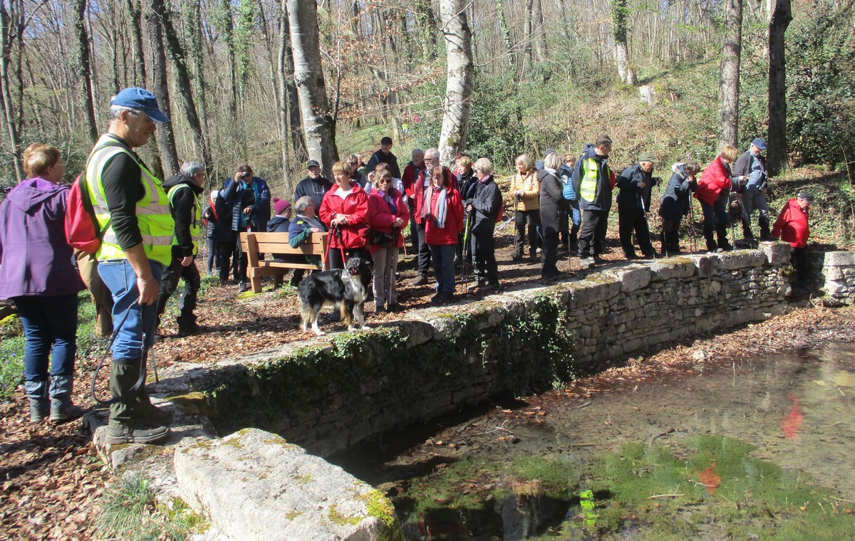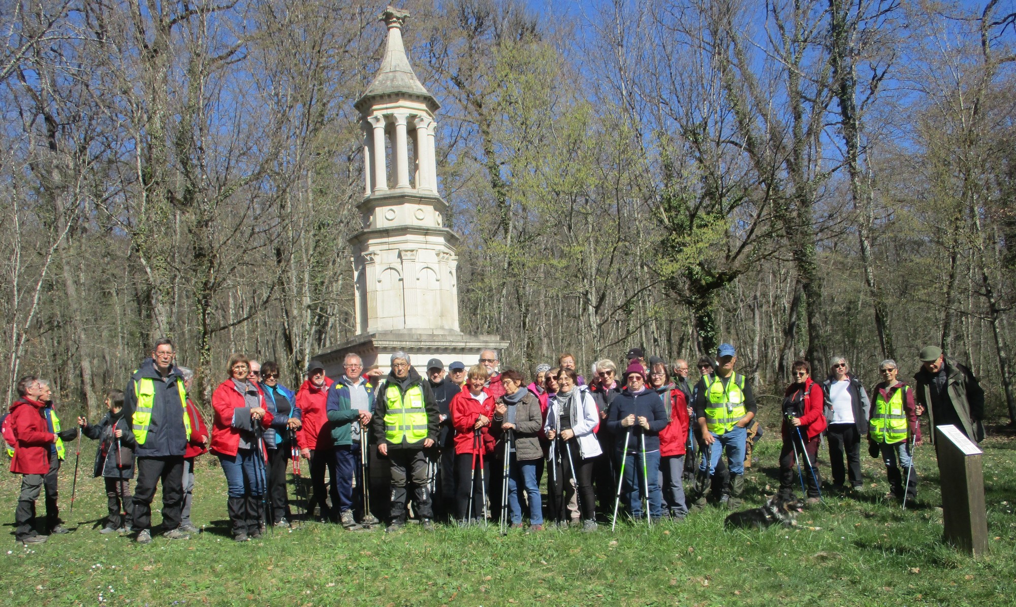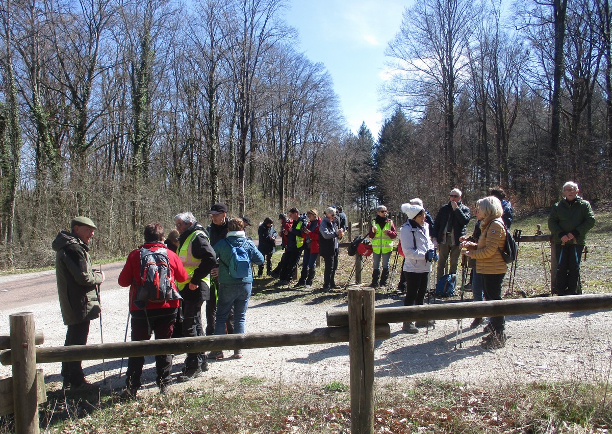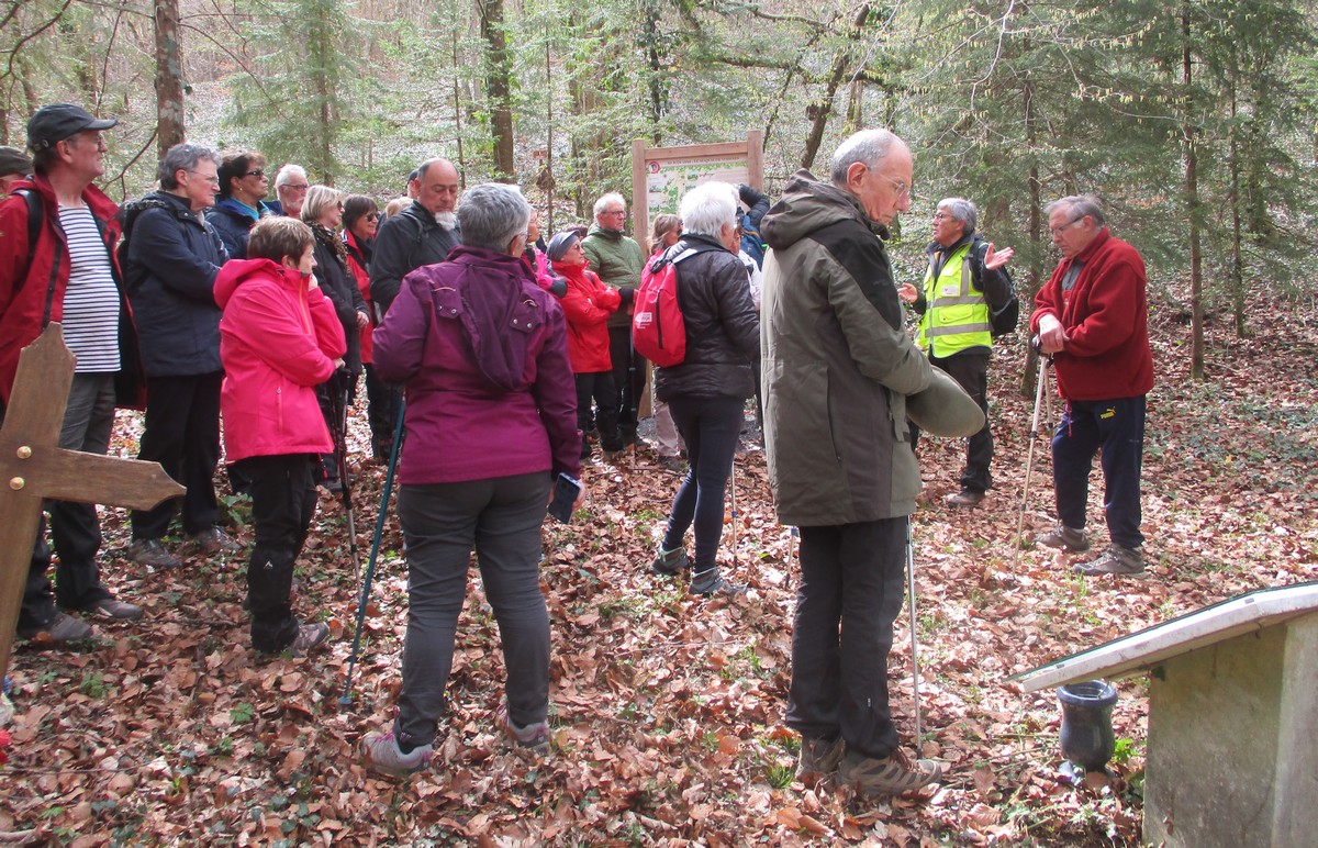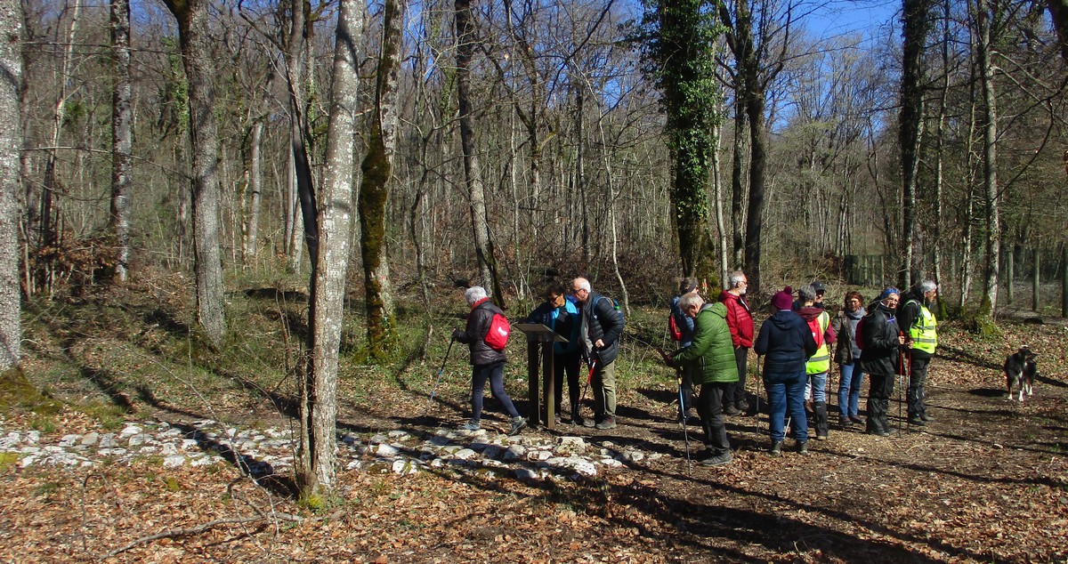 Quel bel après-midi ensoleillé, certes friquet en plein vent, mais doux en traversant le bois. Et du bois, on en a marché quasi les 7 kms du circuit. Circuit qu’il a fallu dévier pour longer un moment la route de Villiers/Suize car le chemin prévu était impraticable. Avant de rentrer de nouveau dans le bois, une pause et une photo s’impose ! Nous étions une petite quarantaine aujourd’hui à venir regarder d’abord la réplique du « Mausolée gallo-romain », ensuite descendre jusqu’à la « Source de la Demoiselle », remonter vers la « voie romaine » et enfin contourner les vestiges du Mausolée (du moins ce qu’il en reste).