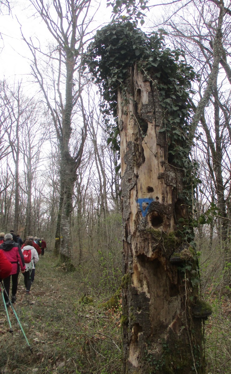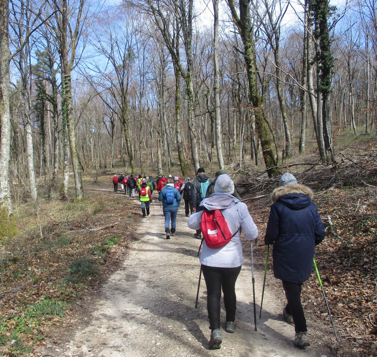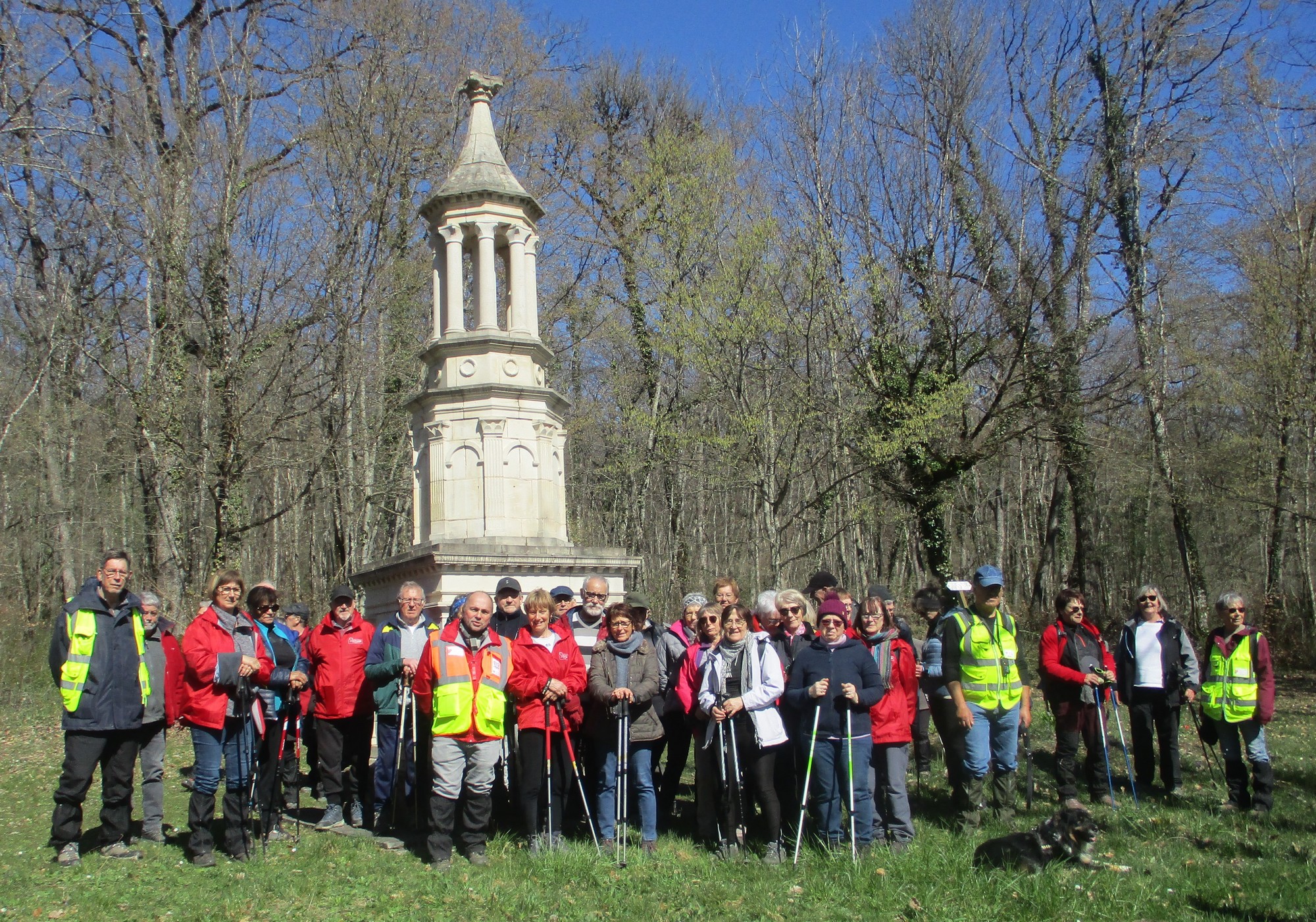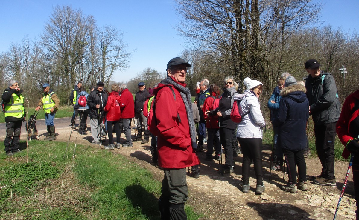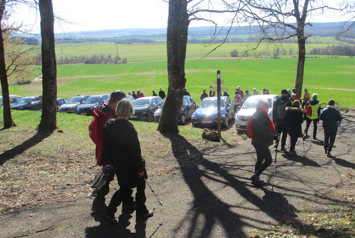 Quel bel après-midi ensoleillé, certes friquet en plein vent, mais doux en traversant le bois. Et du bois, on en a marché quasi les 7 kms du circuit. Circuit qu’il a fallu dévier pour longer un moment la route de Villiers/Suize car le chemin prévu était impraticable. Avant de rentrer de nouveau dans le bois, une pause et une photo s’impose ! Nous étions une petite quarantaine aujourd’hui à venir regarder d’abord la réplique du « Mausolée gallo-romain », ensuite descendre jusqu’à la « Source de la Demoiselle », remonter vers la « voie romaine » et enfin contourner les vestiges du Mausolée (du moins ce qu’il en reste).