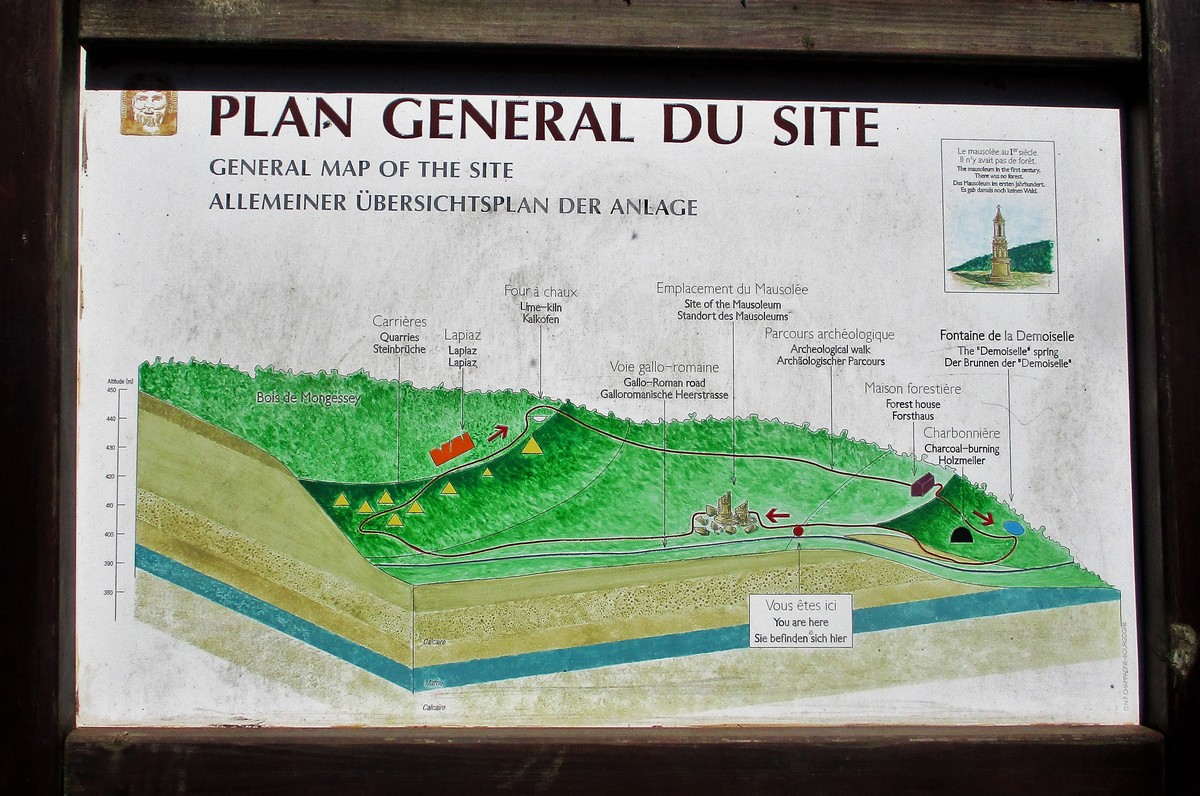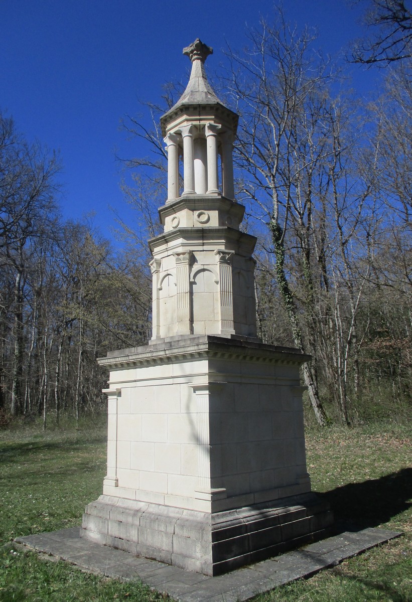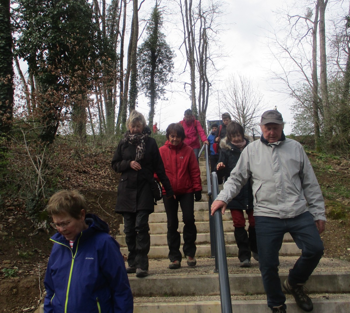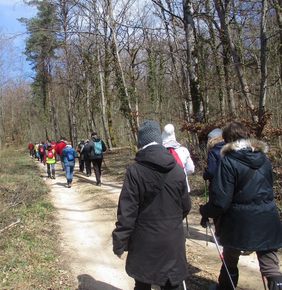 Quel bel après-midi ensoleillé, certes friquet en plein vent, mais doux en traversant le bois. Et du bois, on en a marché quasi les 7 kms du circuit. Circuit qu’il a fallu dévier pour longer un moment la route de Villiers/Suize car le chemin prévu était impraticable. Avant de rentrer de nouveau dans le bois, une pause et une photo s’impose ! Nous étions une petite quarantaine aujourd’hui à venir regarder d’abord la réplique du « Mausolée gallo-romain », ensuite descendre jusqu’à la « Source de la Demoiselle », remonter vers la « voie romaine » et enfin contourner les vestiges du Mausolée (du moins ce qu’il en reste).