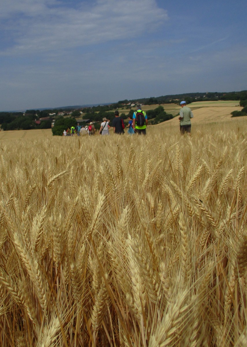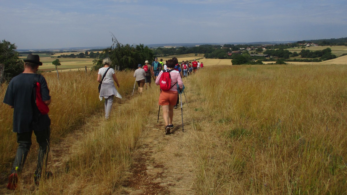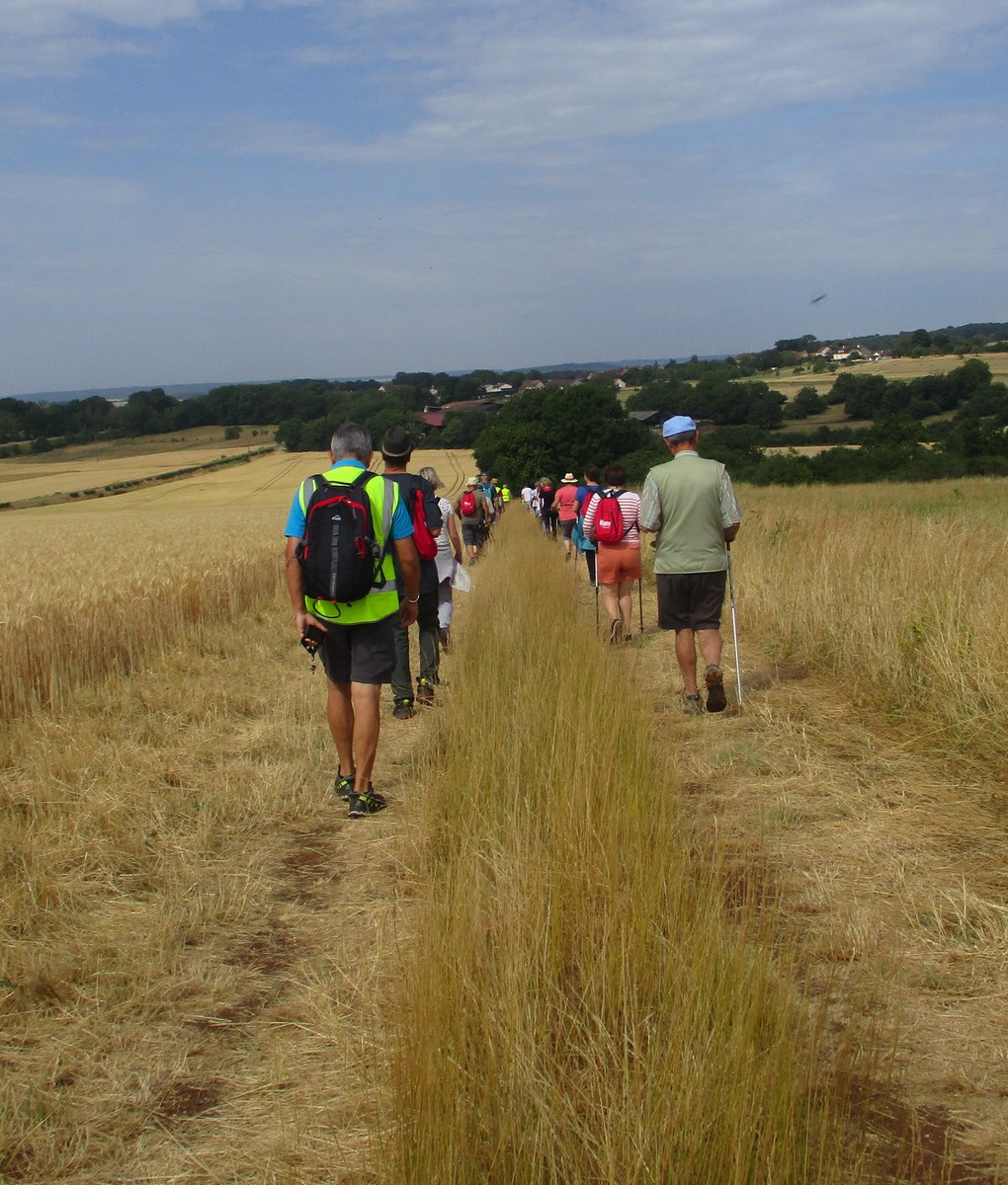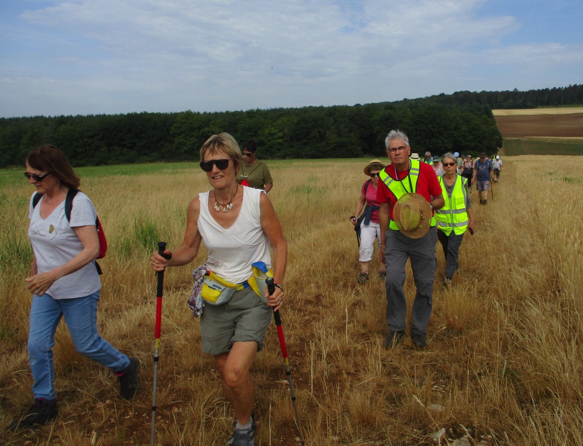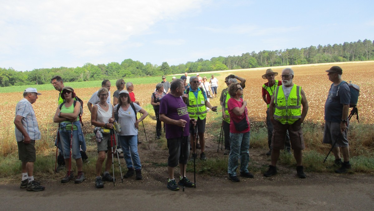 Après l’orage de dimanche et la pluie tombée la nuit dernière, le soleil était au rendez-vous et nous étions quand même une bonne trentaine valeureux marcheurs venus à Chassigny pour arpenter les alentours du village. Les champs de céréales jaunissent, bientôt la récolte et le ballet des moissonneuses et des remorques de graine ; c’est quand même de plus en plus tôt au fil des années. Pas de difficultés majeures, heureusement qu’il y avait des surfaces boisées pour nous rafraichir un peu. Les plus rapides du groupe fonçaient au risque de louper le chemin prévu ! On les a laissés partir devant pendant un moment avant de les rappeler, sinon jusqu’où allaient-ils ? Le coucou chante, les tournesols pointent le bout de leur fleur, un troupeau de moutons à tête noire est venu nous dire bonjour ainsi que des petits veaux enfermés dans leur box. Et nous voilà déjà de retour non sans avoir marauder en route.