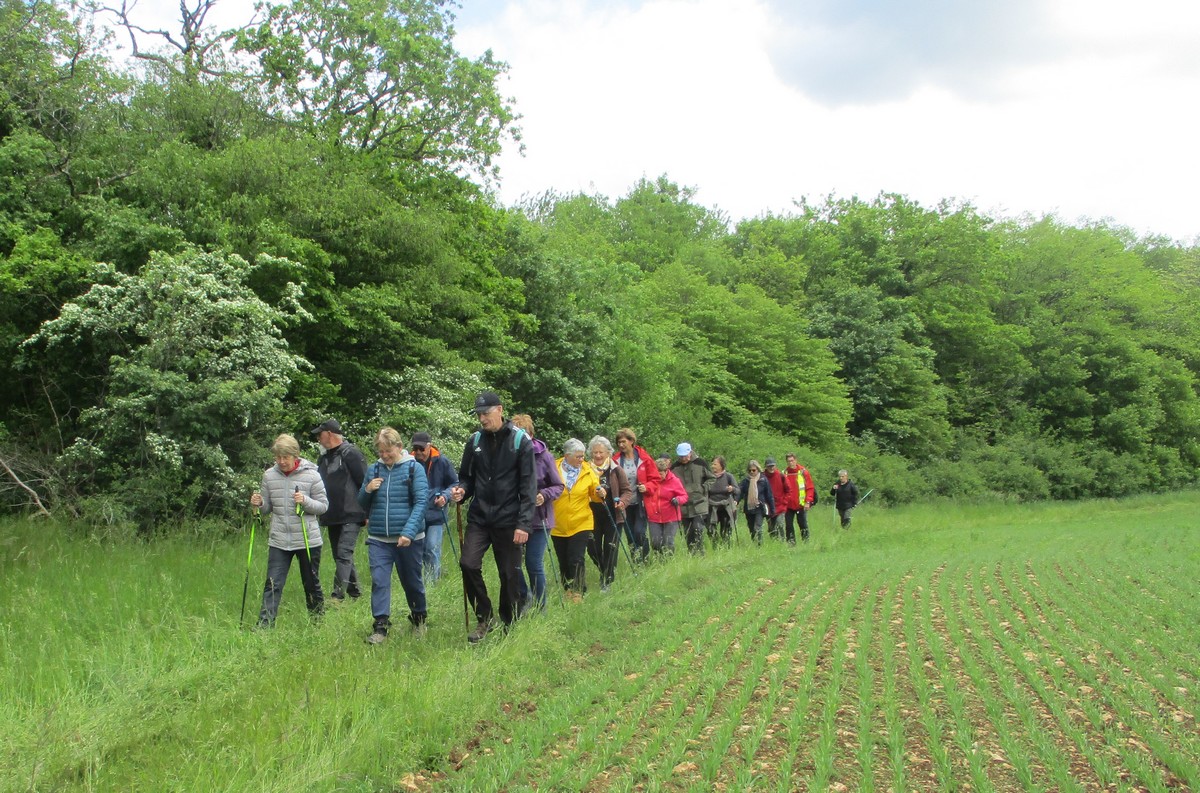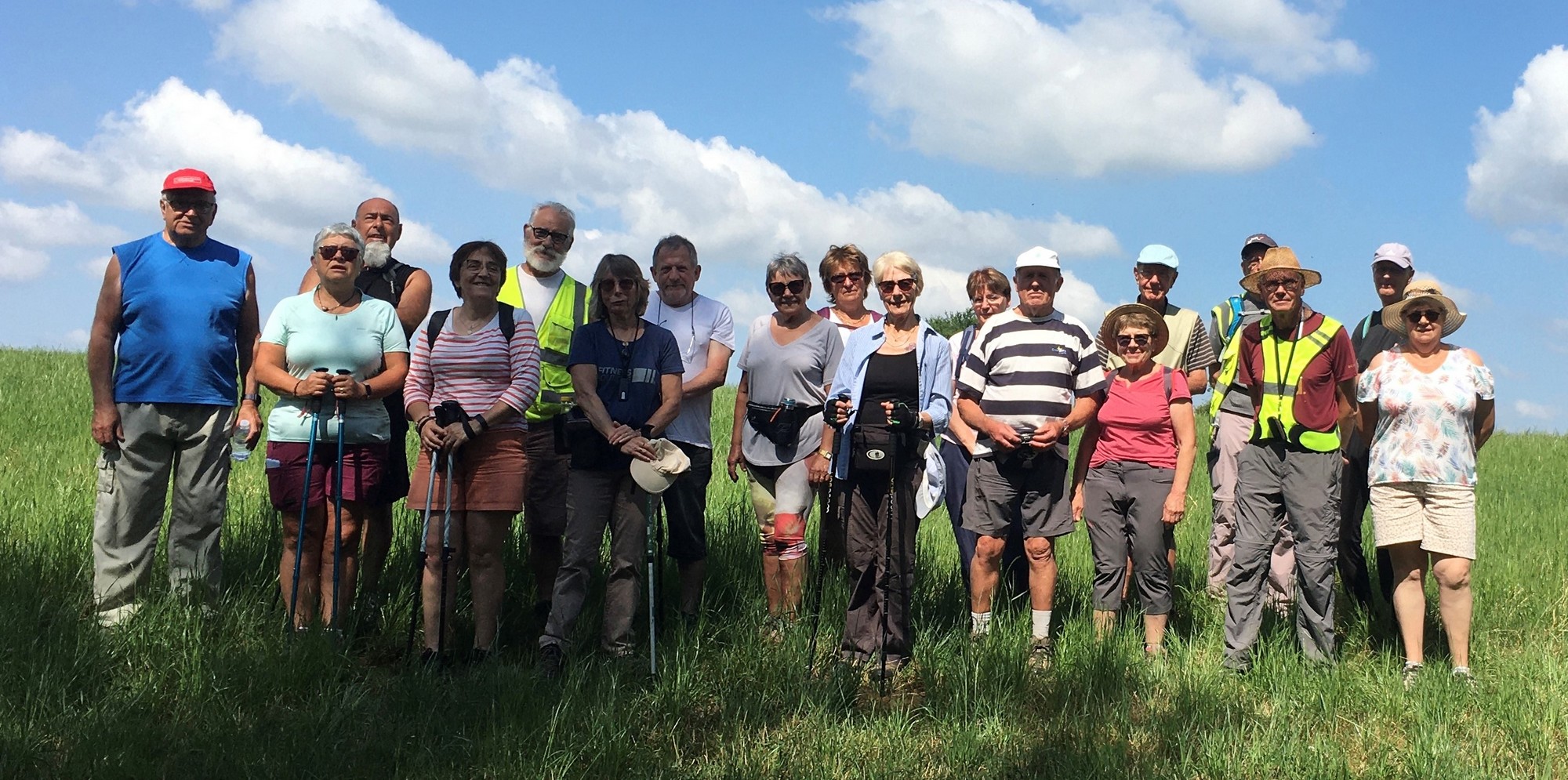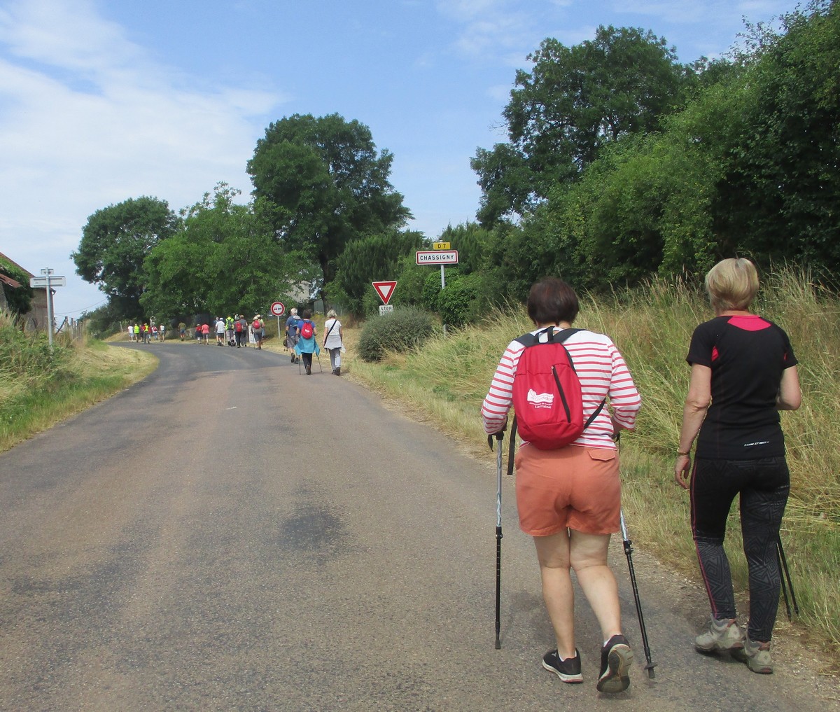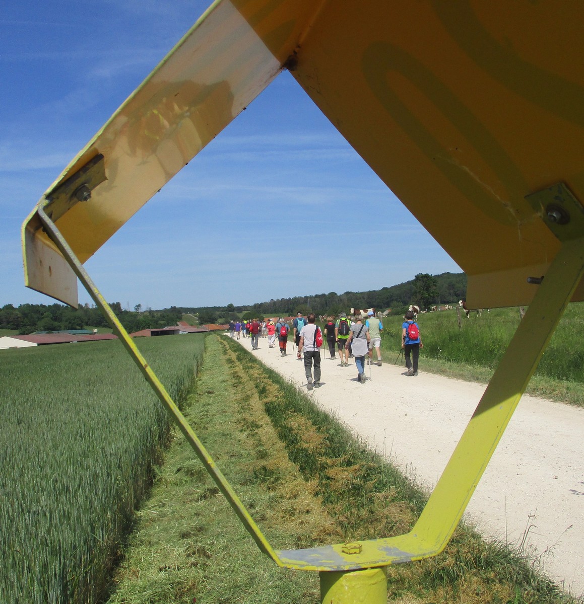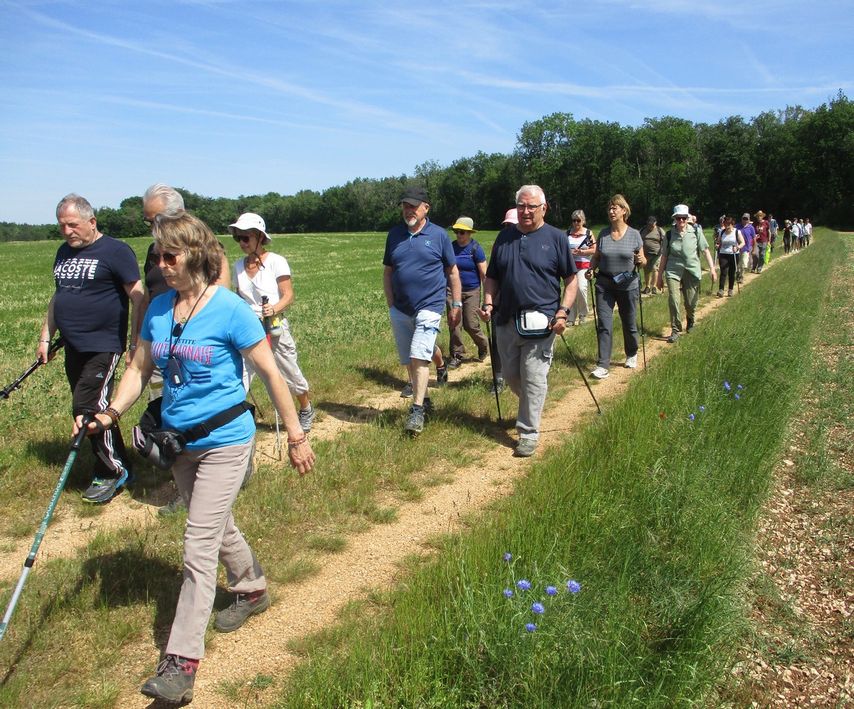 Après l’orage de dimanche et la pluie tombée la nuit dernière, le soleil était au rendez-vous et nous étions quand même une bonne trentaine valeureux marcheurs venus à Chassigny pour arpenter les alentours du village. Les champs de céréales jaunissent, bientôt la récolte et le ballet des moissonneuses et des remorques de graine ; c’est quand même de plus en plus tôt au fil des années. Pas de difficultés majeures, heureusement qu’il y avait des surfaces boisées pour nous rafraichir un peu. Les plus rapides du groupe fonçaient au risque de louper le chemin prévu ! On les a laissés partir devant pendant un moment avant de les rappeler, sinon jusqu’où allaient-ils ? Le coucou chante, les tournesols pointent le bout de leur fleur, un troupeau de moutons à tête noire est venu nous dire bonjour ainsi que des petits veaux enfermés dans leur box. Et nous voilà déjà de retour non sans avoir marauder en route.