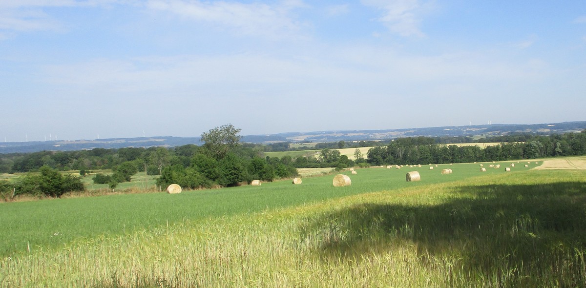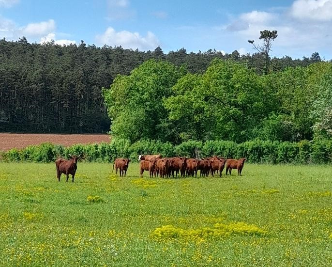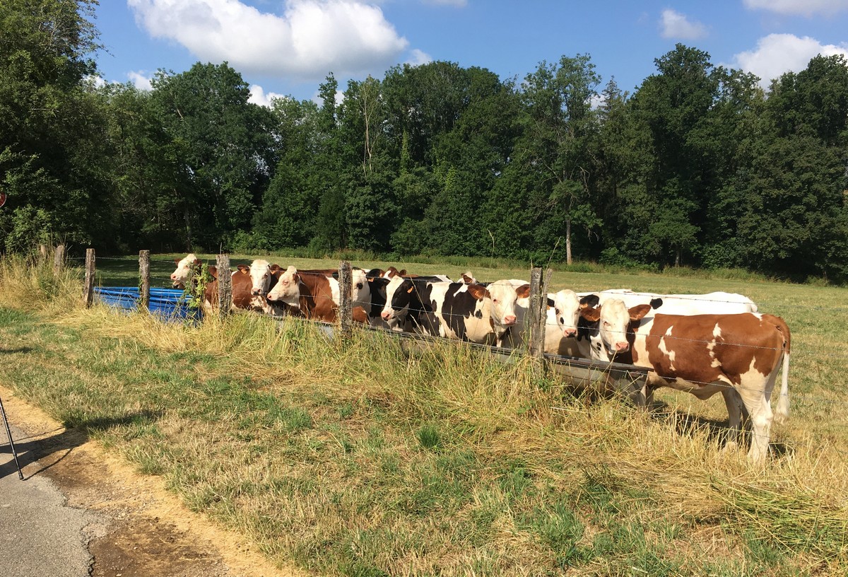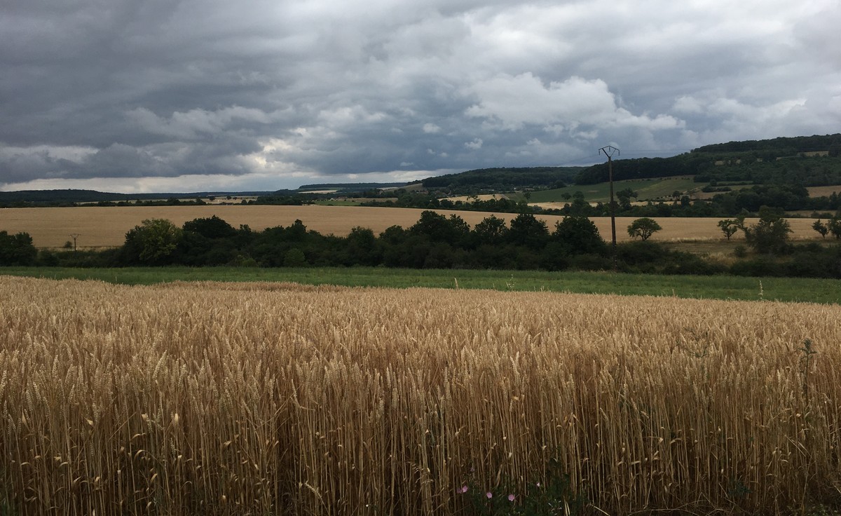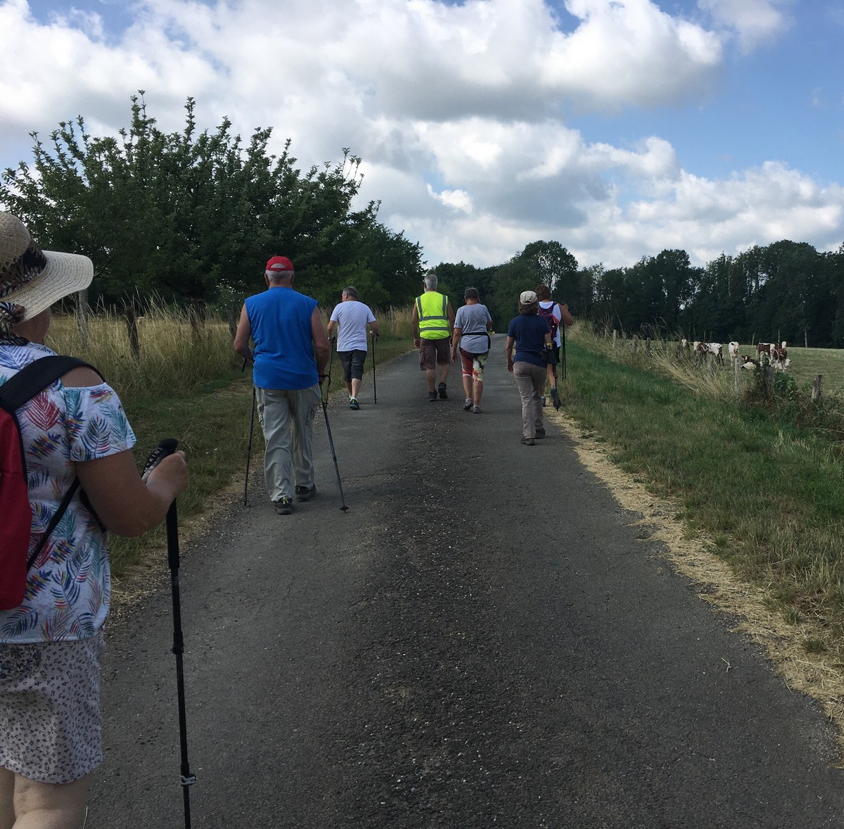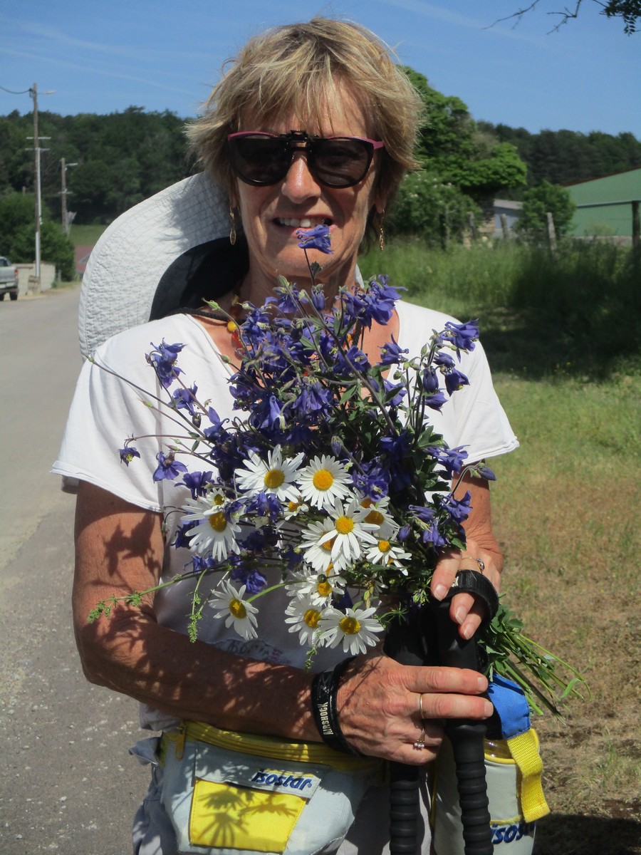 Après l’orage de dimanche et la pluie tombée la nuit dernière, le soleil était au rendez-vous et nous étions quand même une bonne trentaine valeureux marcheurs venus à Chassigny pour arpenter les alentours du village. Les champs de céréales jaunissent, bientôt la récolte et le ballet des moissonneuses et des remorques de graine ; c’est quand même de plus en plus tôt au fil des années. Pas de difficultés majeures, heureusement qu’il y avait des surfaces boisées pour nous rafraichir un peu. Les plus rapides du groupe fonçaient au risque de louper le chemin prévu ! On les a laissés partir devant pendant un moment avant de les rappeler, sinon jusqu’où allaient-ils ? Le coucou chante, les tournesols pointent le bout de leur fleur, un troupeau de moutons à tête noire est venu nous dire bonjour ainsi que des petits veaux enfermés dans leur box. Et nous voilà déjà de retour non sans avoir marauder en route.