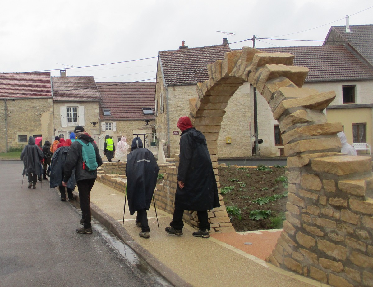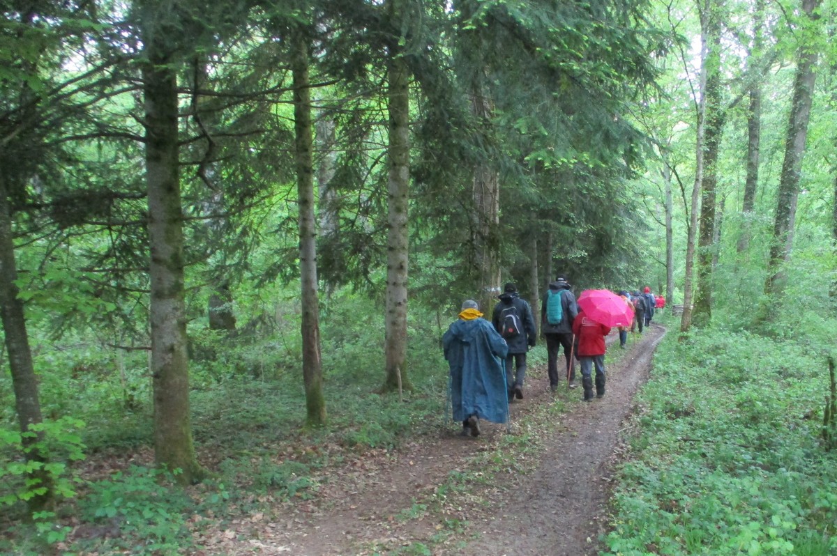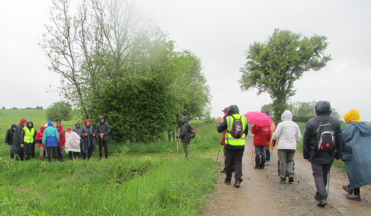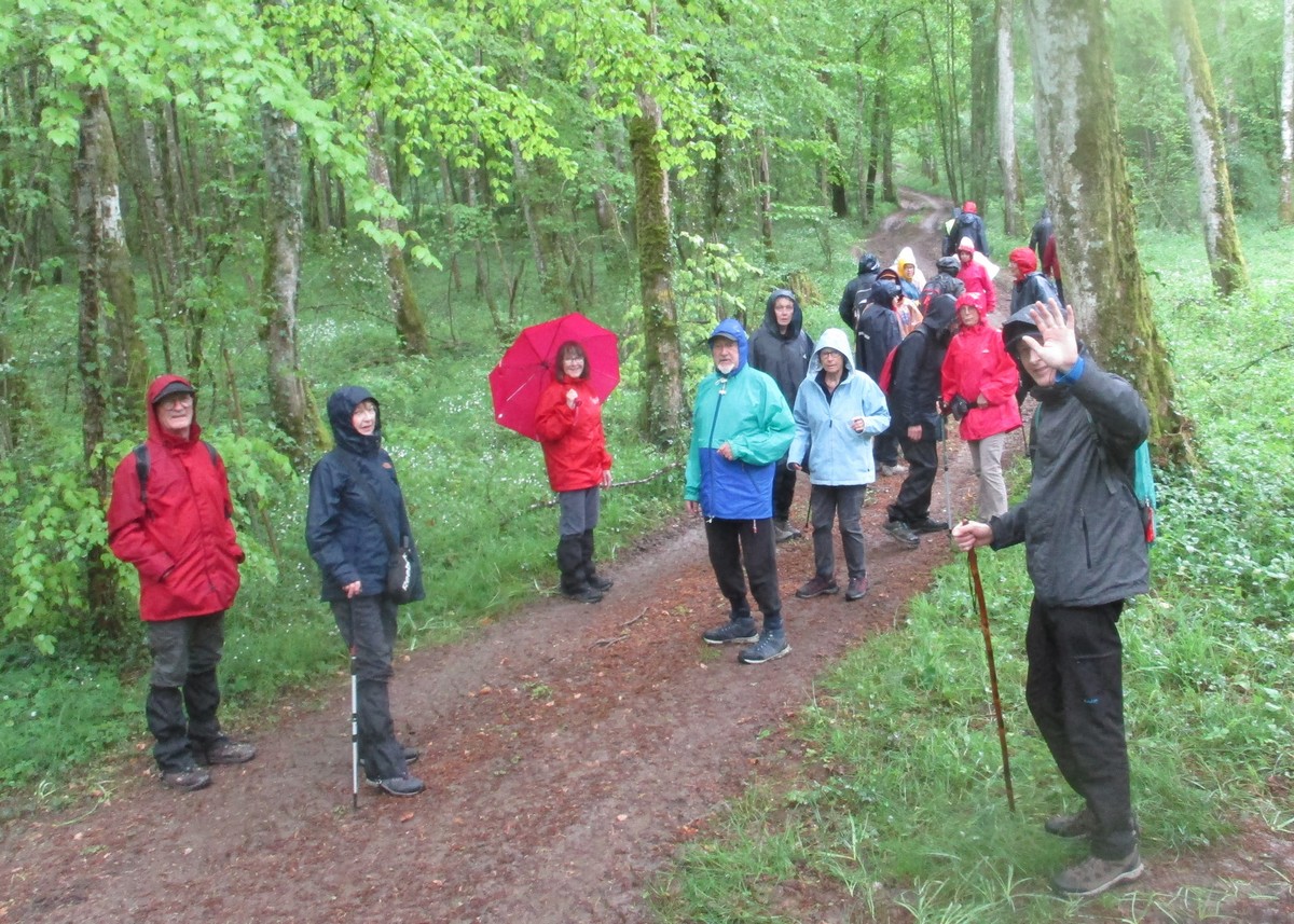 Quand on a vu le temps qu’il faisait en début d’après-midi ce mardi, certains ont abdiqué. Mais nous étions quand même 25 courageux à vouloir défier les éléments. Parapluies, kways, parkas et bobs (non, pas Bob) étaient de sortie pour nous abriter. Au départ, on a pu admirer le bel aménagement de la place avec notamment ses entrées rondement empierrées du plus bel effet. Vous pourrez vous amuser à déchiffrer l’épitaphe sculptée sur la pierre. Tout au long de la balade, une petite pluie n’a cessé de tomber sur nos épaules. La traversée du bois par des chemins gouillaceux s’est faite en essayant de ne pas glisser, au grand désespoir de certains qui n’attendent que ça. Retour sur le goudron, nous croisons un escargot heureux de se promener par ce mauvais temps. Arrivés au village, petite séance photo originale, il ne manquait que le soleil !