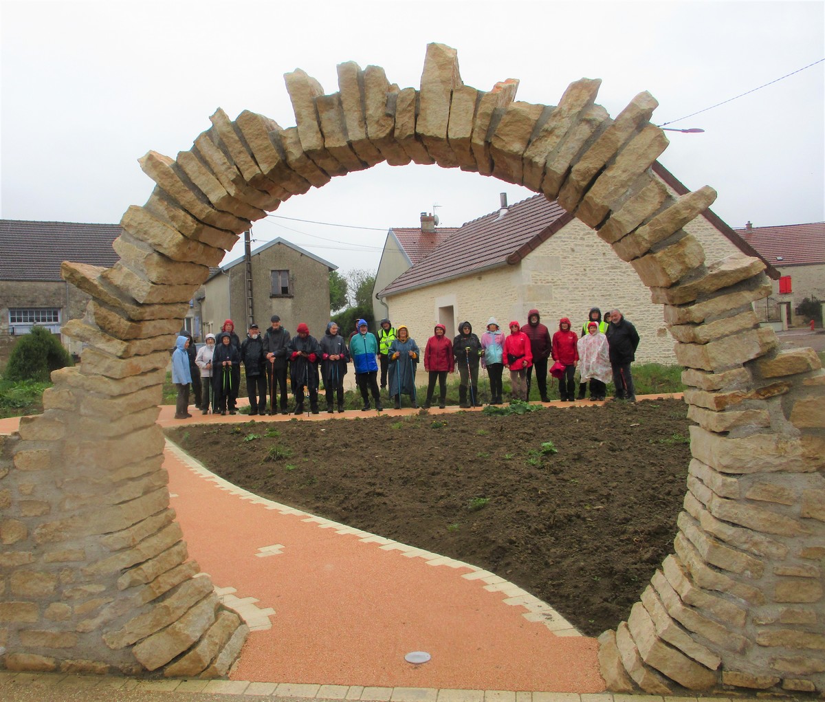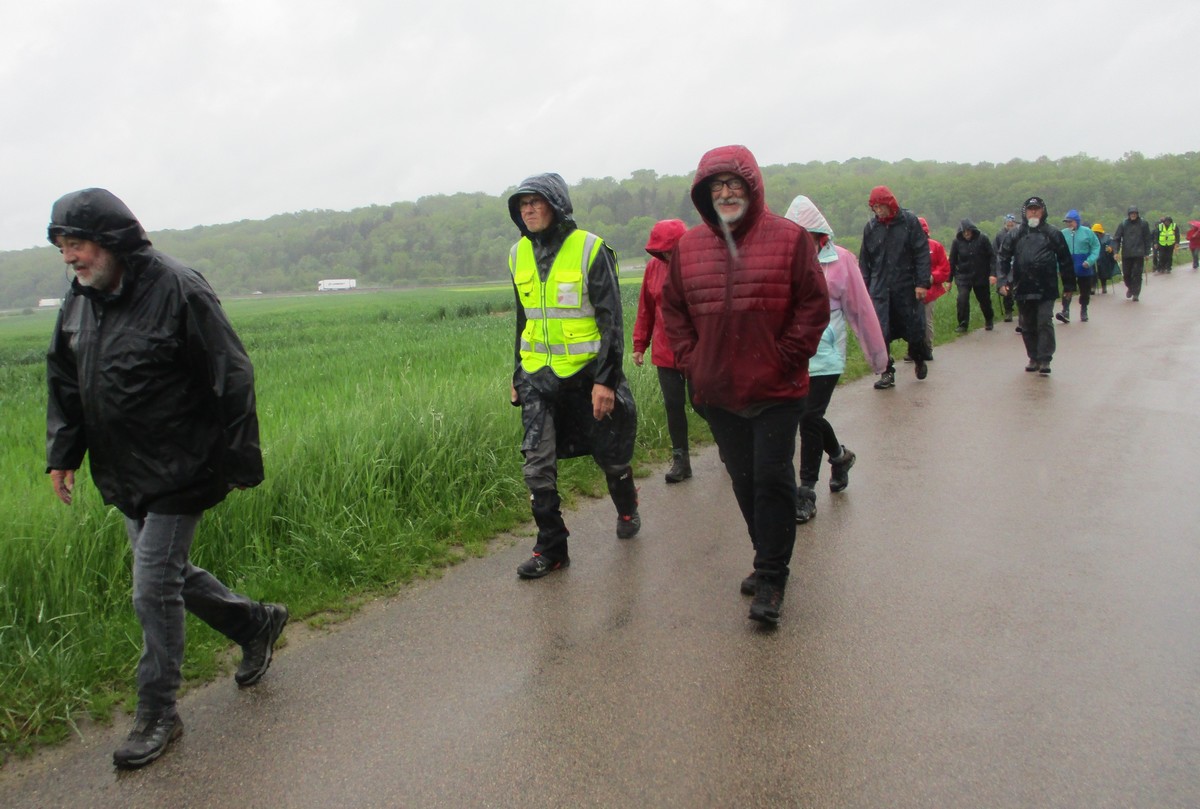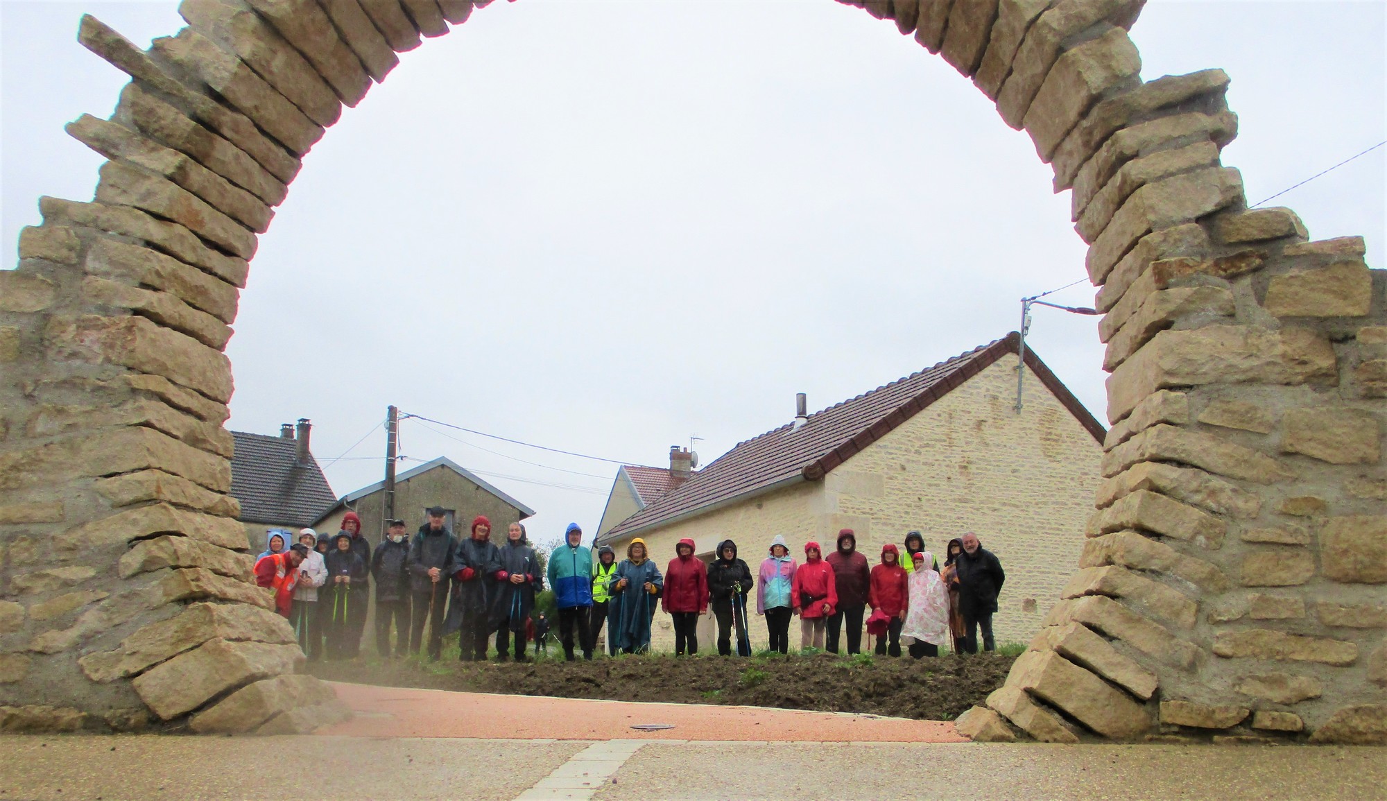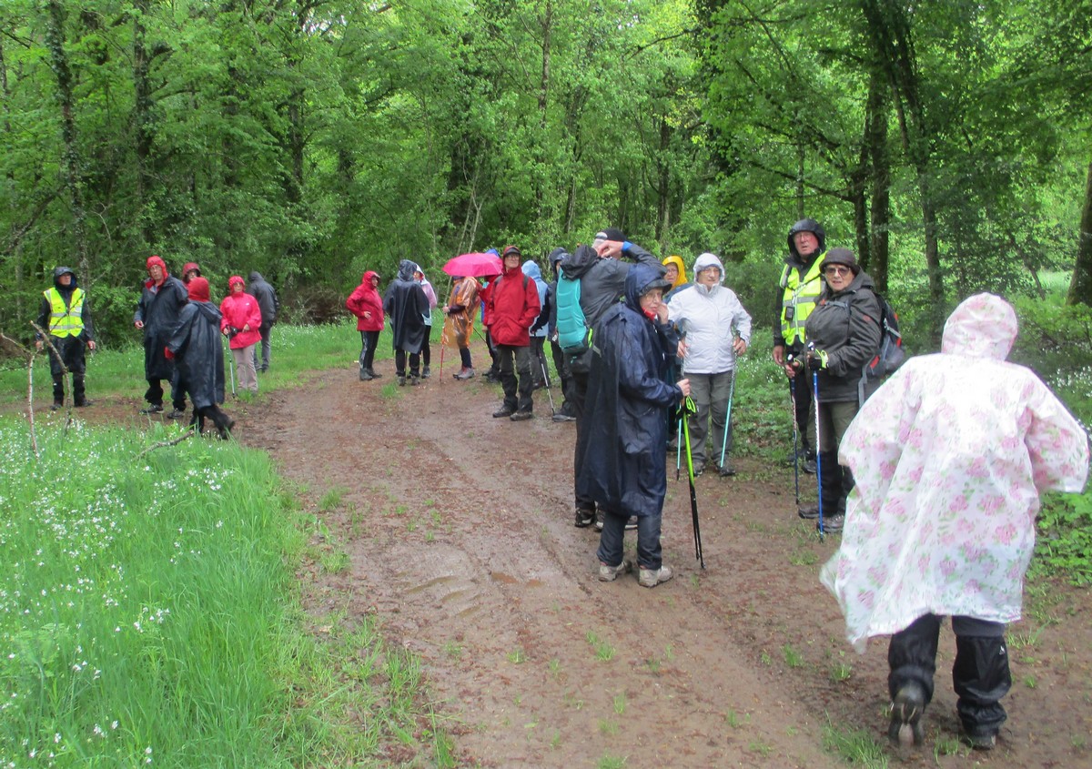Quand on a vu le temps qu’il faisait en début d’après-midi ce mardi, certains ont abdiqué. Mais nous étions quand même 25 courageux à vouloir défier les éléments. Parapluies, kways, parkas et bobs (non, pas Bob) étaient de sortie pour nous abriter. Au départ, on a pu admirer le bel aménagement de la place avec notamment ses entrées rondement empierrées du plus bel effet. Vous pourrez vous amuser à déchiffrer l’épitaphe sculptée sur la pierre. Tout au long de la balade, une petite pluie n’a cessé de tomber sur nos épaules. La traversée du bois par des chemins gouillaceux s’est faite en essayant de ne pas glisser, au grand désespoir de certains qui n’attendent que ça. Retour sur le goudron, nous croisons un escargot heureux de se promener par ce mauvais temps. Arrivés au village, petite séance photo originale, il ne manquait que le soleil !