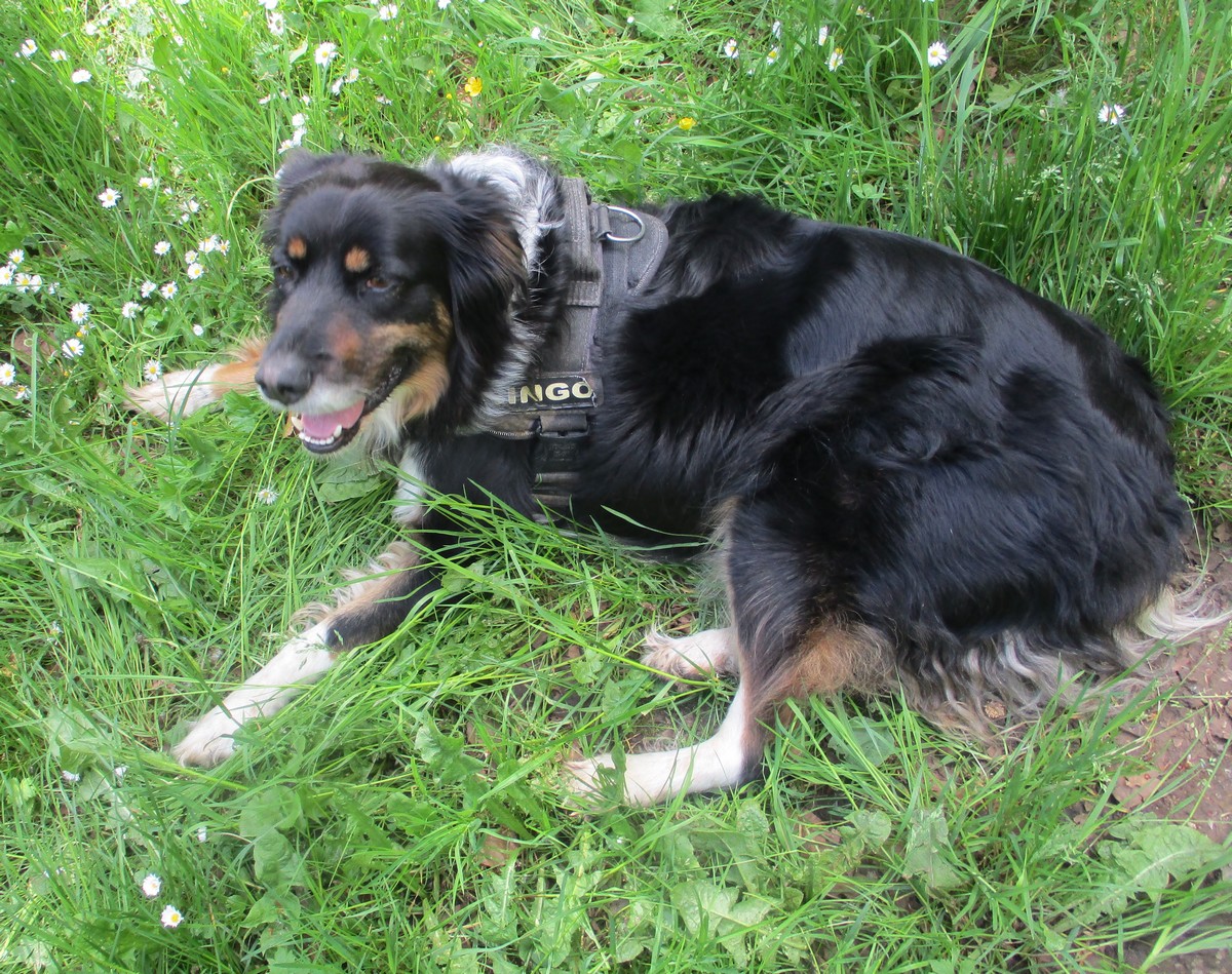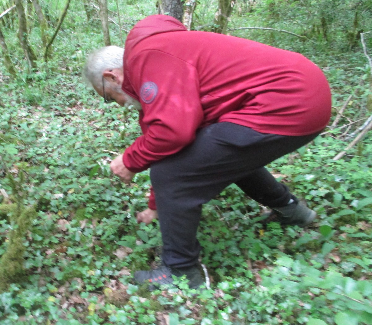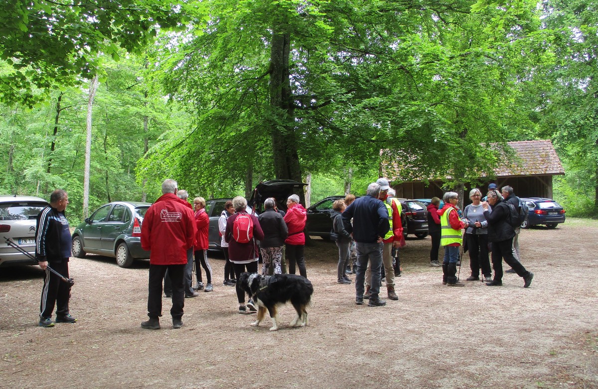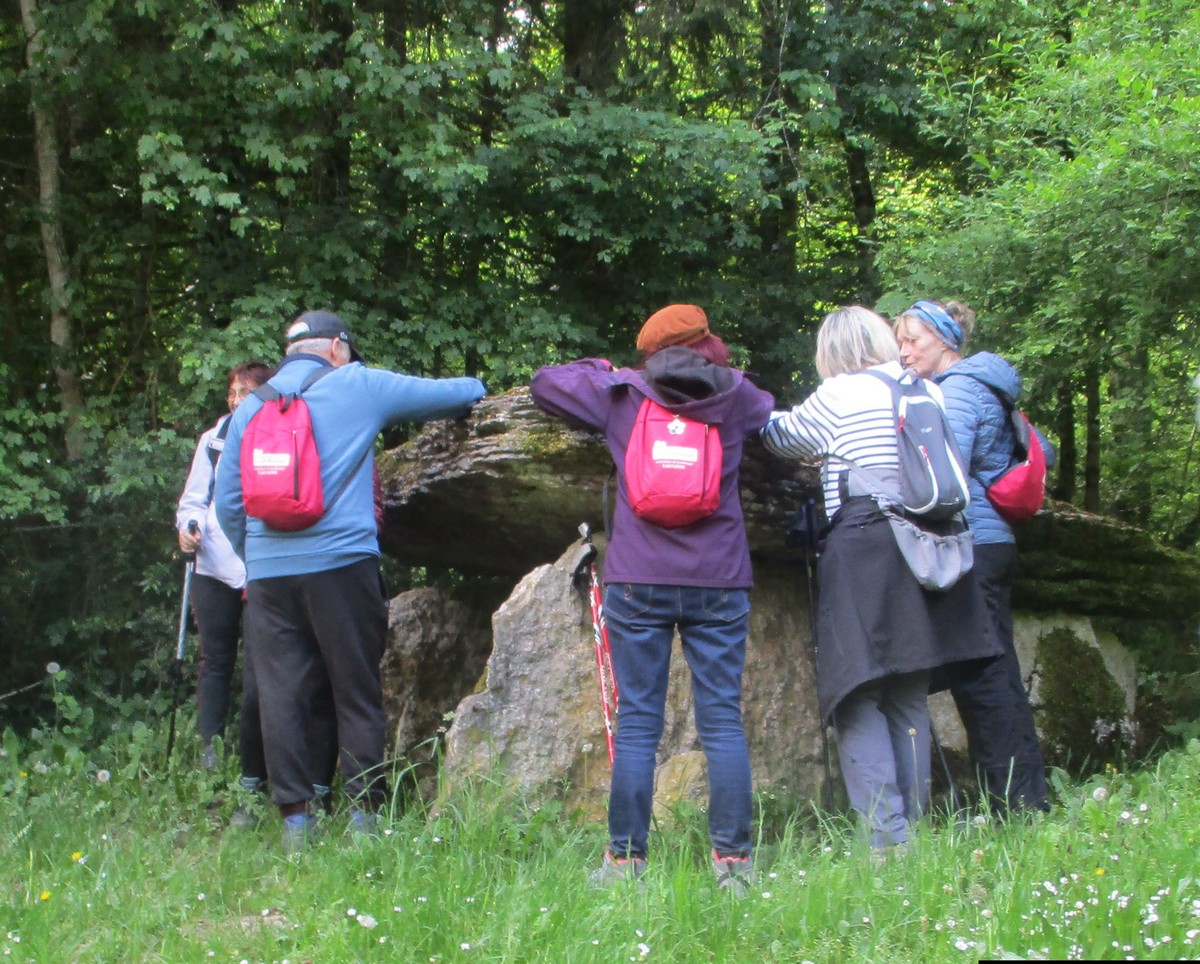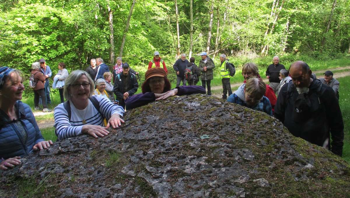 En ce mardi 16 mai où l’on fête Honoré, saint patron des boulangers, nous avions du pain sur la planche avec une marche de presque 7kms essentiellement dans les bois. Nous étions une petite quarantaine à venir dans le pays chaumontais pour découvrir ou redécouvrir le Dolmen de la Pierre Alot. Mais tout d’abord, nous traversons le hameau de Mauvaignant où nous pouvons apercevoir un cerisier original en forme de cœur … c’est beau l’amour ! Nous entamons ensuite la traversée du bois avec ses embuches (branches tombées en travers du chemin et terrain boueux par endroits). Mais certains se sont adonnés à cueillir quelques brins de muguet. L’ail des ours est en fleurs. Au moment de traverser la route menant à Nogent, un bon samaritain aidait certains et certaines à remonter du fossé. Arrivé au pied du Dolmen, quelques-uns ont apposé leurs mains afin d’essayer de communiquer avec les ancêtres gaulois !!! On attend la réponse ! Pendant ce temps-là, Bingo en profitait pour se reposer un peu.