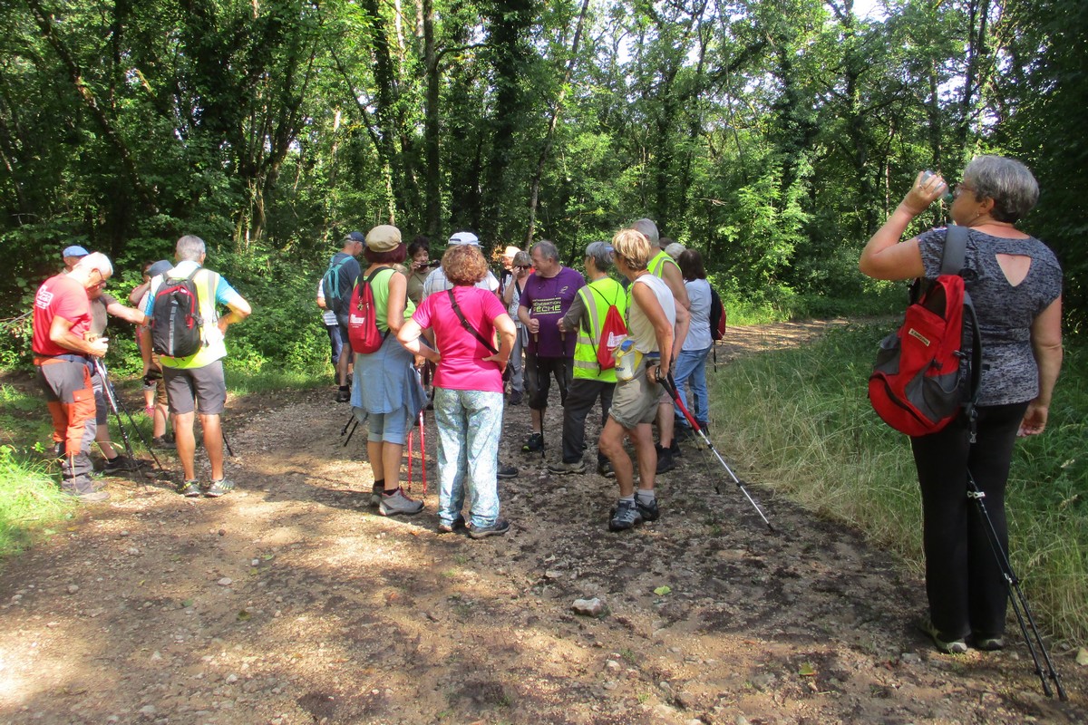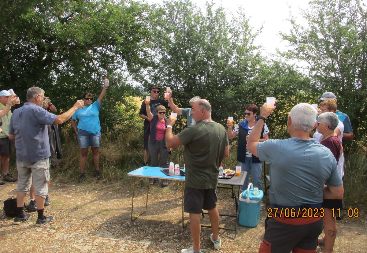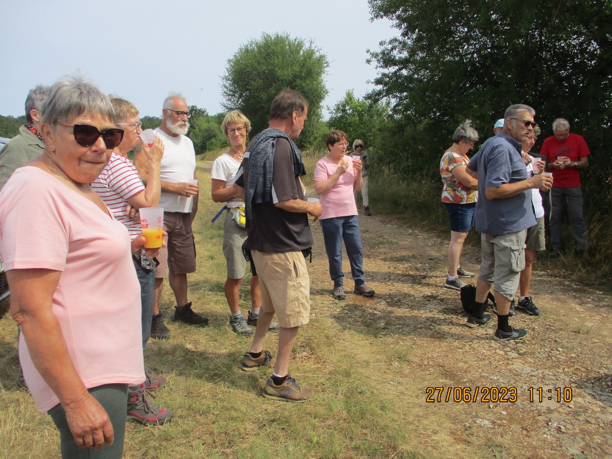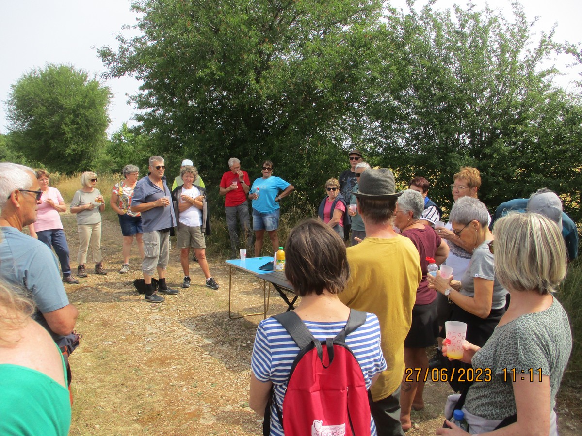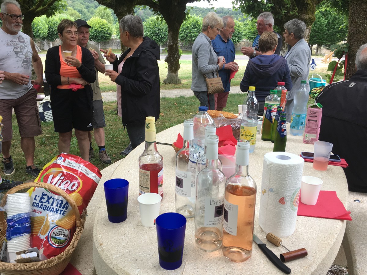 Et nous voilà ce mardi à Marac et plus précisément aux abords de l’étang de Chenot. C’est un parcours largement ombragé qui a satisfait la bonne trentaine de marcheurs venus à la dernière marche de la saison. La température est supportable, rien à voir avec celle des jours d’avant. Mais en arrivant au pied de l’étang, quelle n’est pas notre surprise de voir qu’il n’y a quasi plus d’eau. On aperçoit même des moules géantes jonchant le sol aride. Une dernière photo de groupe et nous remontons jusqu’à nos voitures où Nelly a dressé la table pour nous offrir une petite collation pour arroser cette fin d’année du club. Et on a trinqué en se souhaitant de bonnes vacances en attendant de se retrouver en septembre.